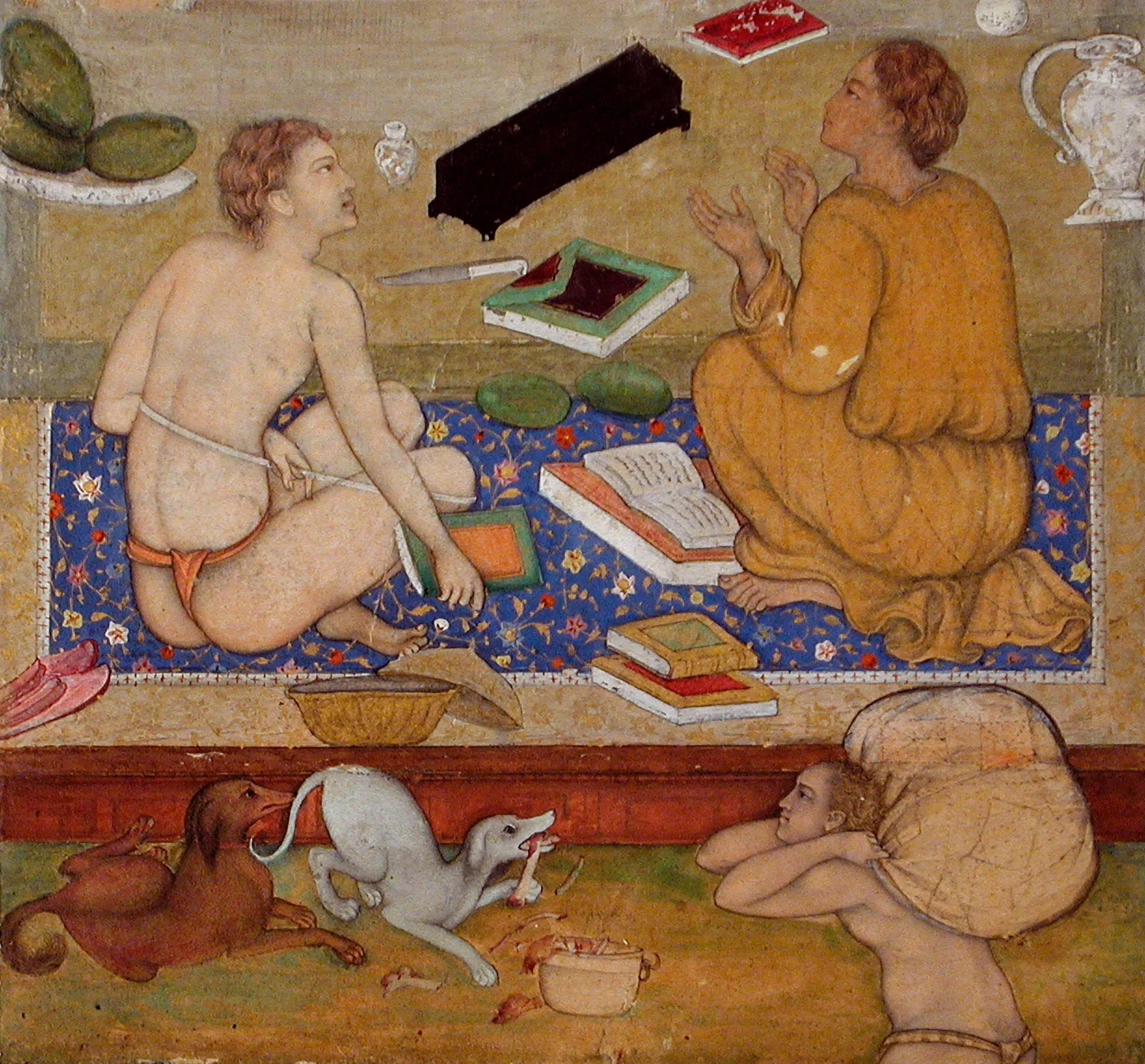- Opaque watercolor, gold, and ink on paper