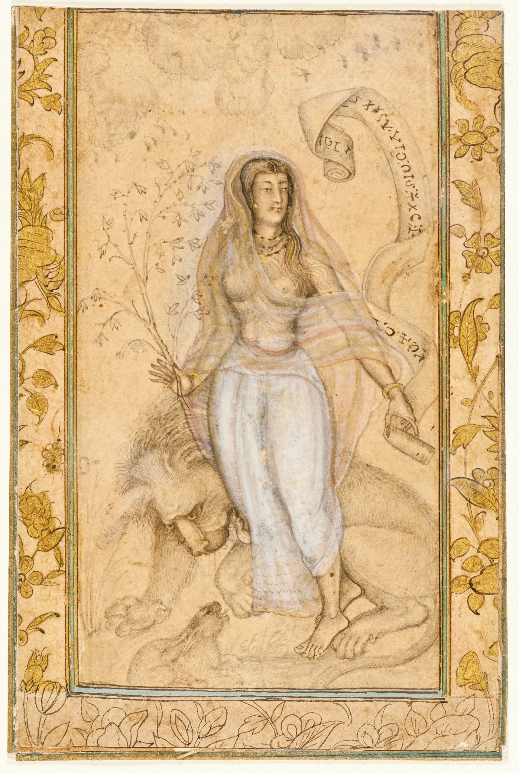 The Mughal interest in figural studies adapted from Western prints is well documented. This allegorical figure was likely inspired by European prints personifying various virtues. Milo C. Beach and Pratapaditya Pal have suggested that it was modelled on an engraving of Eve by the German artist Jacob Binck (1500-1569). Additional iconographic models may be even more apropos, such as The Personification of Fortitude by Marco da Ravenna (1475-1527) or Fortitude by Hans Sebald Beham (1500-1550). Regardless of its ultimate source(s), this diminutive drawing and a few related images by Basawan and/or his son Manohar represent a creative combination of diverse iconographic elements rather than a straight copying of foreign works. Landscapes and accompanying figures are often reworked, and handheld attributes are mixed-and-matched between the hybrid compositions.