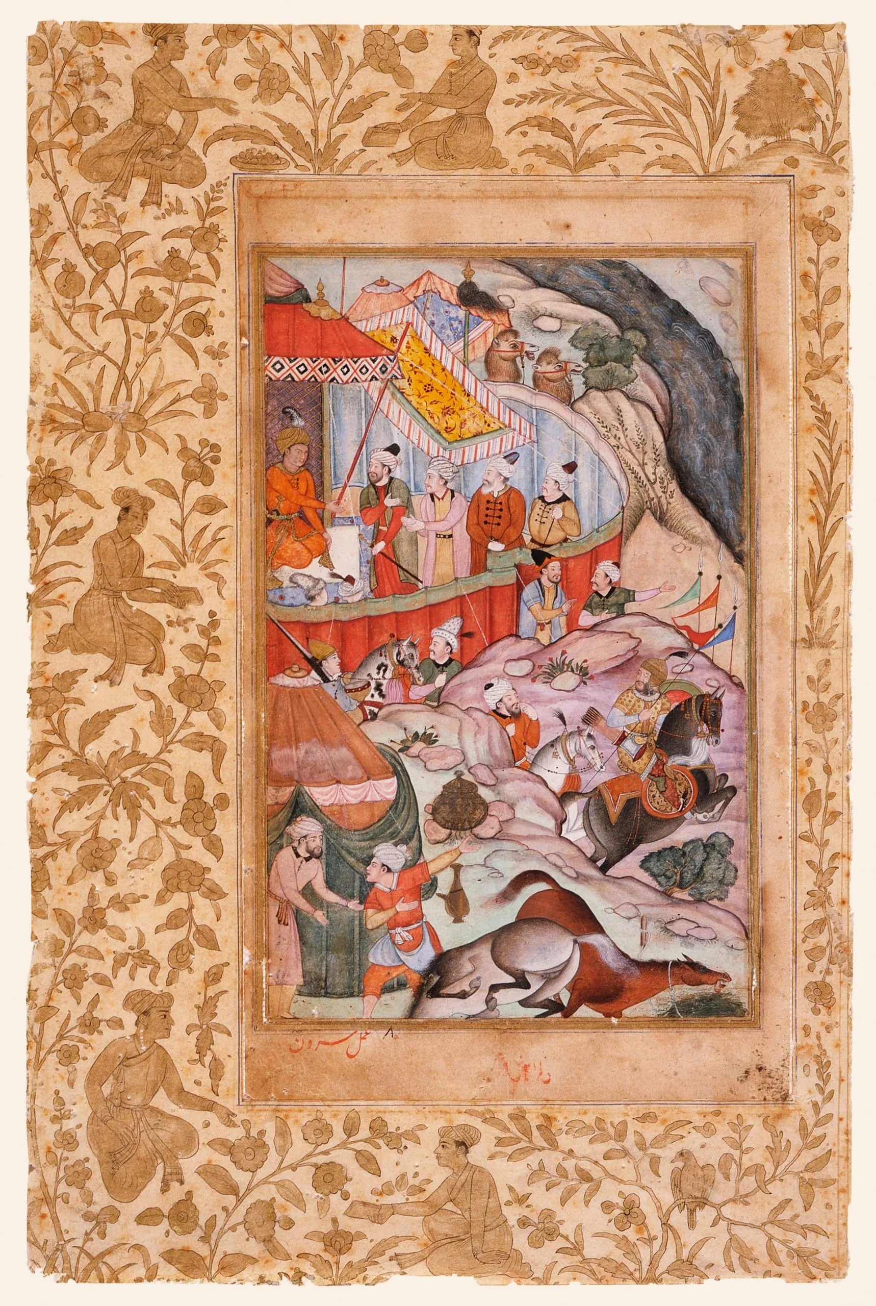 This folio is the left half of a double-page illumination. The facing composition on the right-hand page cannot now be traced. The episode illustrated occurred in June 1494 in Kuva (or Qaba) in Fergana province, which is in present-day eastern Uzbekistan. While crossing an overcrowded bridge many horses and camels were pushed over the side and perished in the water. At the same time an epidemic of distemper, possibly Strangles, broke out among the thronged horses, who fell in masses and died. Two of the dead horses are depicted at the bottom of the painting. Beside the horses is a small kitchen tent with a covered pot on a campfire and a wine or water flask. In the middle ground a armored warrior on a charging steed and a perplexed man on horseback are heading towards the river shown in the upper right corner. In the upper left corner is a luxurious tent encampment likely portraying Babur’s mother’s half-brother, Sultan Ahmad Mirza (1451-1494), receiving visitors.