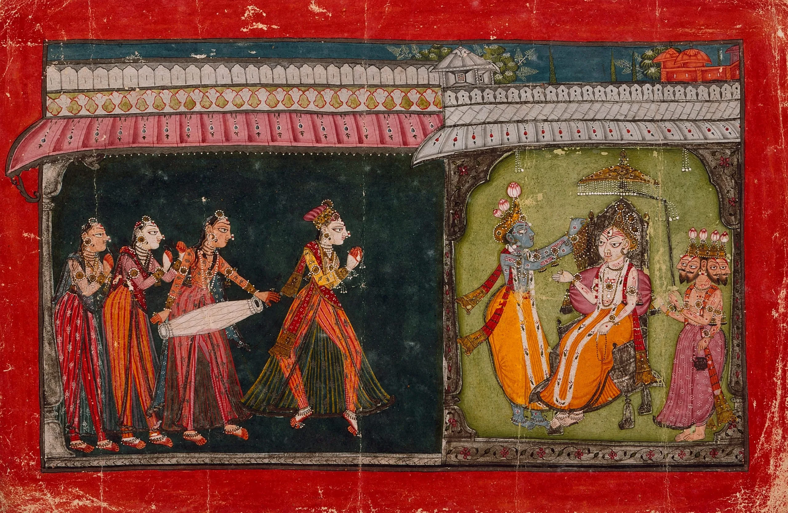 In this expression of sectarian rivalry, Shiva, the Hindu god of destruction, sits enthroned in a pavilion. He has a single crowned head with his third eye of wisdom and red sectarian markings. He wears a long floral garland and profuse jewelry. He holds a rosary in his left hand. His right hand is held in the symbolic gesture of 'gift-giving’ (varada mudra). Shiva is being adored by Vishnu, the blue-skinned god of preservation; and Brahma, the four-headed god of creation, who holds an honorific parasol over Shiva and carries a manuscript of the Vedas and an ascetic’s water vessel. In a separate chamber in front of the deities, a group of female entertainers celebrates the auspicious occasion. A dancer performs accompanied by a drummer playing a mridangam drum and two women playing hand cymbals. Rising above the pavilion’s roofline are a second-story structure, flowering trees and cypresses, and a distant compound.