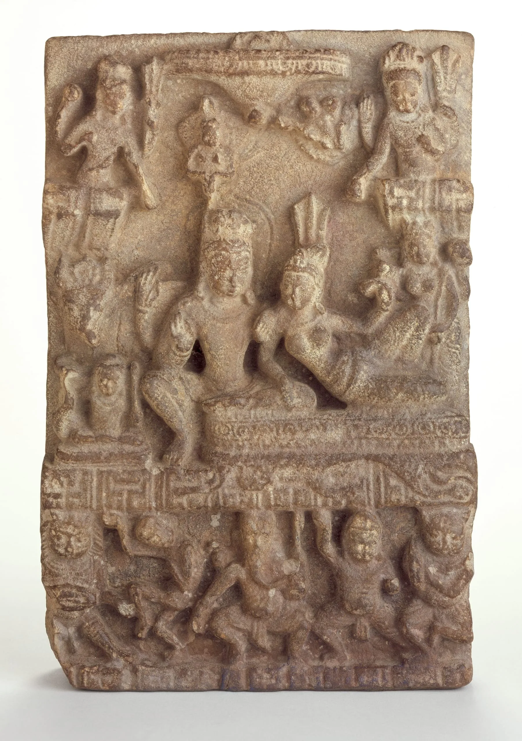 Family portraits of the Hindu god Shiva and his spouse Uma (or Parvati) are generally known in Sanskrit texts as Uma-Maheshvara ("Uma and the Great Lord" [Shiva]). Their children Ganesha and Kumara typically accompany them in family portraits. Here, the nimbate Shiva sits in a relaxed posture (lalita asana) with his right leg pendant. He has four arms. In his upper right hand, he holds a rosary. In his upper left hand behind Uma’s head, he carries a trident. His lower right hand displays the gesture of reassurance (abhaya mudra). His lower left hand rests on the shoulder of Uma, who reclines languidly beside Shiva with her right arm resting on his thigh. Kumara, Shiva and Uma’s son, sits beside Shiva holding a spear and accompanied by his peacock mount. Shiva’s bull mount Nandi sits behind Kumara. The holy family is accompanied by three attendants. Above Shiva’s head, the river goddess Ganga (Ganges) descends into Shiva’s piled hair of an ascetic. At the top of the relief, a flying celestial bears an honorific parasol (chattra). At the bottom of the relief above a band of stylized rock formations indicating that the location is Shiva’s Himalayan home on Mount Kailasha, the dancing elephant-headed Ganesha (also Shiva and Uma’s son), the skeletal devotee Bhringi, their adopted son Virabhadra, and two leonine-headed musicians entertain the divine couple.