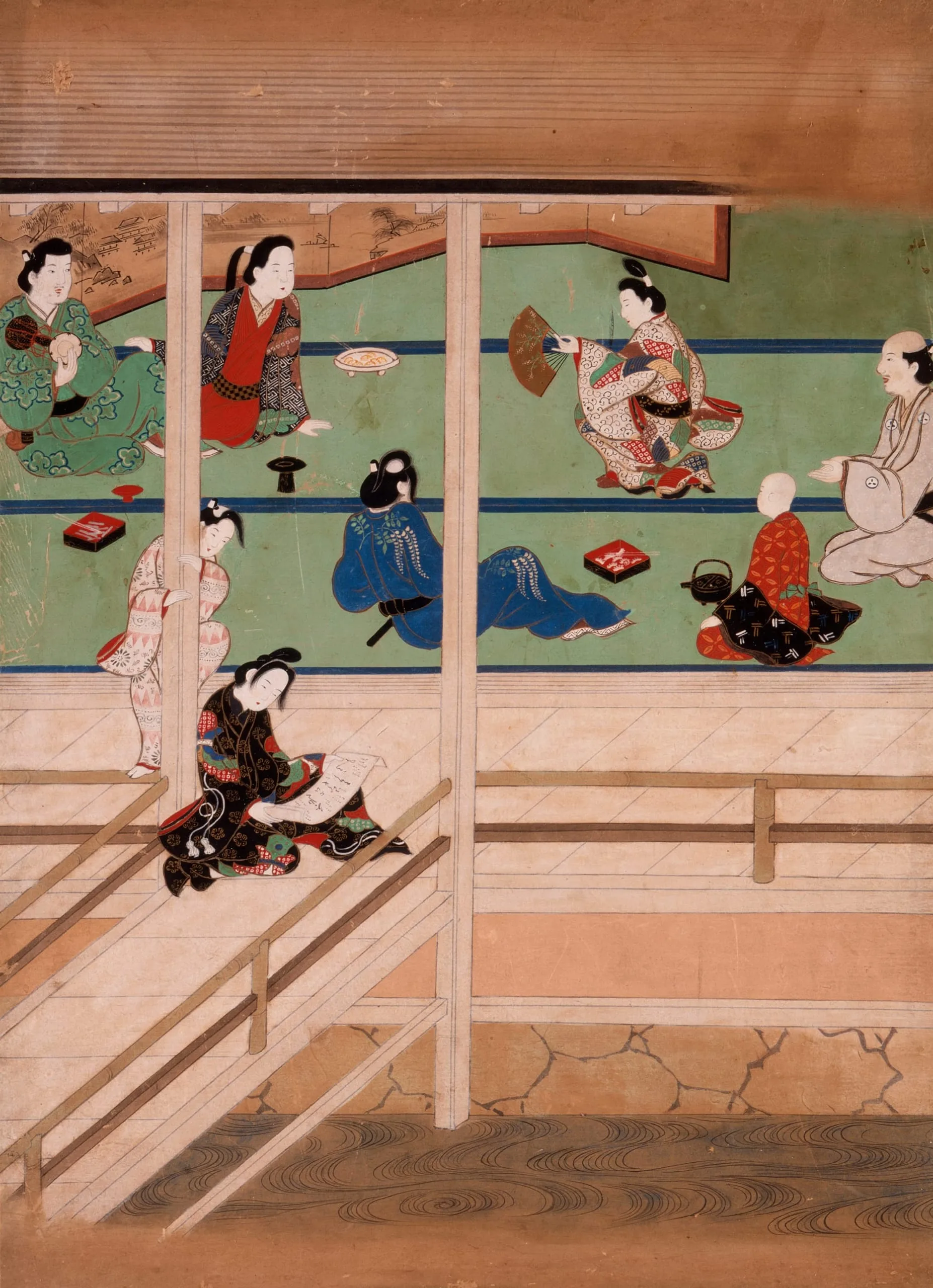 Japanese painting on silk or paper depicting eight figures in kimonos gathered in and around a raised interior room with green walls, wooden columns, and a veranda with diagonal planking
