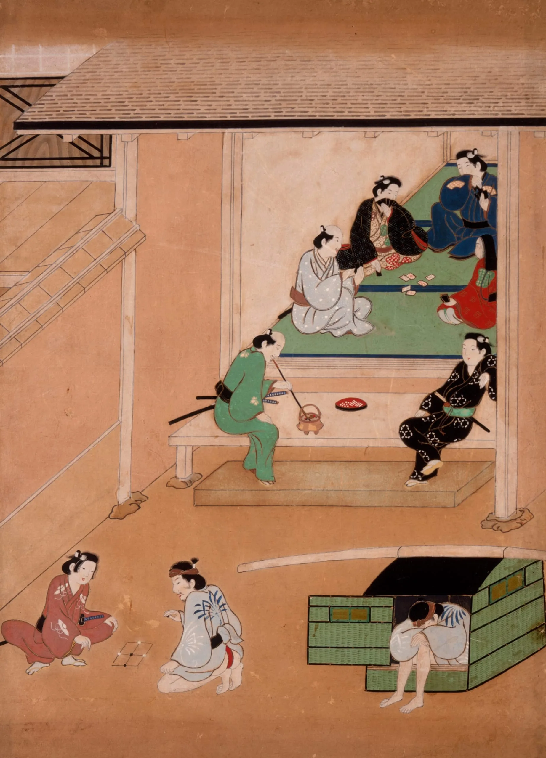 Japanese narrative painting on silk or paper showing nine figures in traditional dress gathered across a raised interior platform and open courtyard of a wooden building