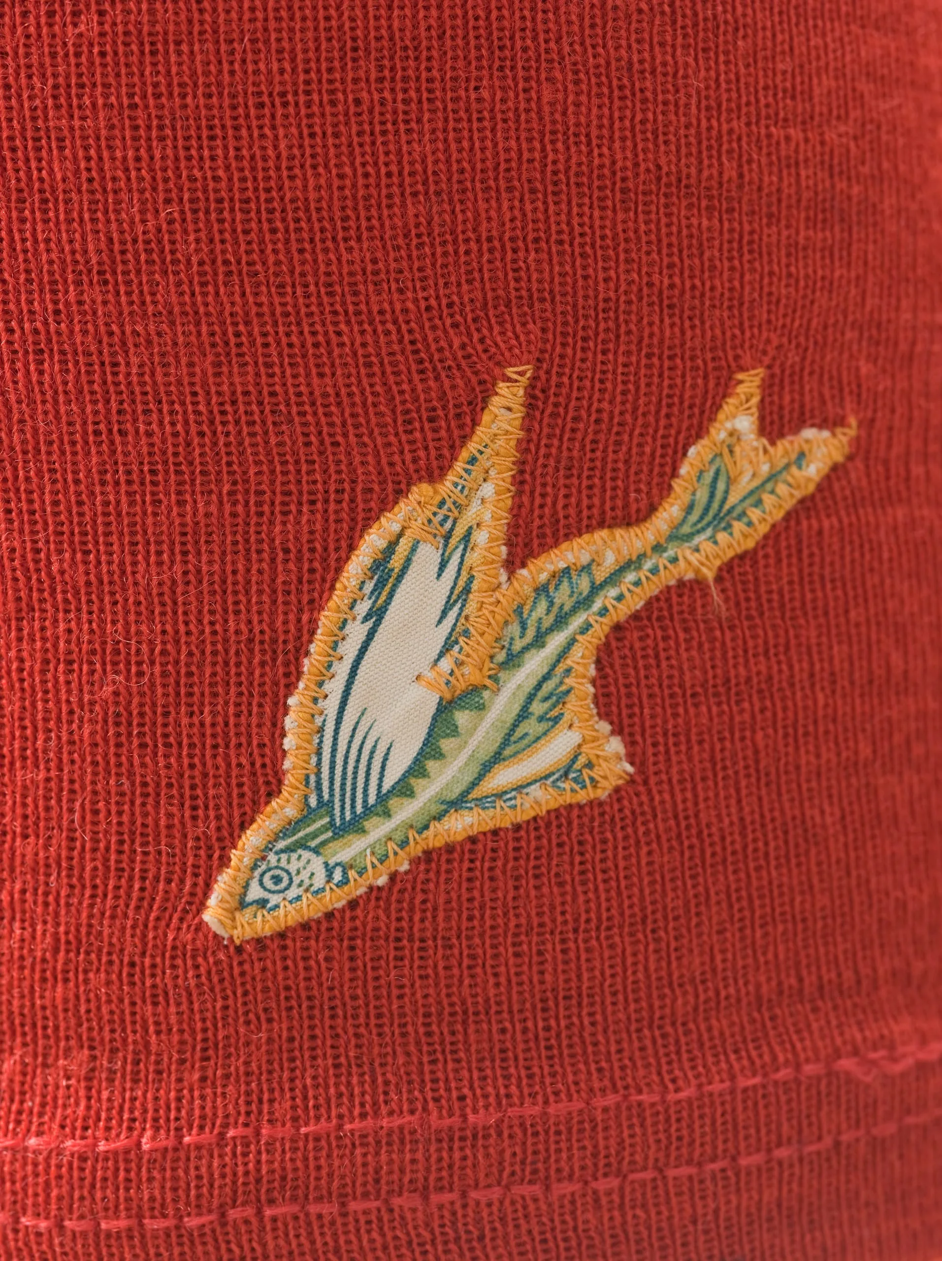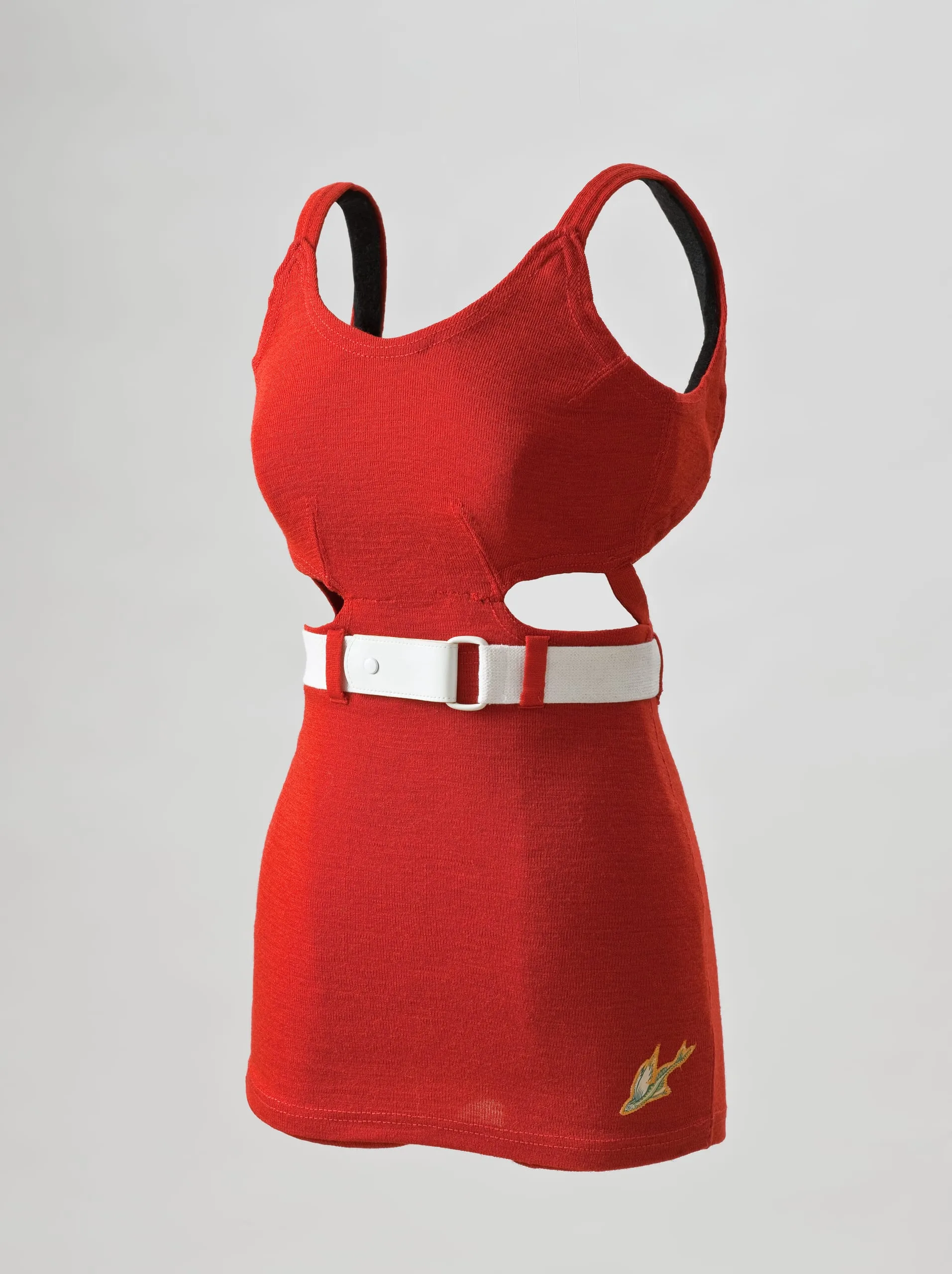 - Swimsuit: wool knit with rayon plain weave, printed, with appliqué; Belt: cotton braid (webbing), leather, and metal