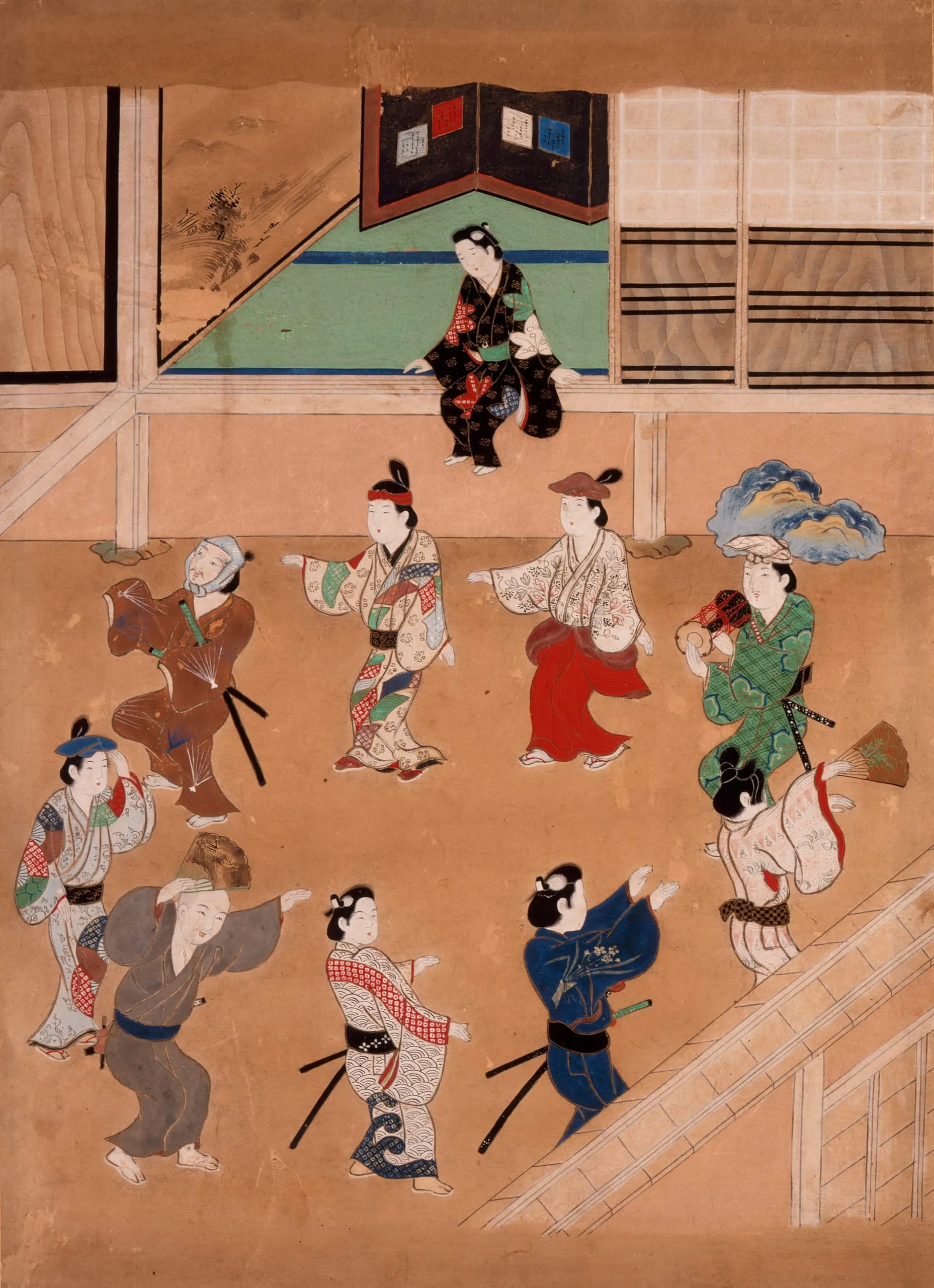 Japanese painting on salmon-pink ground showing ten figures in patterned kimonos mid-movement in a courtyard, with one seated figure on a raised teal platform above