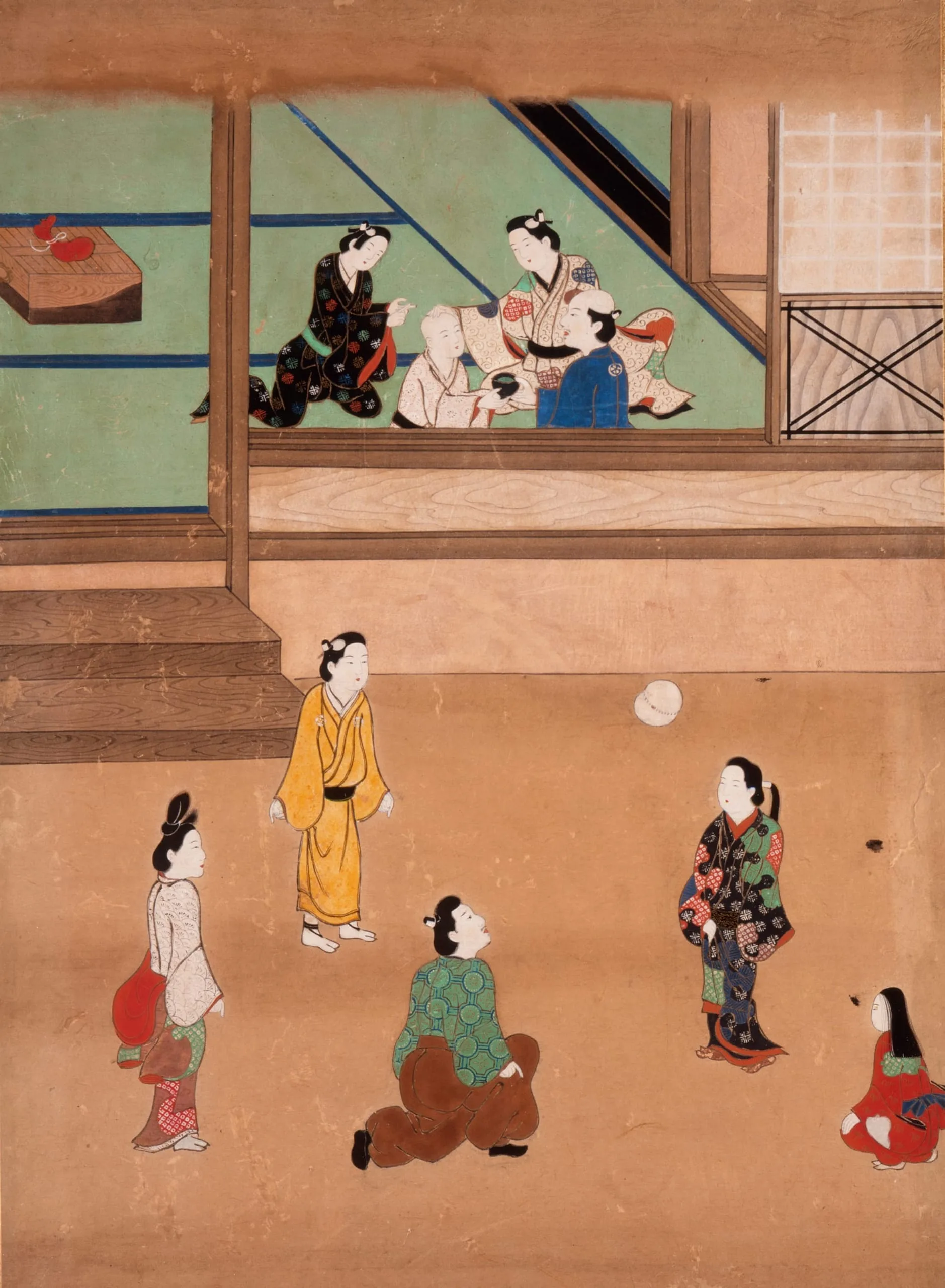Japanese painting on paper or silk, vertical composition showing figures in patterned robes playing a ball game outdoors below a raised veranda where four figures are seated
