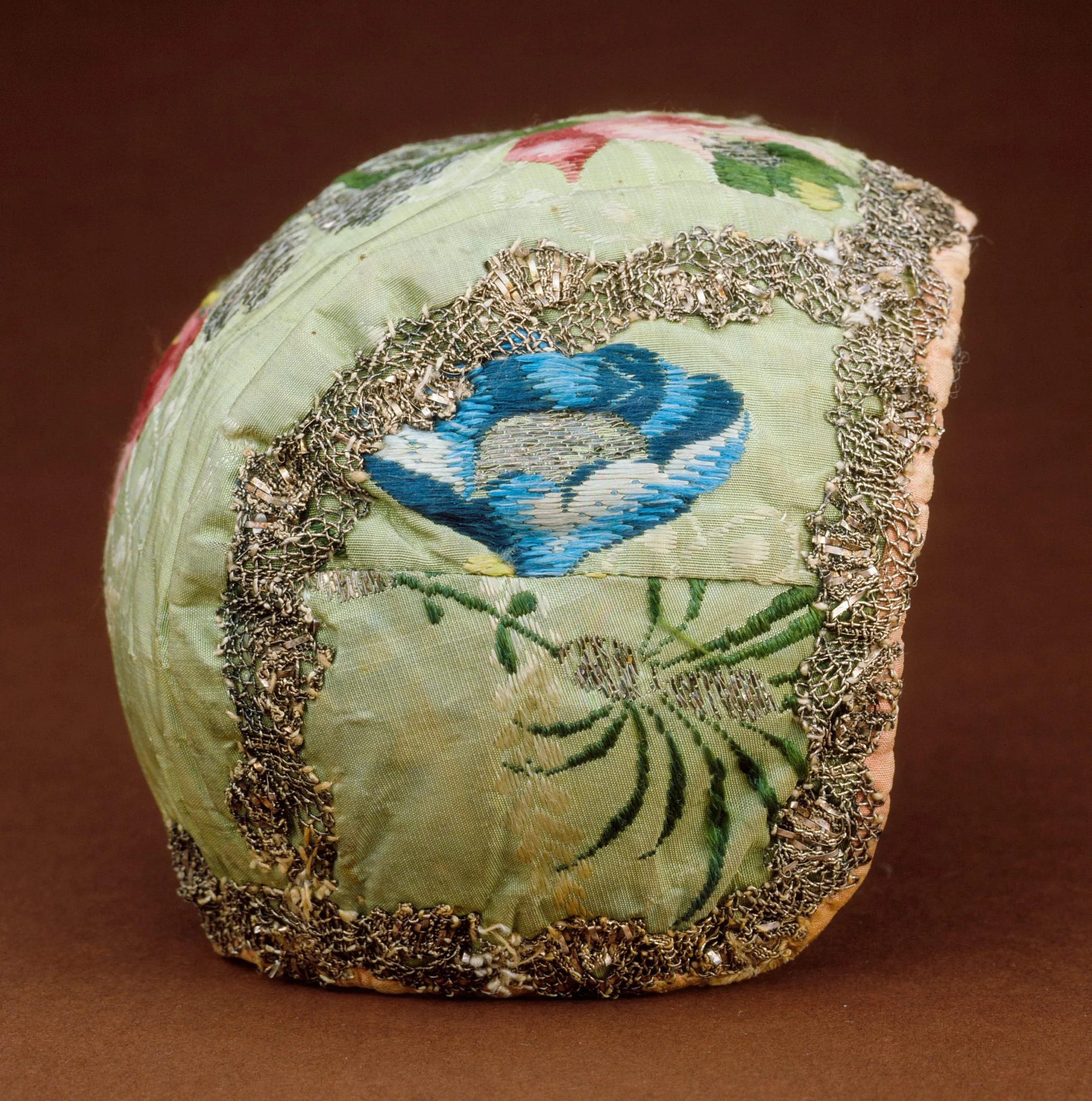 - Silk plain weave with silk and metallic-thread supplementary weft patterning and metallic-thread lace