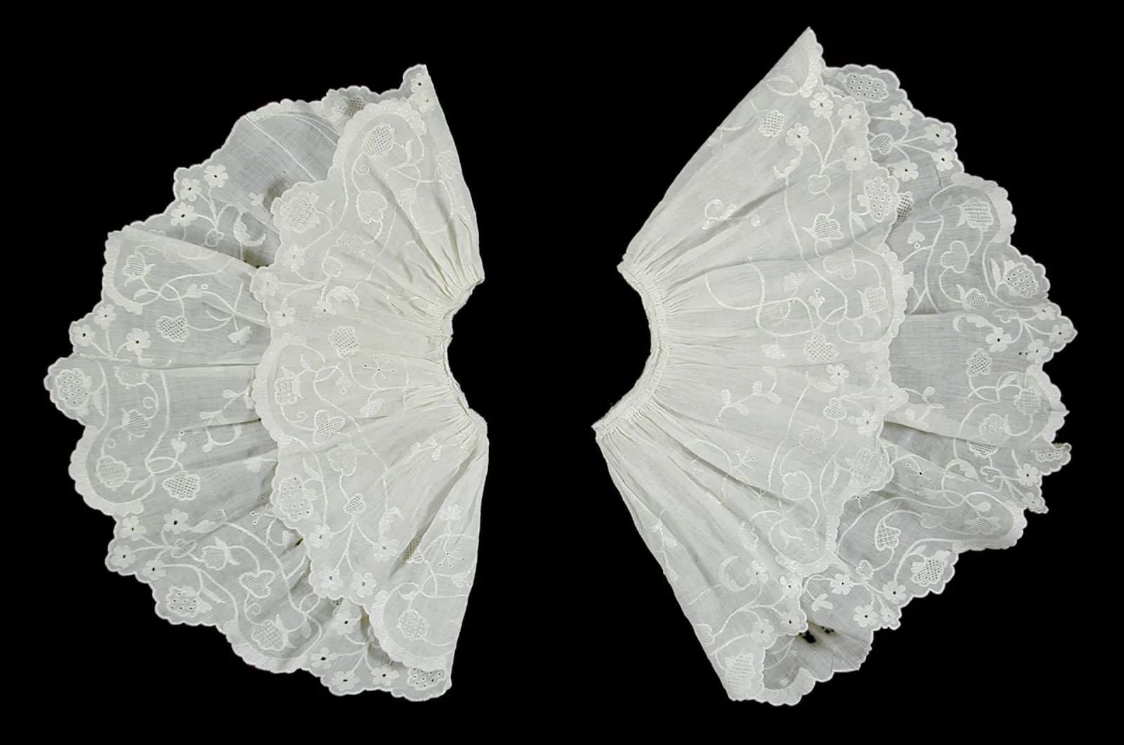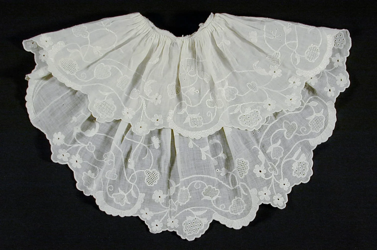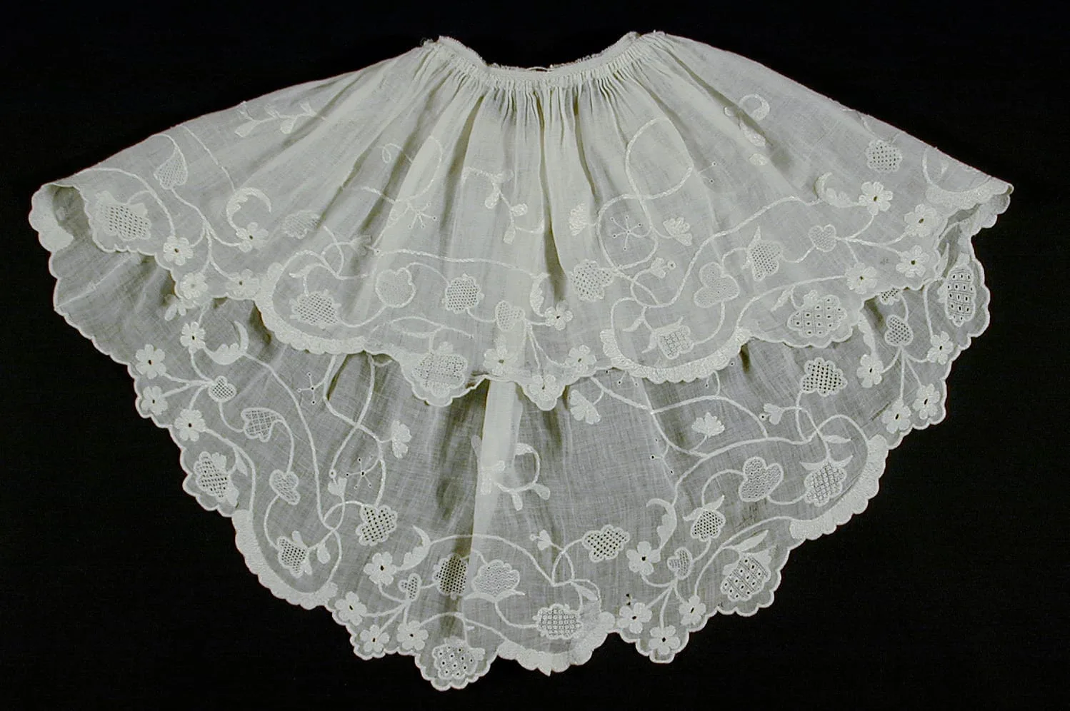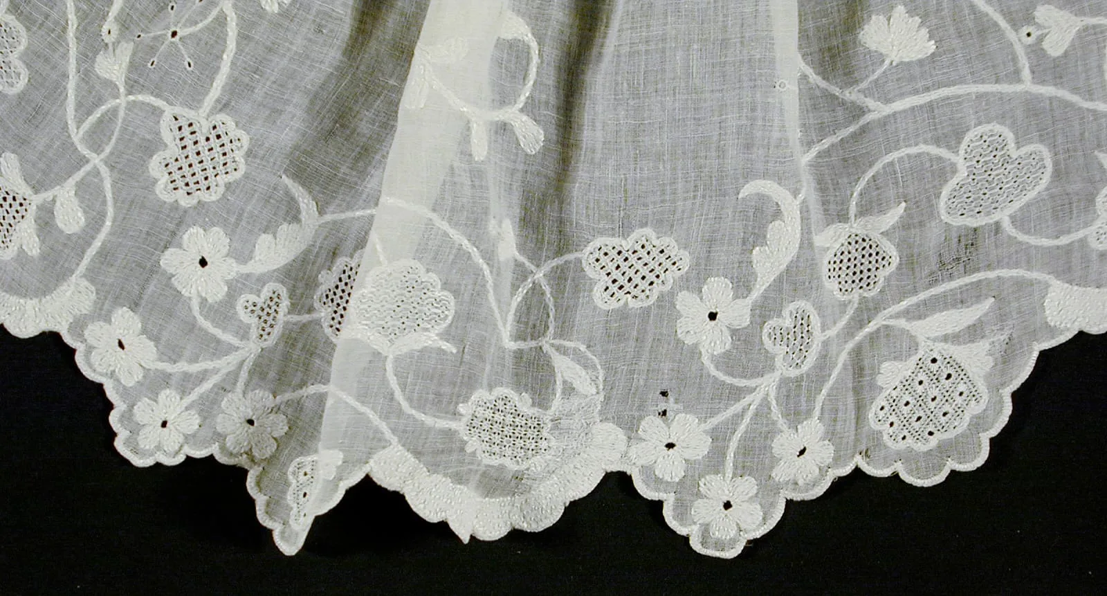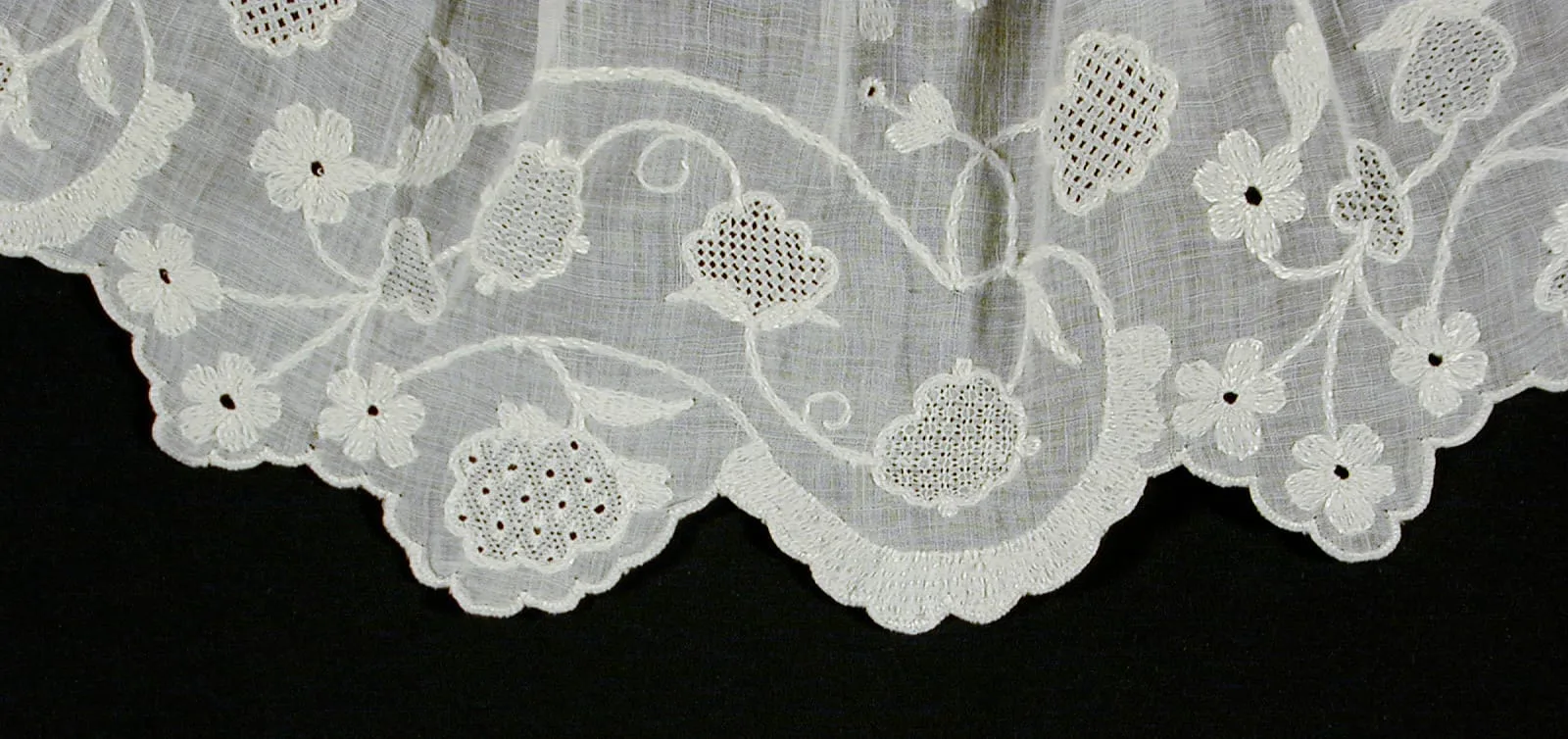 - Silk embroidery (running, darning stitches) and pulled threadwork on cotton