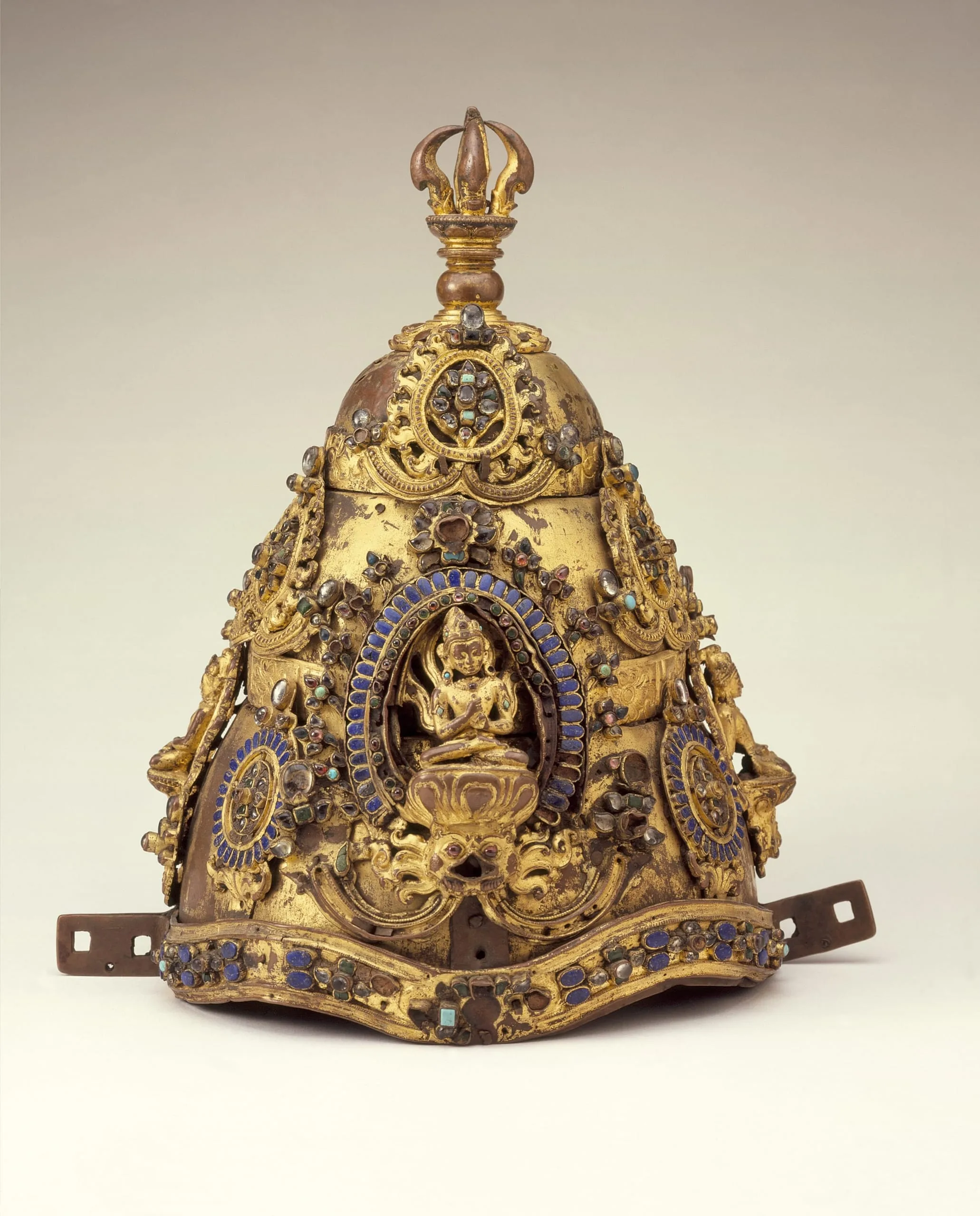 - Gilt copper alloy (embossed and cast), inlaid with lapis lazuli, turquoise, rock crystal, and other gemstones