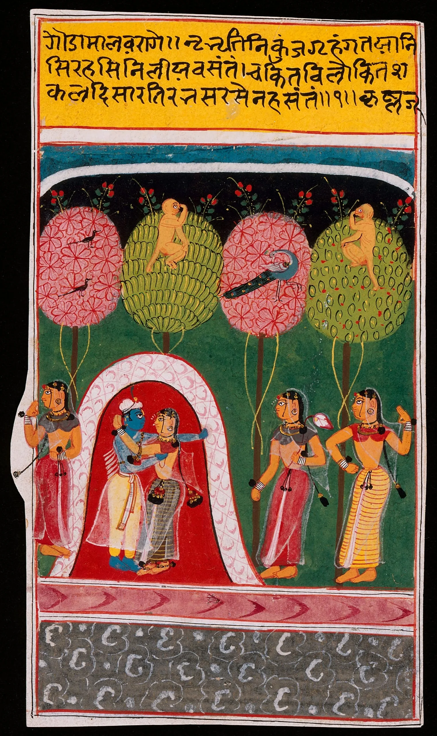 The folio illustrates the Sanskrit verses to be sung with Raga Malava that are inscribed in the header: “I reach the lonely forest hut where he secretly lies at night. My trembling eyes search for him as he laughs in a mood of passion.” (Gita Govinda 2:6:11) The blue-skinned Krishna and Radha are embracing in a thatch hut in the forest beside a river. Three gopis (cow-herdswomen) are nearby. The folio has been cropped.