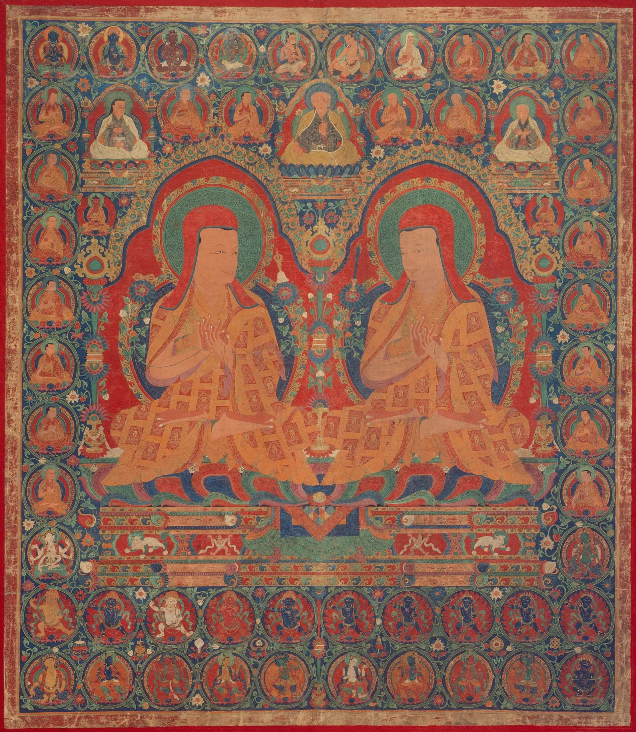 This 15th-century Sakyapa painting continues the tradition of Tibetan lineage painting established in the 13th century. The eminent monks Kunga Wangcuk (left) and Sonam Senge (right) are depicted as large figures in the center, with the lineage representing the transmission of the sect's esoteric teachings depicted by the much smaller images above and to the sides. However, where the 13th-century Taklung artists used stylized "mountain staves" derived from eastern Indian painting to form the space enclosing each figure (see AC1994.47.1), beginning in the early 14th century, the Ngor artists enclosed the lineage figures with loops formed by a continuously intertwining "vine of life." This is the same technique used to enclose each of the figures in the early 15th-century sculpture of the Lord of the Planets, Rahu, from the renowned Densatil Monastery (AC1999.58.1).