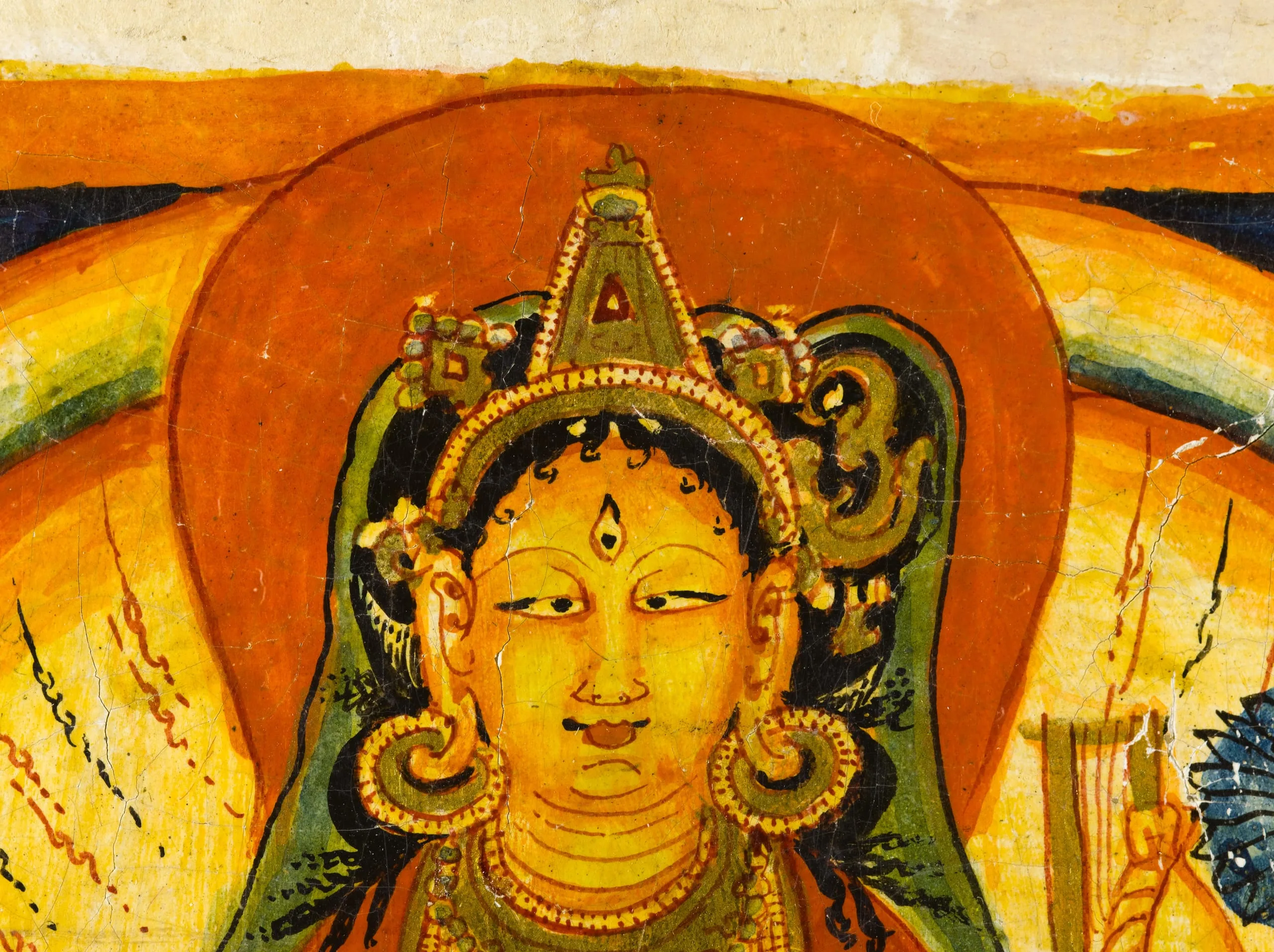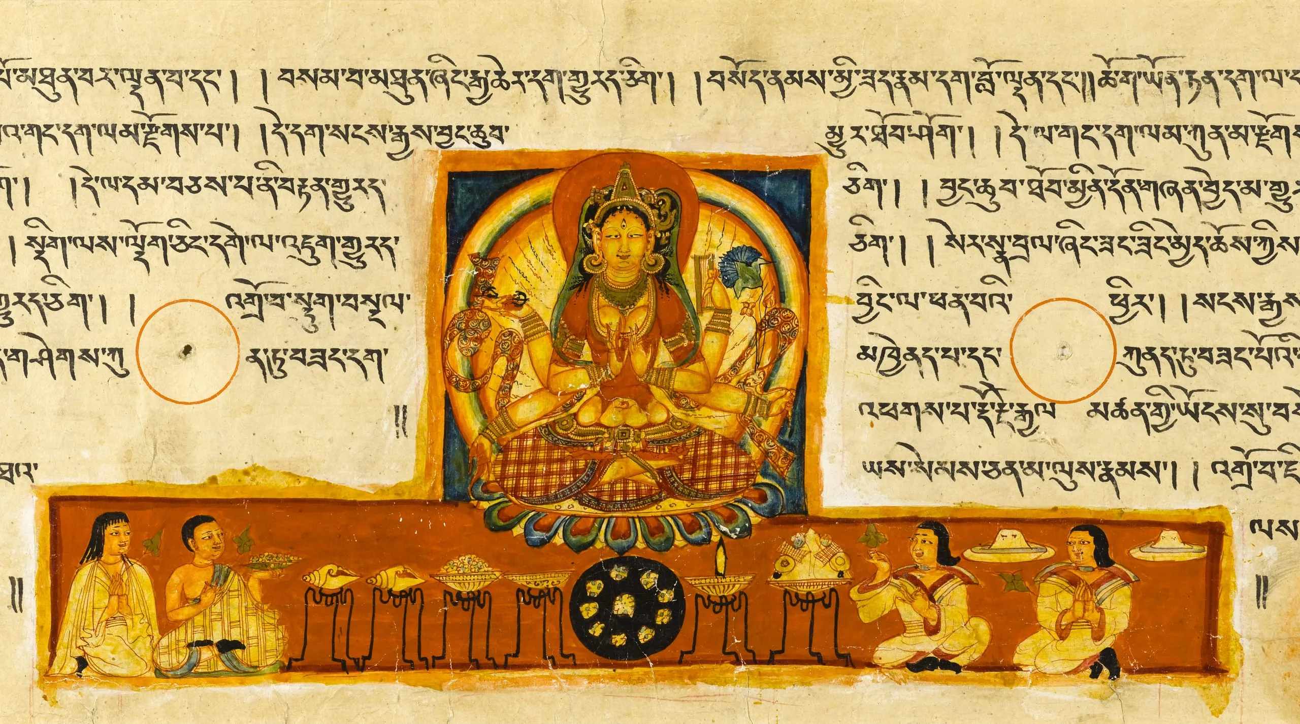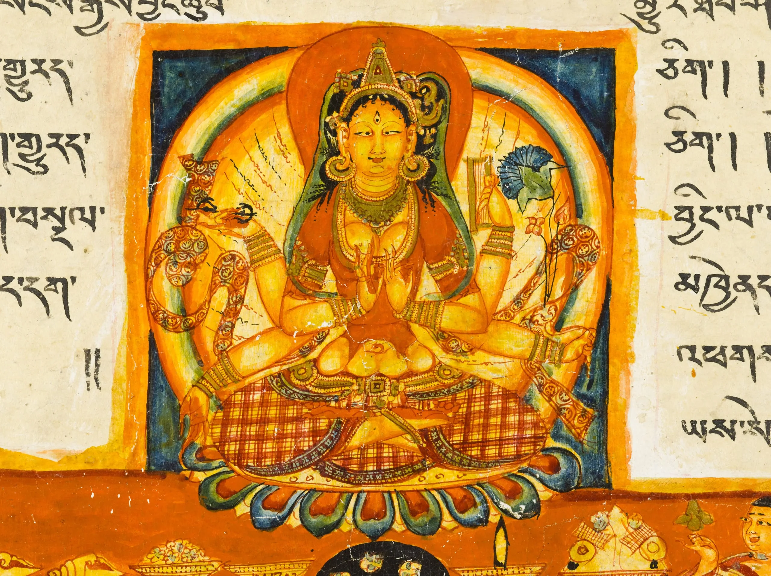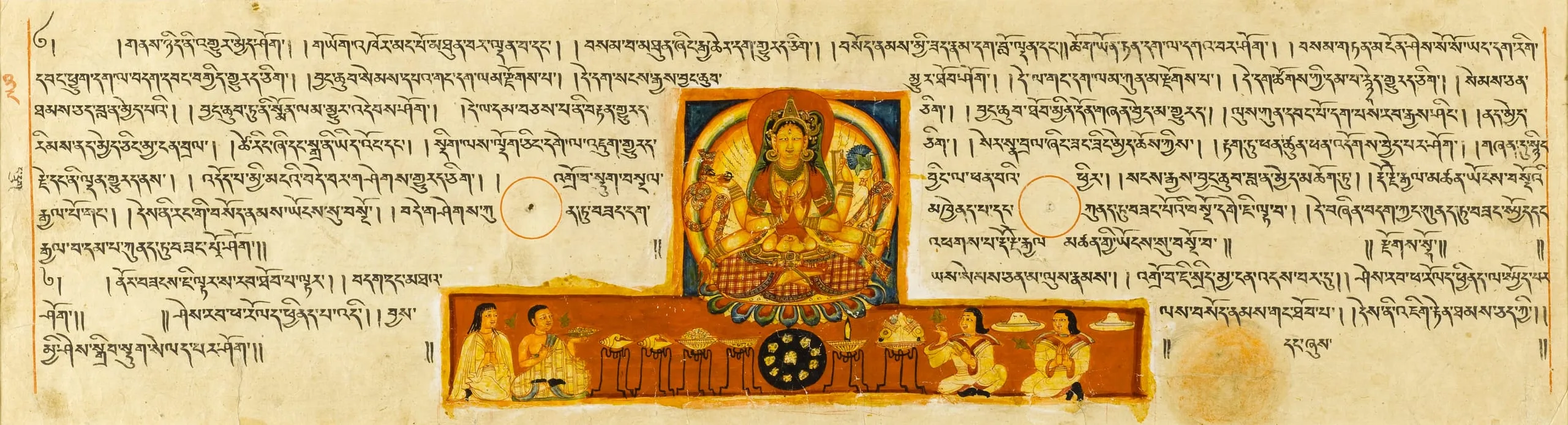 This folio, and its series mates M.81-90-7-.17, are among the earliest examples of Tibetan manuscript painting that have yet come to light. They were discovered by the renowned Tibetologist Guiseppe Tucci (1894-1984), who recovered them in the ruins of the great monastic complex at Tholing in western Tibet. Tholing was founded in the 10th century by one of the most important figures of the Second Propagation of the Buddhist Faith, Rincen Zangpo (958-1055), who studied Buddhism in Kashmir and brought Kashmiri artists back with him to western Tibet.