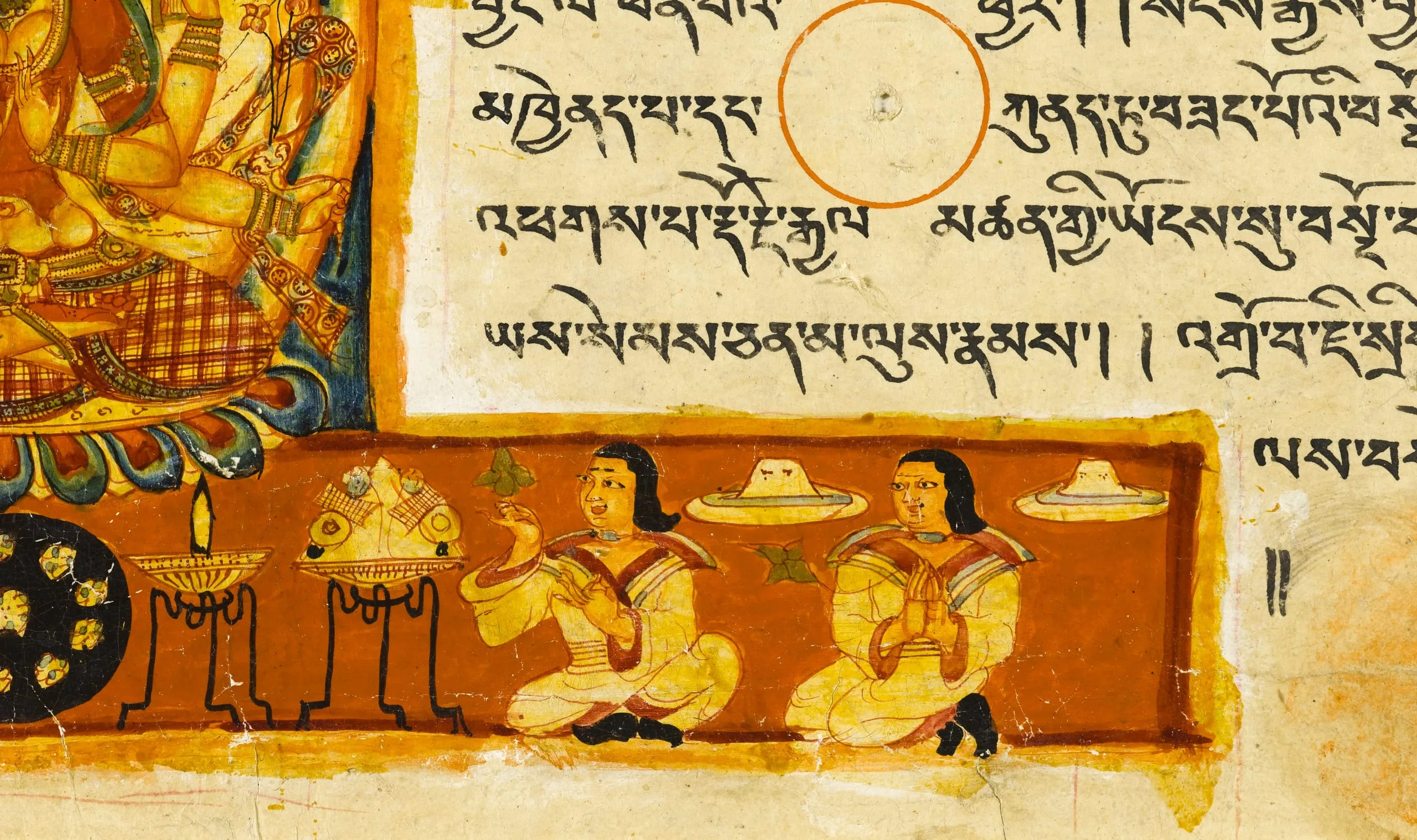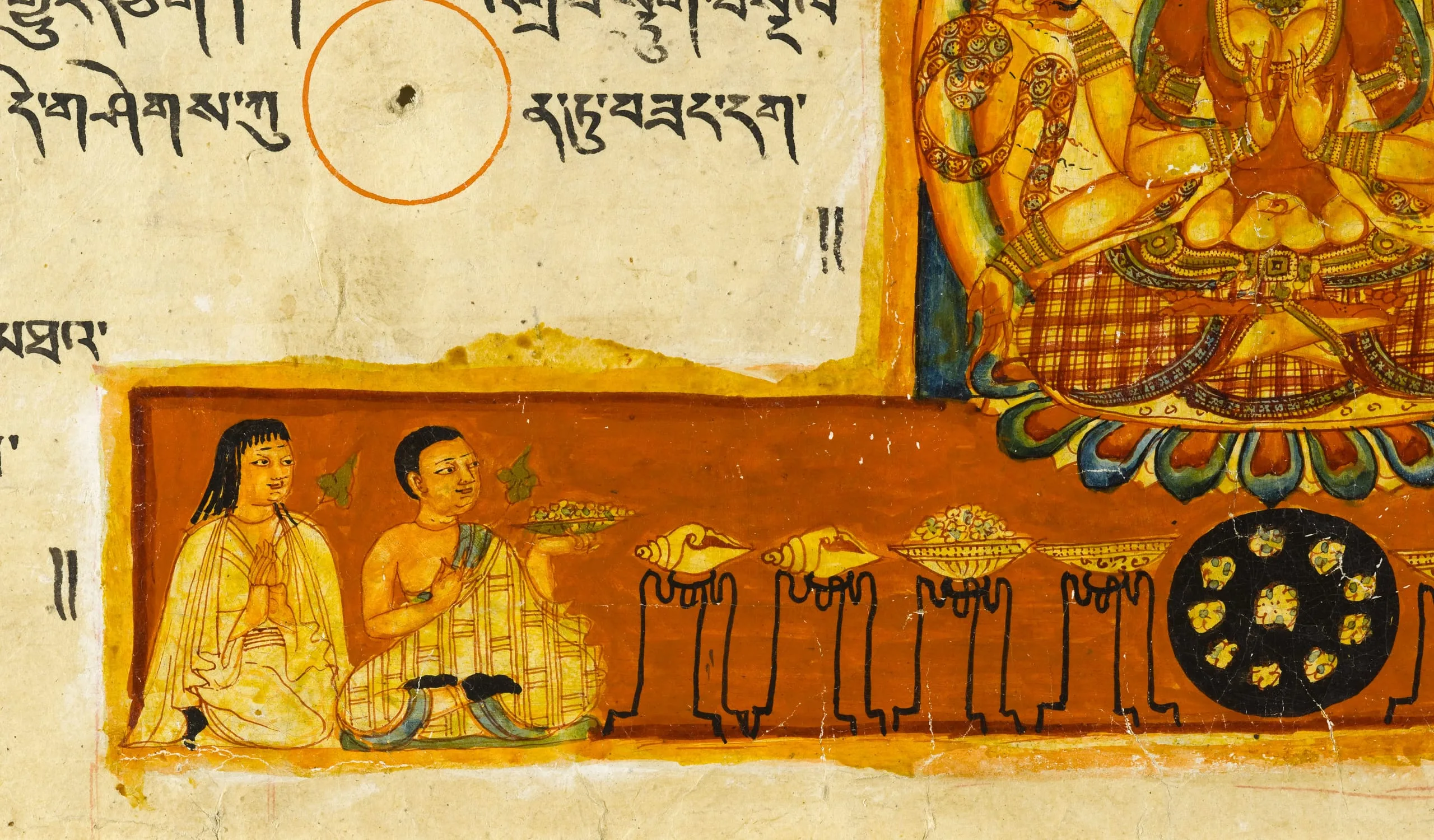 Early western Tibetan manuscripts exhibit a preference for brilliant colors, often highlighted with gold. As in eastern Indian painting, volume is indicated by shading. The particular oval shape of the head with the hair descending in a widow's peak in front, distinct figural forms with attenuated waists, and an interest in patterned textiles are derived from the Buddhist art of Kashmir. Though made of paper, each folio continues the traditional palm leaf-manuscript format by having two holes for string bindings. Unlike many eastern Indian and Nepalese manuscripts, the illustrations in this manuscript relate directly to the associated text. The illuminations are also unusual in presenting personifications of esoteric concepts.
