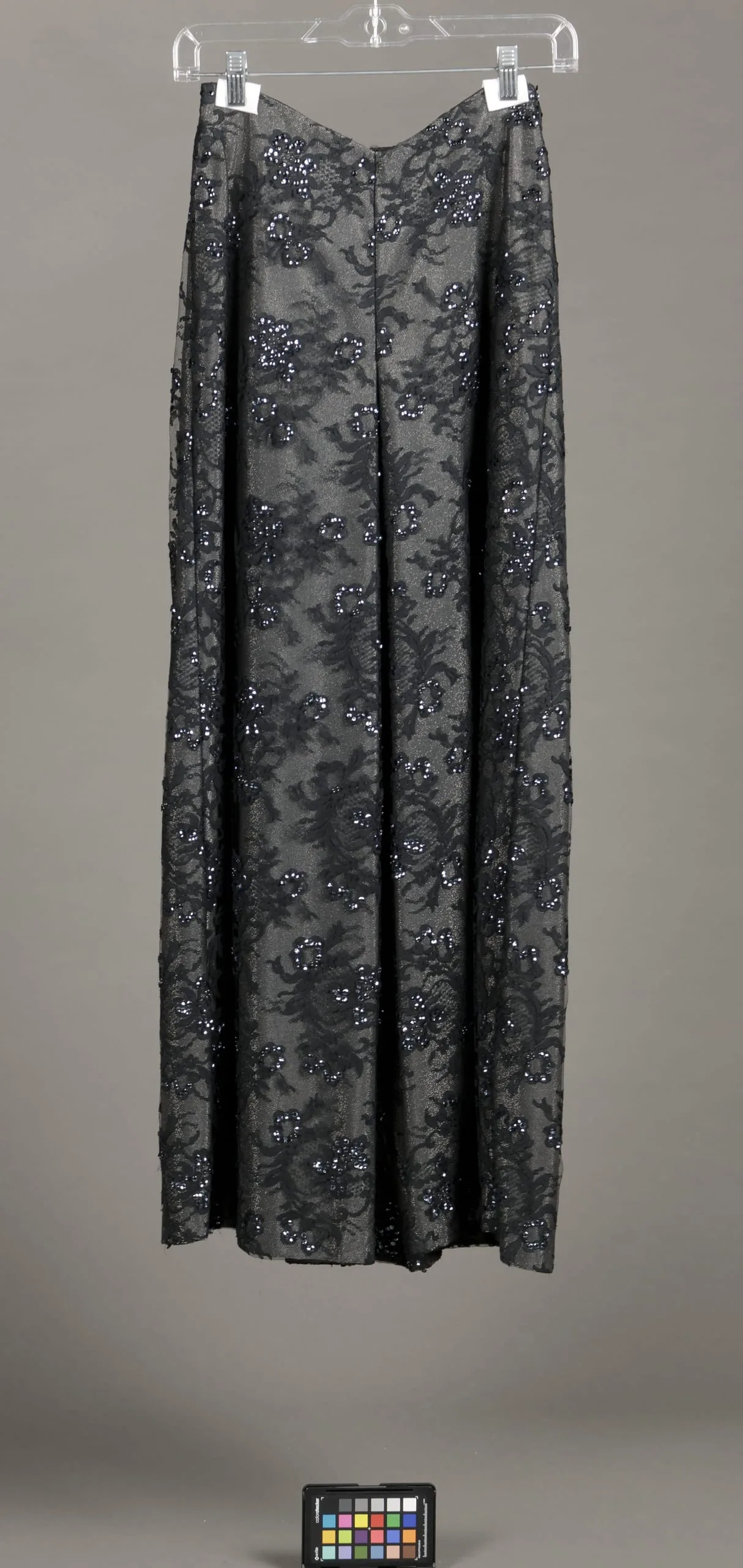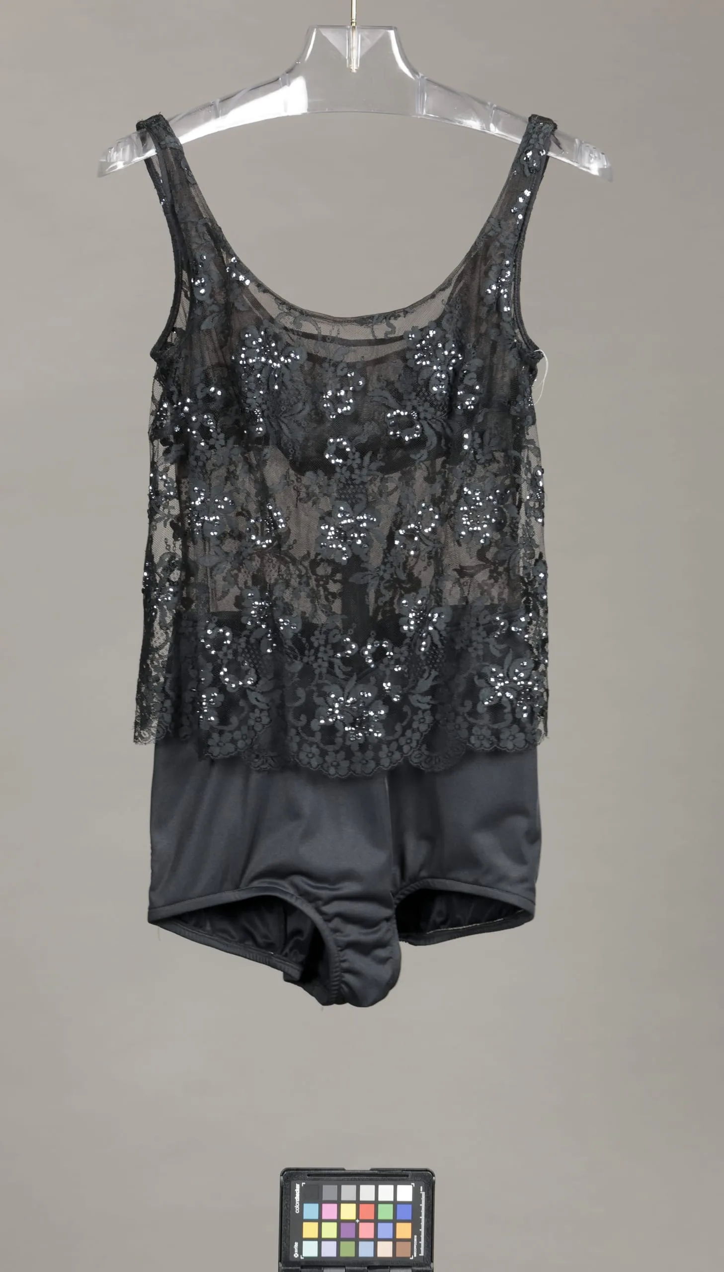 - Bathing Suit: cotton/silk/rayon lace, plastic sequins, nylon knit; Pants: cotton/silk/rayon lace, plastic sequins, nylon and lamé plain weave