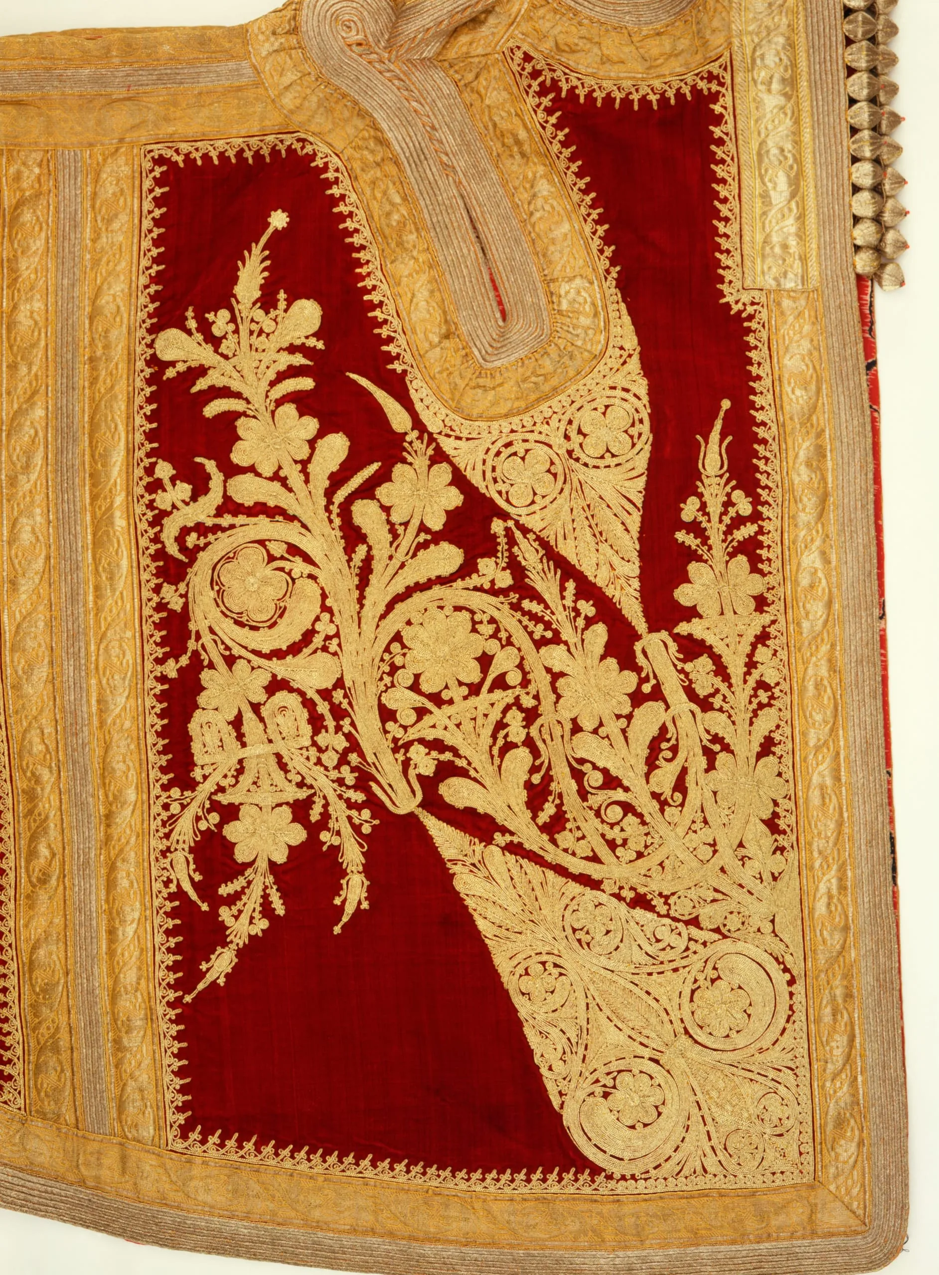 - Silk velvet gold braid and couch work, galoon; printed cotton lining