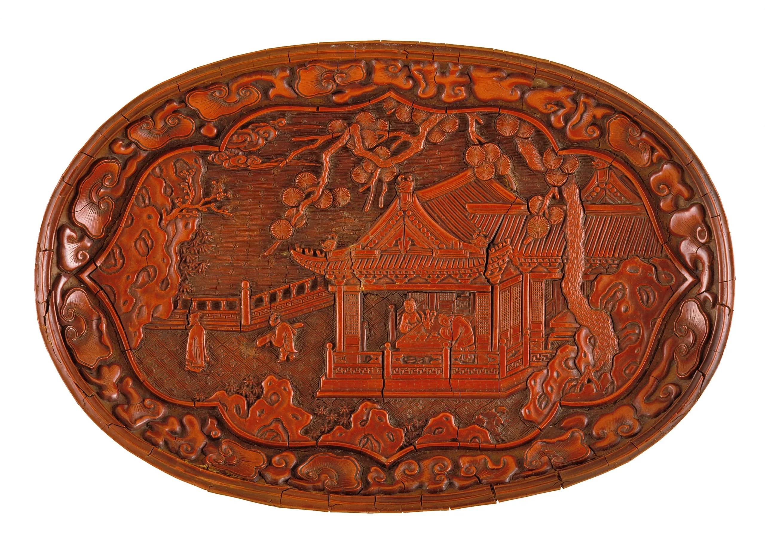 The elaborate scene on this small tray depicts a conventional gathering of literati who have just finished a sociable banquet. Within the pavilion a guest nods over the laden table; at left, another departs, followed by a servant bearing a qin, a Chinese stringed instrument. The artist delighted in natural forms, as seen in the pine, flowers, planes, and contortions of the rockery, in the perspective of the pavilion's facade and the furnishings within (the remains of food are shown in the dishes), and in the band of lingzhi mushrooms on the border. His skill in carving and pleasure in patterning pervade the entire plate. The background diaperwork of rosettes and meanders represents earth and sky.