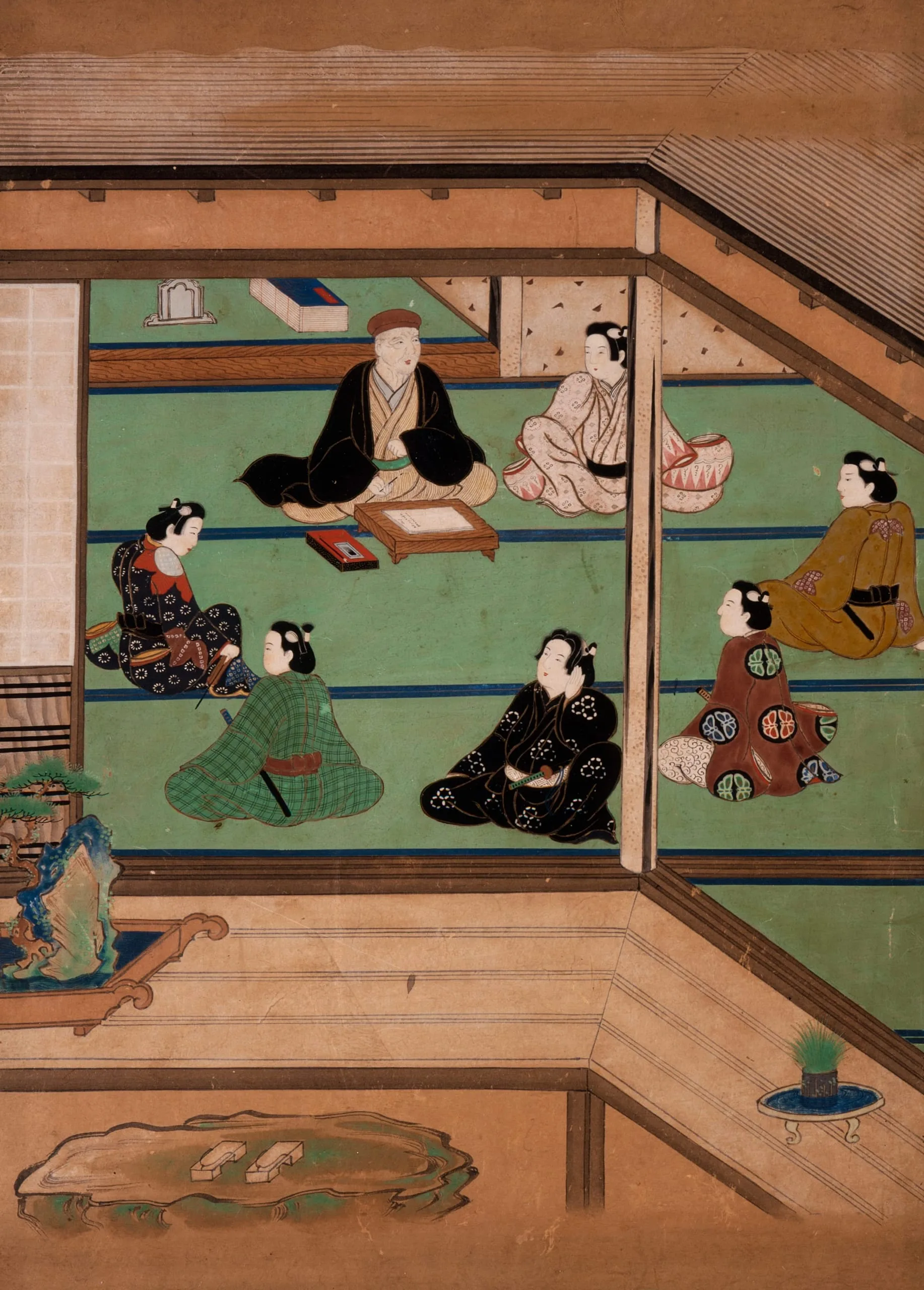 Japanese painting of eight robed figures seated on green tatami mats in an interior room, viewed from above, with a garden veranda in the foreground
