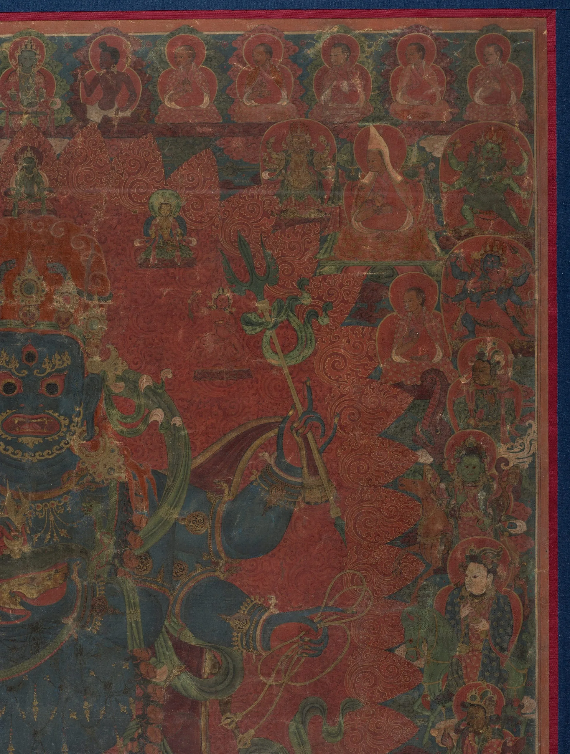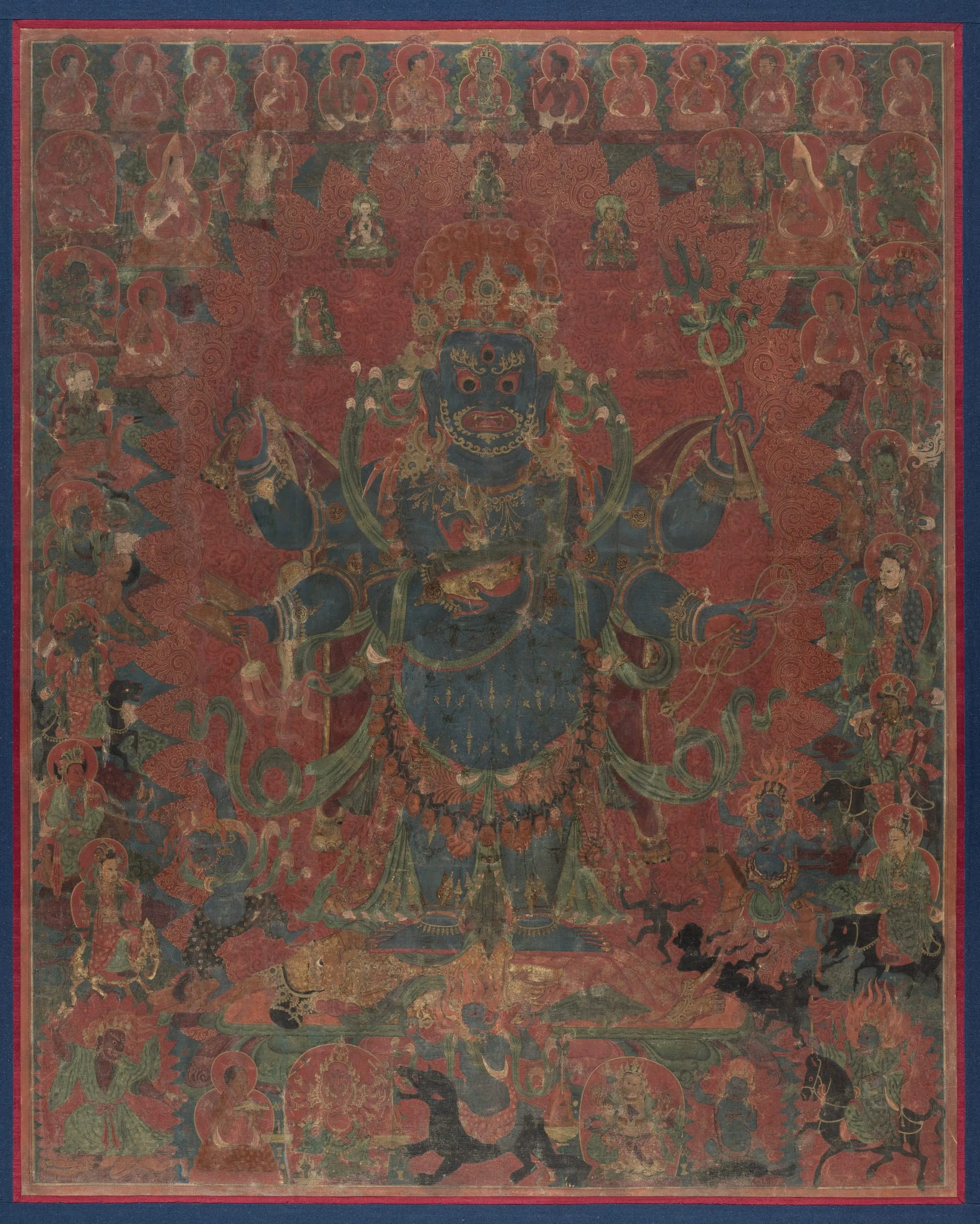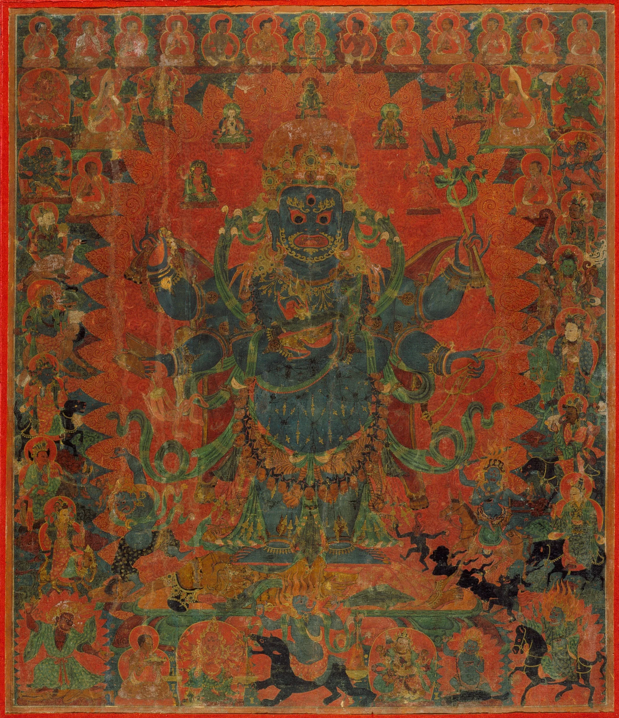 Tibetan liturgical texts claim that there are as many as seventy-five forms of Mahakala (the Great Black One) and describe him as being the deep black color of the storm clouds that will darken the sky at the end of time. A six-armed form of Mahakala is represented here standing atop the prostrate figure of the elephant-headed god Ganesha. His principal arms hold his attributes: the chopper and the skull-cup. The top row depicts Indian mahasiddhas (perfected beings) and eminent monks of the Sakyapa lineage. The ten guardians of the directions, the eight-cardinal points, plus the zenith and nadir, are lined up vertically on either side of Mahakala’s flaming aura. At Ganesha’s feet rides Palden Lhamo on her fierce mule, while at his head is Takkiraja. In the lower left corner Jinamitra dances, and Traksad rides a black horse in the lower right. The Yaksha Kshetrapala rides a black bear directly below Mahakala. To the left is the monk who commissioned this painting, shown in the act of propitiating Ganesha. Kubera, the god of wealth, is to the right of the bear.