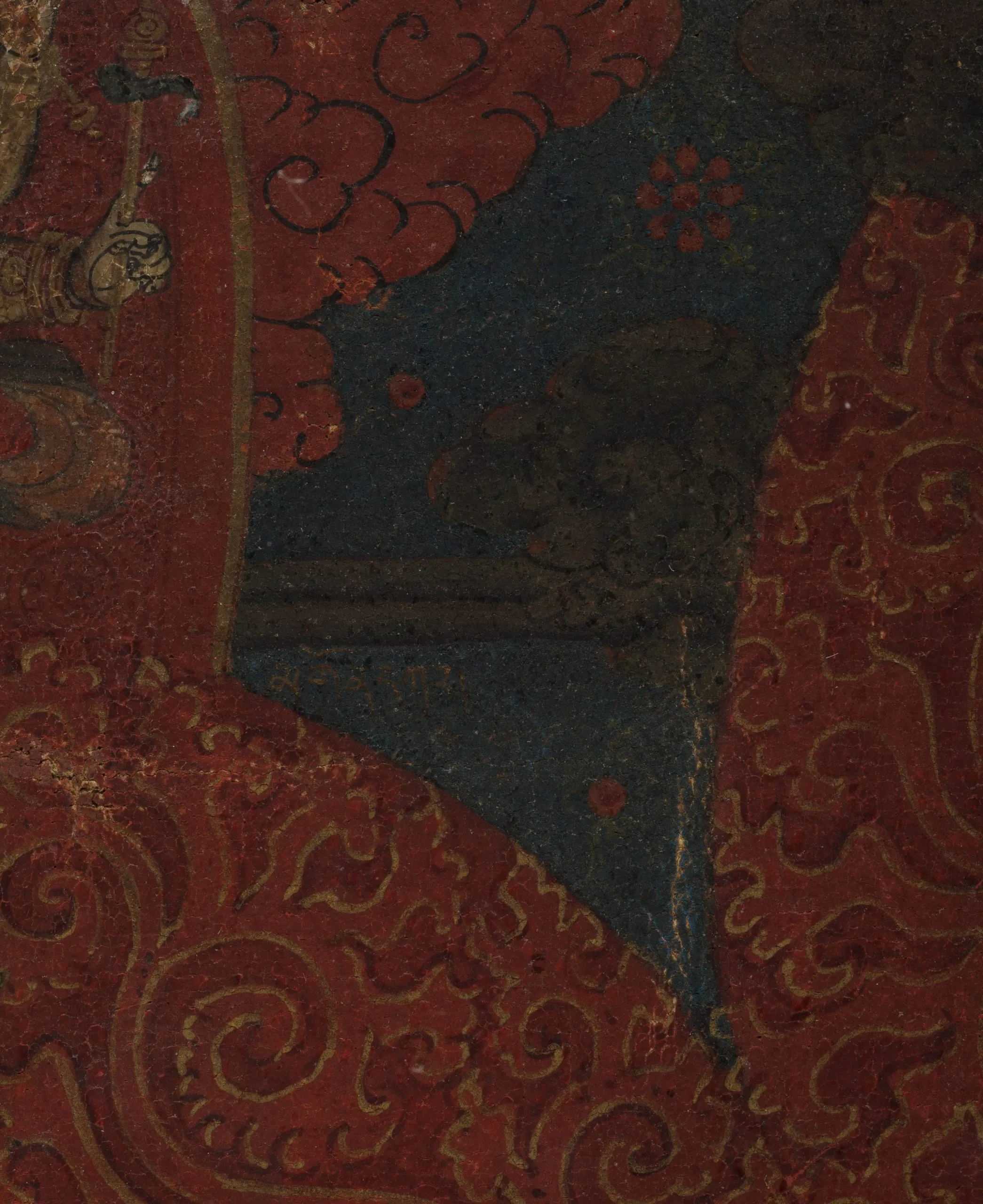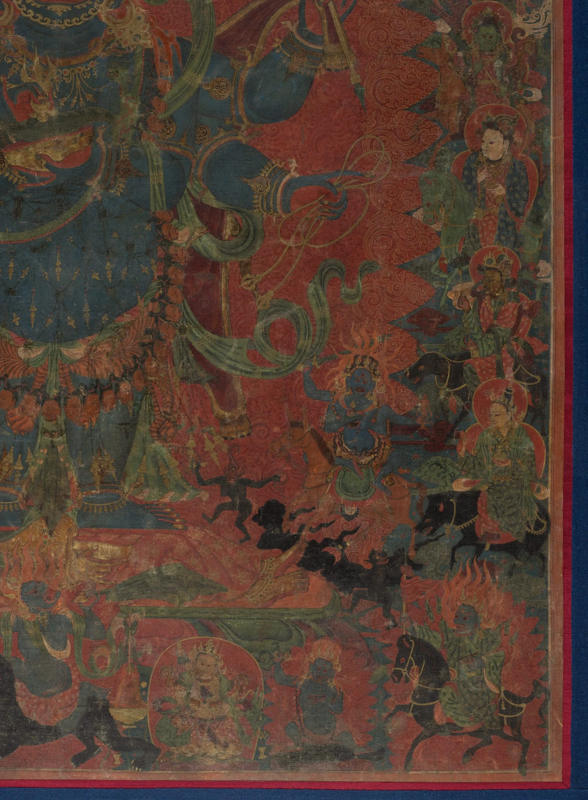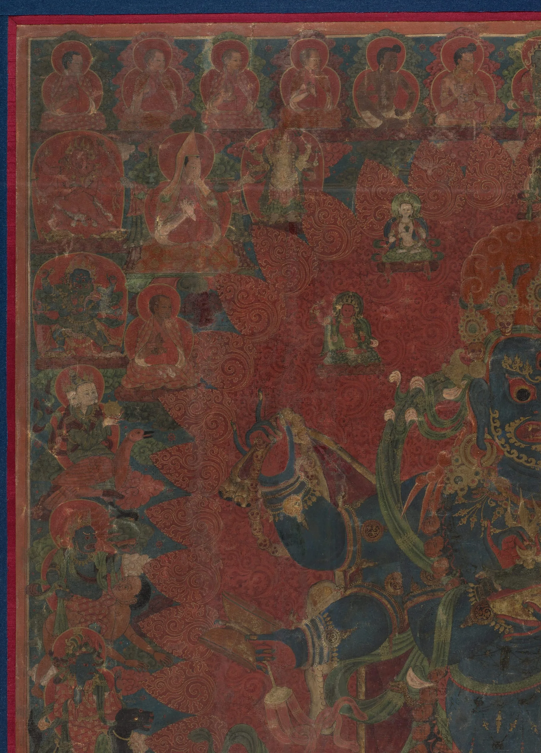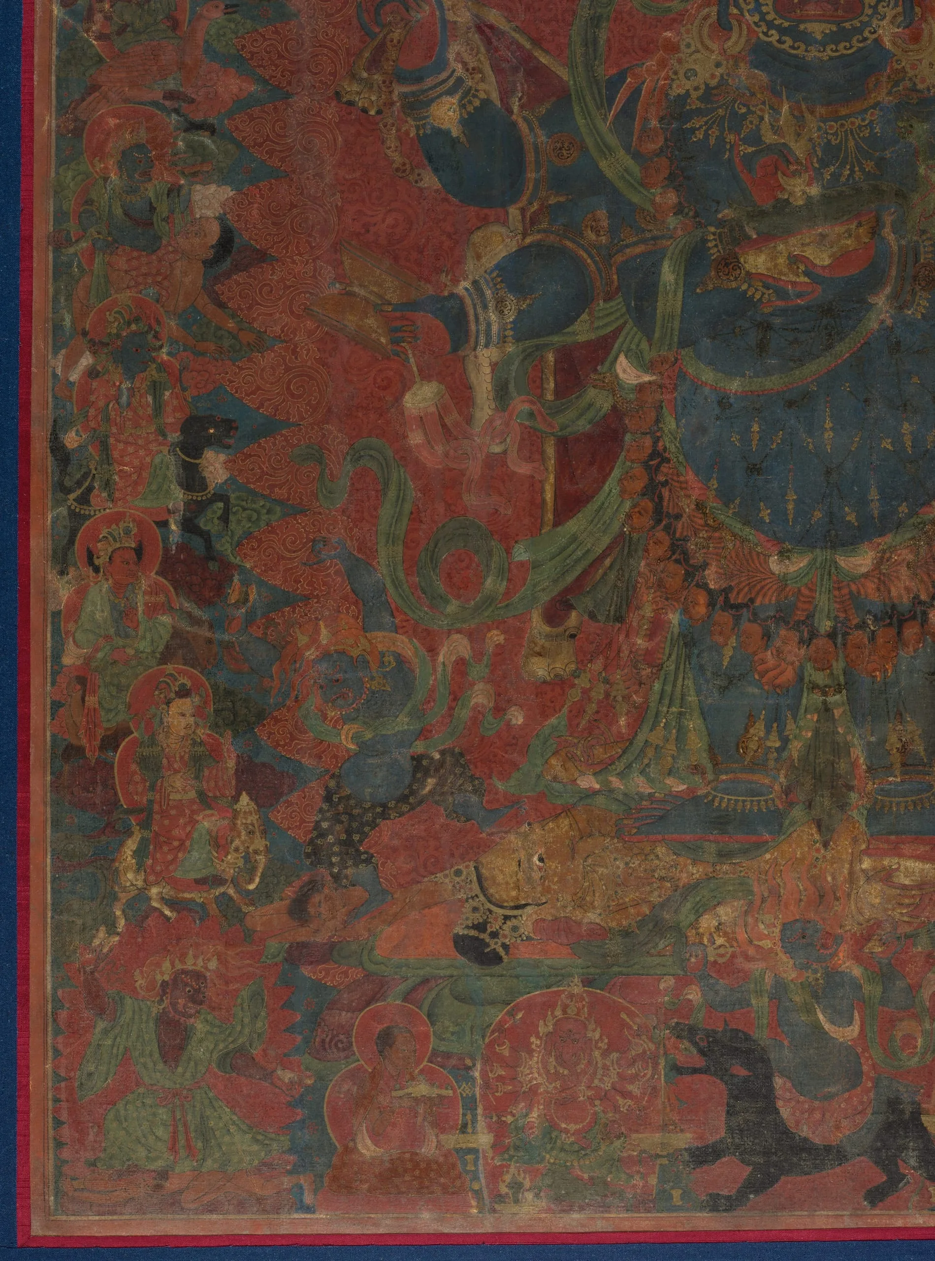 Tibetan liturgical texts claim that there are as many as seventy-five forms of Mahakala (the Great Black One) and describe him as being the deep black color of the storm clouds that will darken the sky at the end of time. A six-armed form of Mahakala is represented here standing atop the prostrate figure of the elephant-headed god Ganesha. His principal arms hold his attributes: the chopper and the skull-cup. The top row depicts Indian mahasiddhas (perfected beings) and eminent monks of the Sakyapa lineage. The ten guardians of the directions, the eight-cardinal points, plus the zenith and nadir, are lined up vertically on either side of Mahakala’s flaming aura. At Ganesha’s feet rides Palden Lhamo on her fierce mule, while at his head is Takkiraja. In the lower left corner Jinamitra dances, and Traksad rides a black horse in the lower right. The Yaksha Kshetrapala rides a black bear directly below Mahakala. To the left is the monk who commissioned this painting, shown in the act of propitiating Ganesha. Kubera, the god of wealth, is to the right of the bear.