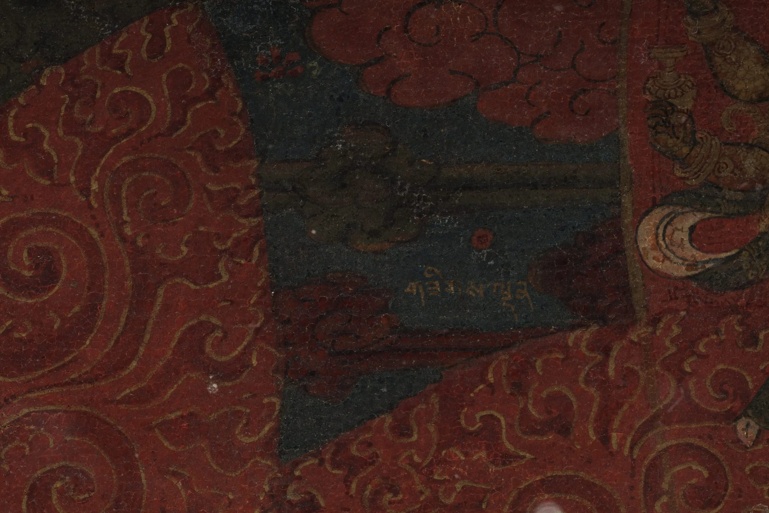 Although this thangka was collected in the western Tibetan kingdom of Guge, the style of painting is so closely connected with that of the murals in the Kumban stupa at Gyantse, that it must have been made either at Gyantse or another location in the Tsang region of central Tibet.