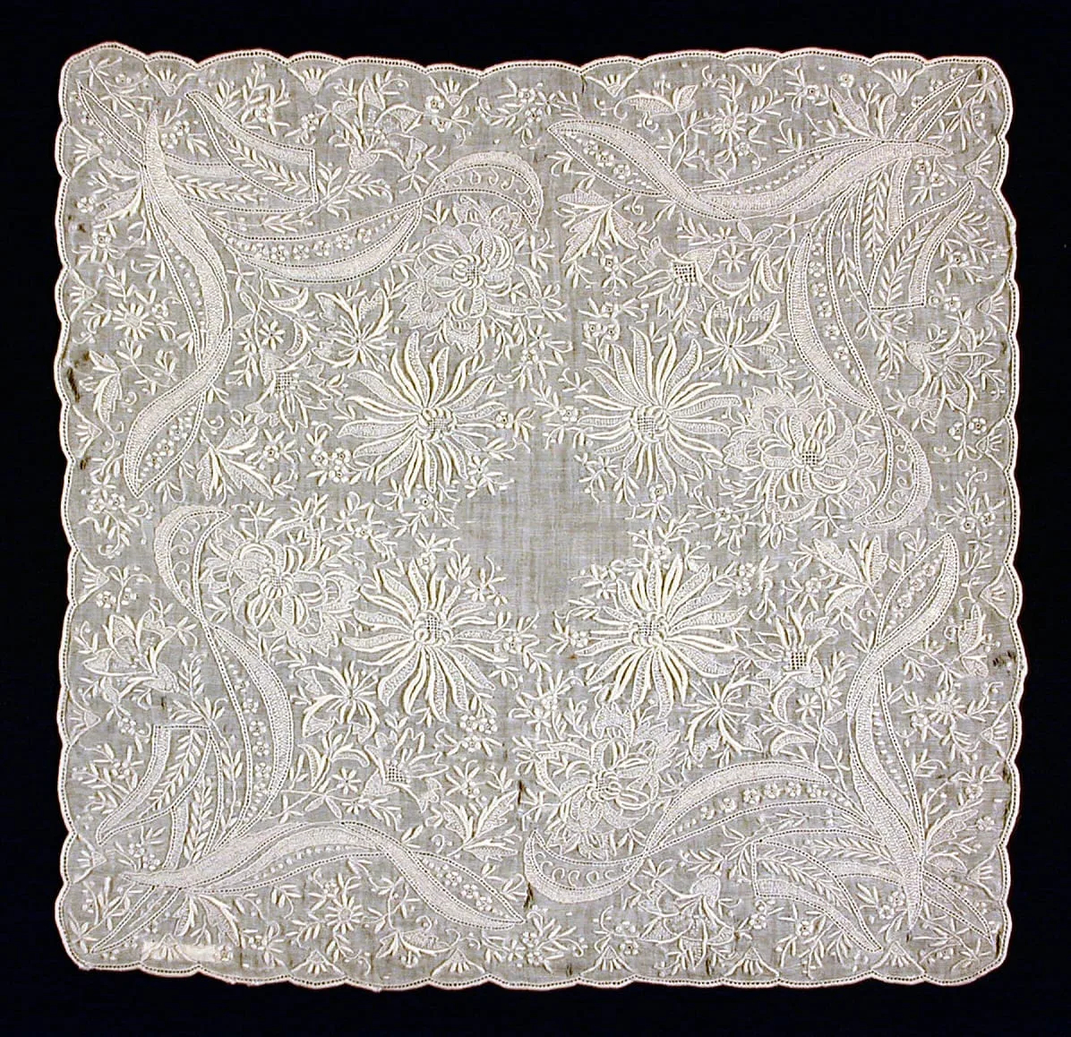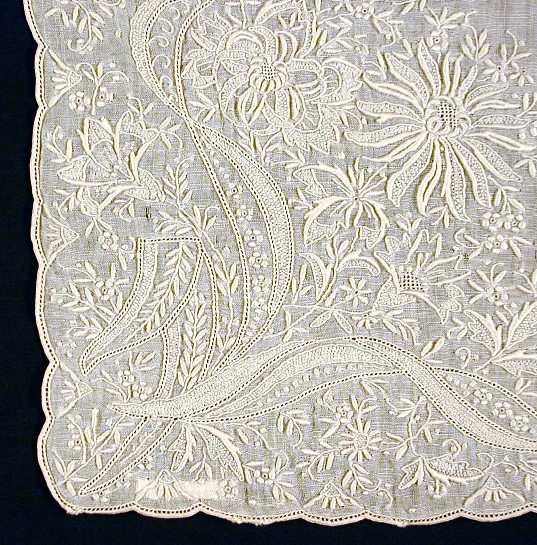 White-on-white embroidered linen handkerchief with scalloped border, densely worked floral and foliate motifs in satin stitch, with curving ribbon-like bands and delicate openwork details throughout.