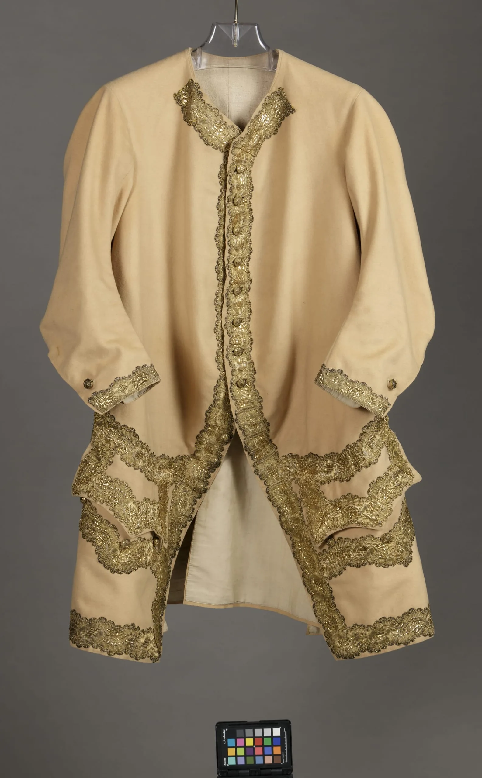 - Wool plain weave, fulled (broadcloth), with metallic-thread passementerie and metallic thread covered buttons