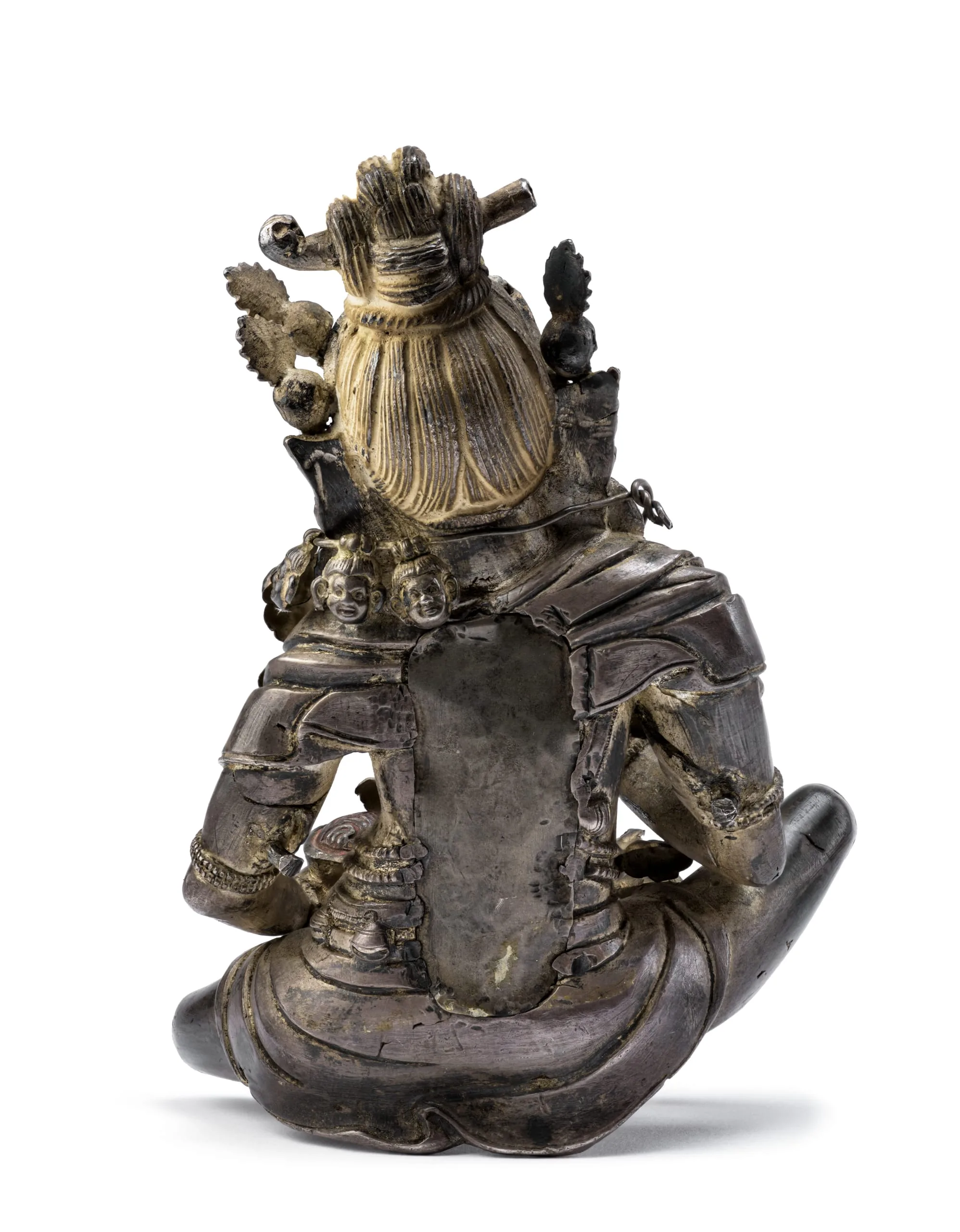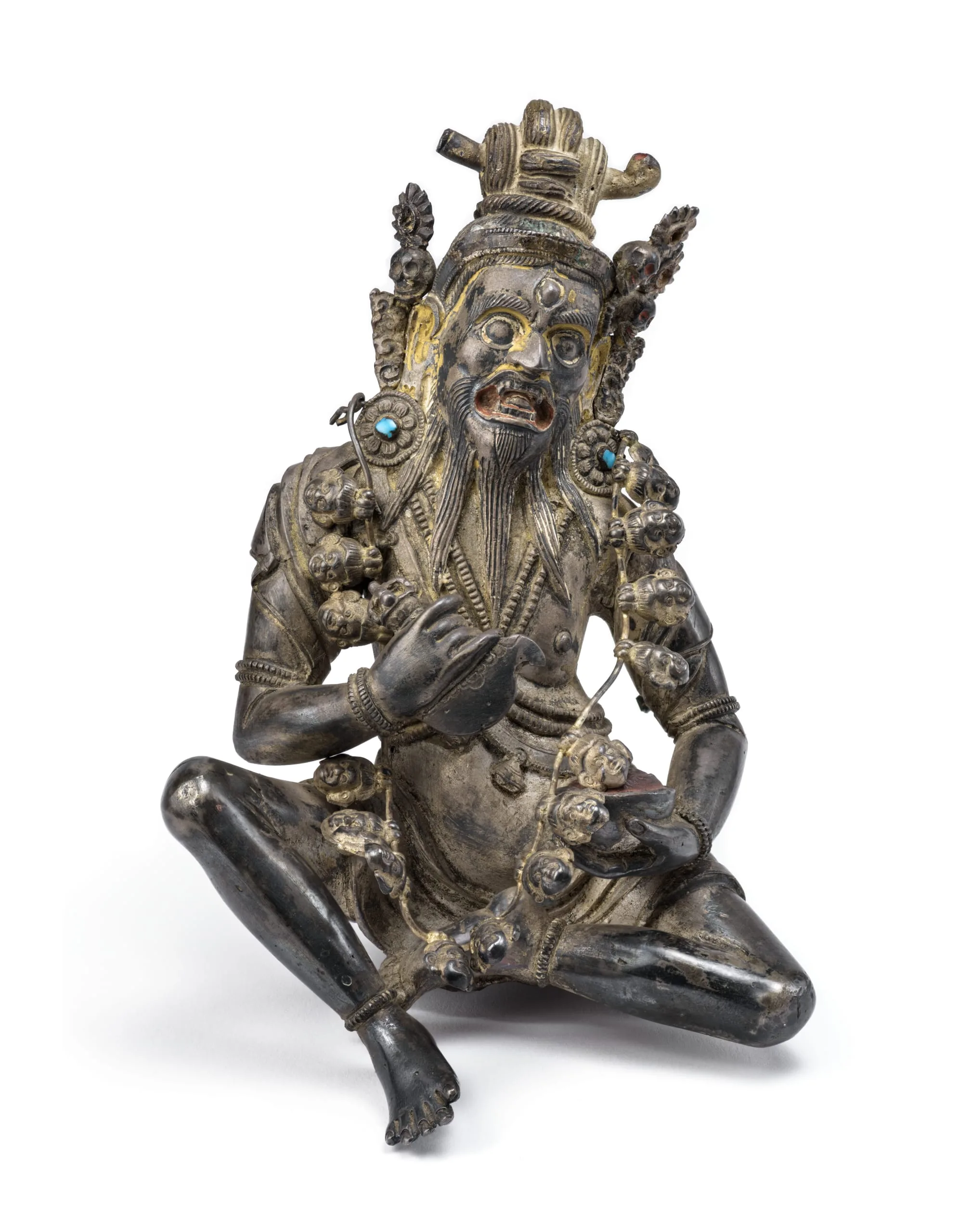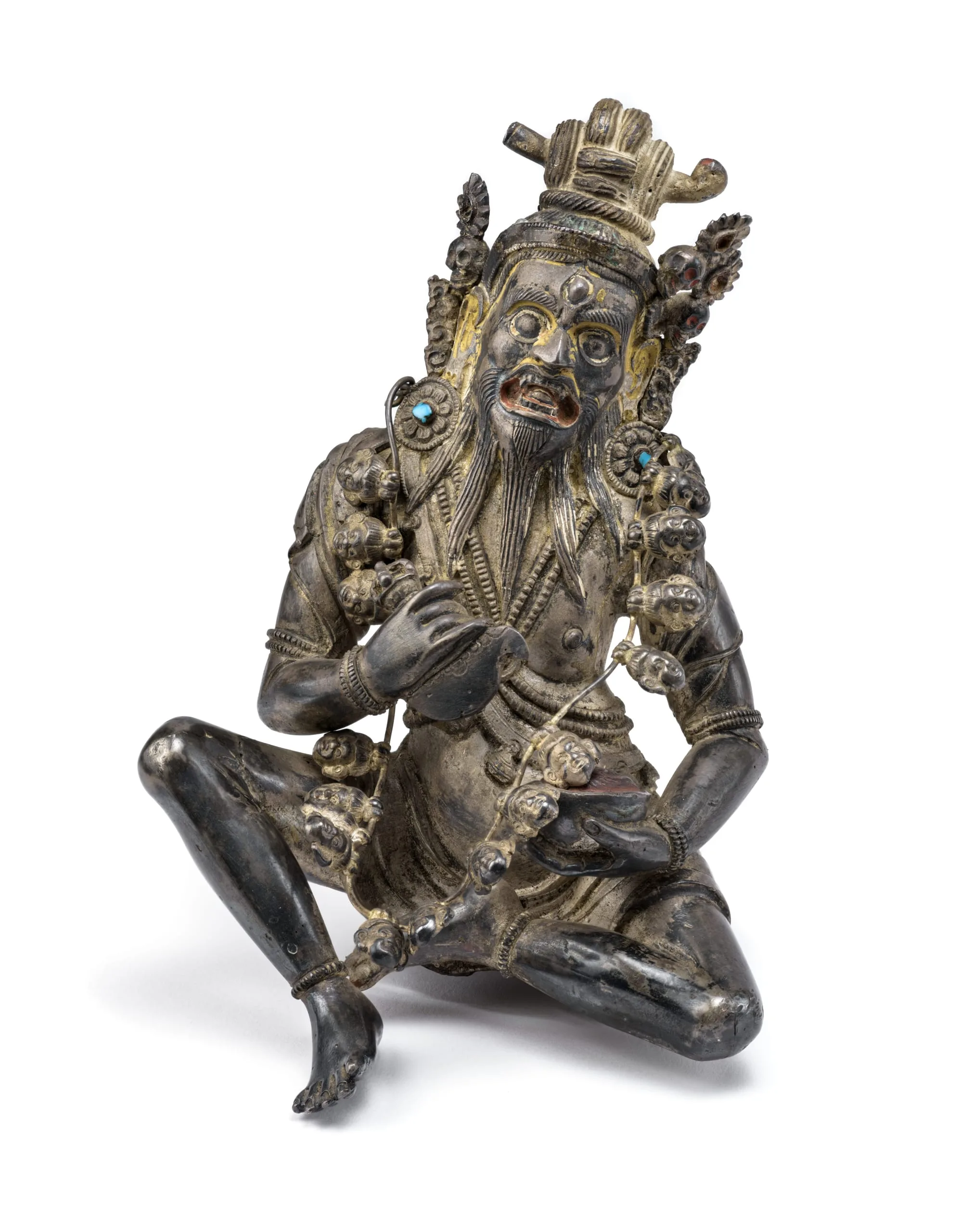 Mahakala is represented in this superbly crafted silver sculpture as Brahmanrupa Mahakala (Mahakala in the form of a Brahman). He sits in the relaxed posture (lalita asana) and has two arms holding a flaying knife (kartrika) in his right hand and a skullcup full of blood in his left hand. He is fearsome with glaring eyes, fangs, and a snarling mouth painted red on the inside, perhaps from drinking blood. Wearing a loincloth, shawl, and the cross-chest belt (chanavira) characteristic of ascetics and perfected beings (mahasiddhas), he has bone ornaments, including round lotiform earrings inlaid with turquoise, armlets, bracelets, anklets, and a long garland of freshly severed human heads. His ascetic’s matted hair is tied in a topknot pinned with a thighbone and adorned with a skull crown. The originally five skulls (two now lost) represent the transmutation of the five negative mental afflictions (kleshas) into the five transcendental Jina Buddhas. On the back of the figure, there is a large, plugged opening used to insert objects during consecration rites.