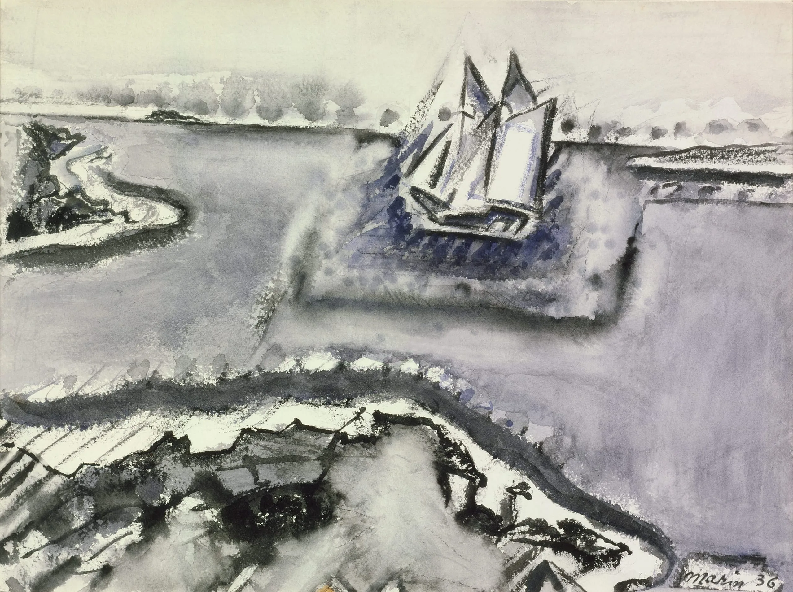 In 1933 Marin discovered Cape Split and the next year purchased property and a house overlooking Pleasant Bay, where he would summer for the rest of his life. The artist loved Maine, and its hills and shoreline became one of the main themes of his work. Cape Split, between Mount Desert and Eastport, was at that time not well known. Its isolation and rugged terrain may have been what initially attracted the artist to the site. Marin frequently painted the craggy shoreline of the Cape Split area during the mid-1930s, often, as in this scene, including a view of the bay and a sailboat.