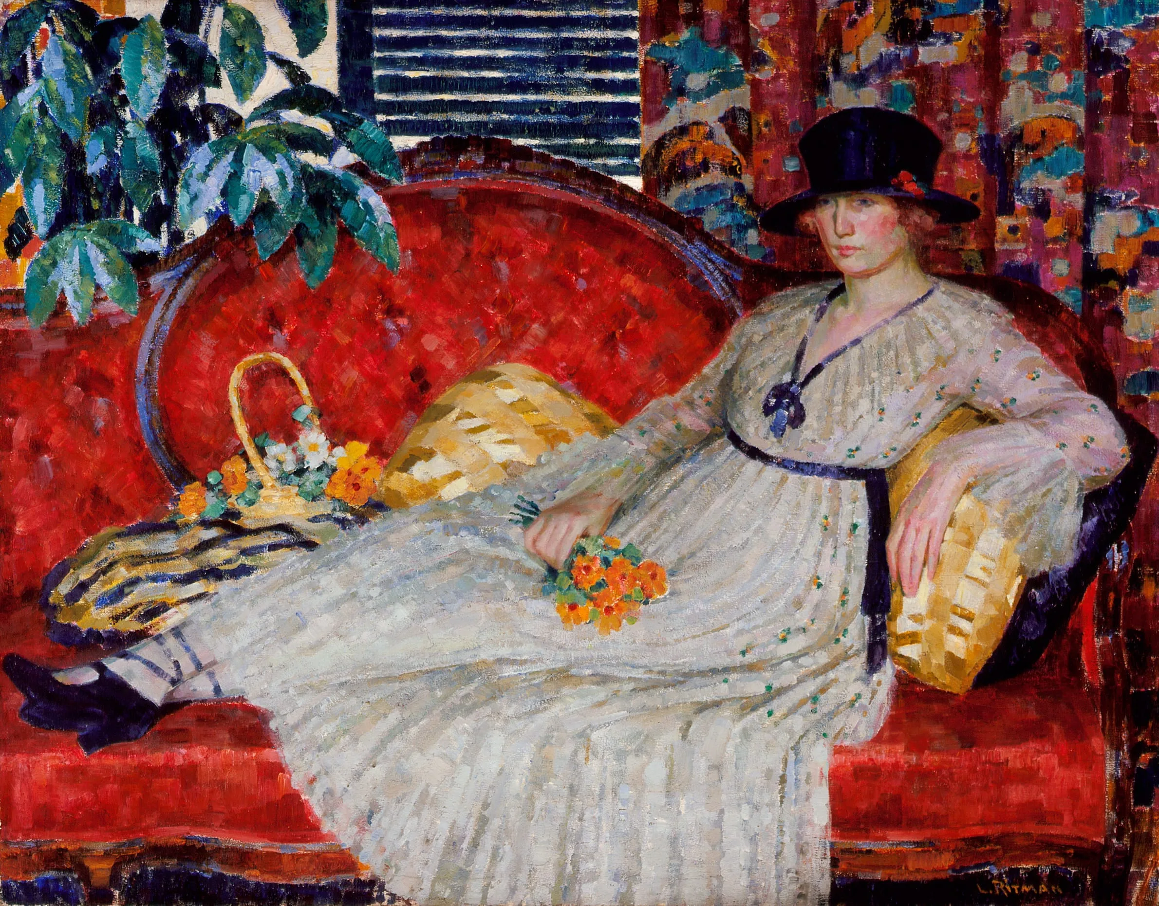 Ritman shared with other American impressionists who worked at Giverny a fondness for intimate boudoir and parlor scenes. Such images were used by FREDERICK CARL FRIESEKE and Ritman for the exploration of formal concerns, such as the action of sunlight in an interior. In Mademoiselle Gaby the young woman is at rest, holding a bunch of flowers that she has just picked. The woman’s static pose, like that of an odalisque, is countered by the movement of the decorative patterns of her dress and the curtains and by the flickering of the broken, impressionist brushwork. In the early 1920s Ritman’s palette deepened, as is evidenced by the warm red and blue of this paintin