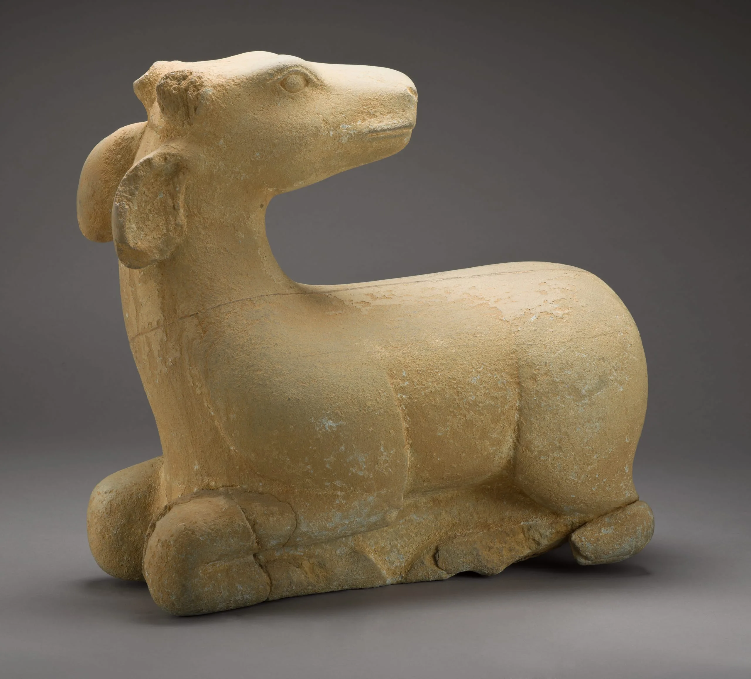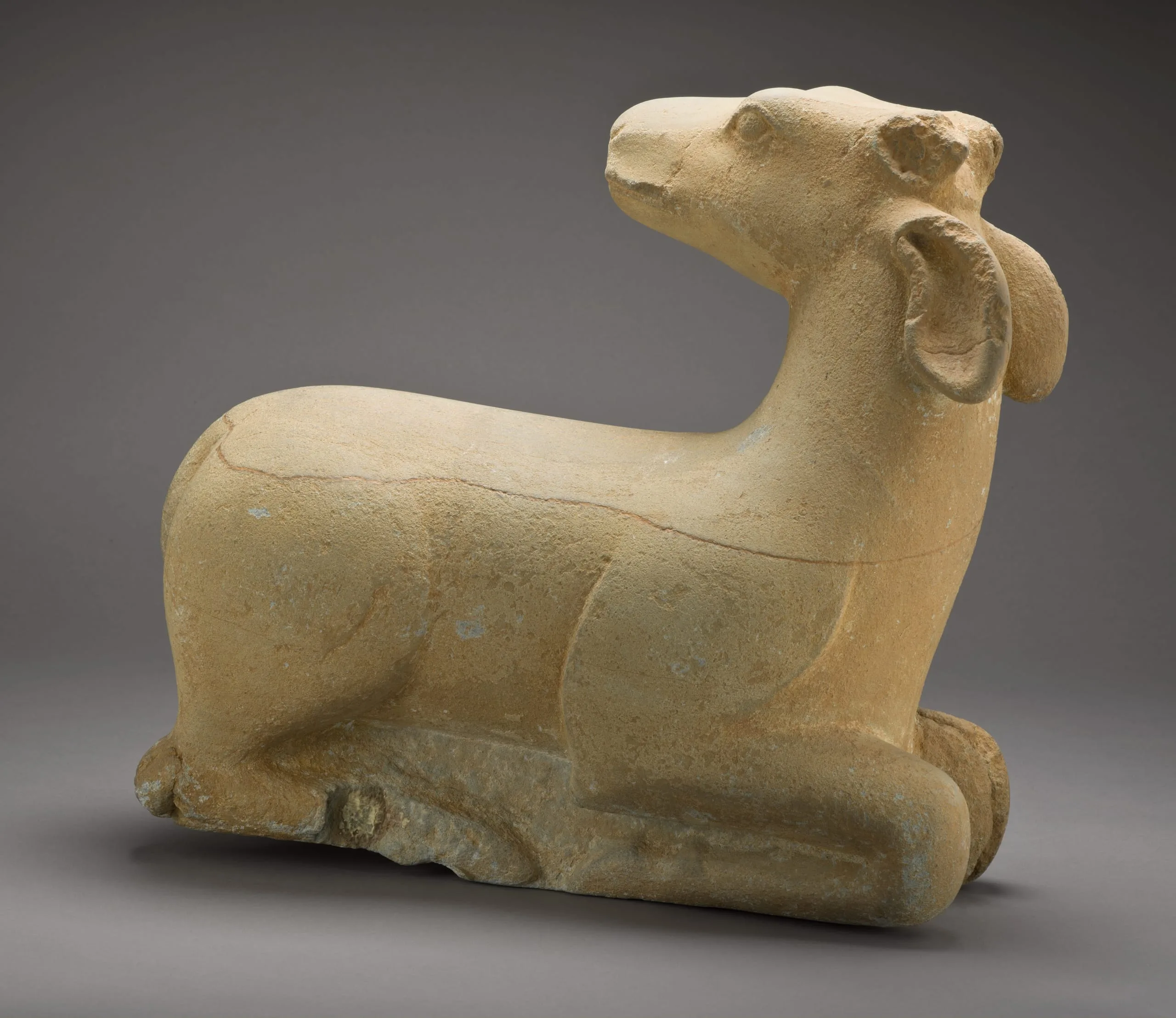This couchant deer carved of sandstone is one of a group of sculptures created in central Thailand during the Mon-Dvaravati Kingdom (7th-9th century). They evoke the Buddha Shakyamuni’s First Sermon after he achieved Enlightenment, which he preached in a peaceful ashram named the Deer Park at Sarnath, Uttar Pradesh, India. Similar deer flanking the Buddhist Wheel of the Law (Dharma Chakra) are found in countless reliefs throughout Asia. Only in Thailand, however, are the deer represented fully sculpted in the round and freestanding. Another Thai innovation, apart from parallel but unconnected examples found in the art of ancient Gandhara (present-day northwest Pakistan and northeast Afghanistan) in the 3rd century BCE-3rd century CE, is that the Dvaravati deer feature a back-turned head. Previously, the deer were generally represented facing or looking up at the Wheel rather than looking towards the rear. Other stylistic characteristics of the naturalistically rendered Dvaravati deer include their kneeling front legs, lowered ears, outlined eyes, lowered tail, and short projections for horns (possibly with metal or wood horns separately attached). The LACMA deer’s horns are now damaged. Although a direct artistic source for the Dvaravati deer is yet to be determined, they were clearly important and popular visual symbols of Buddhist doctrine. (Brown 2013)