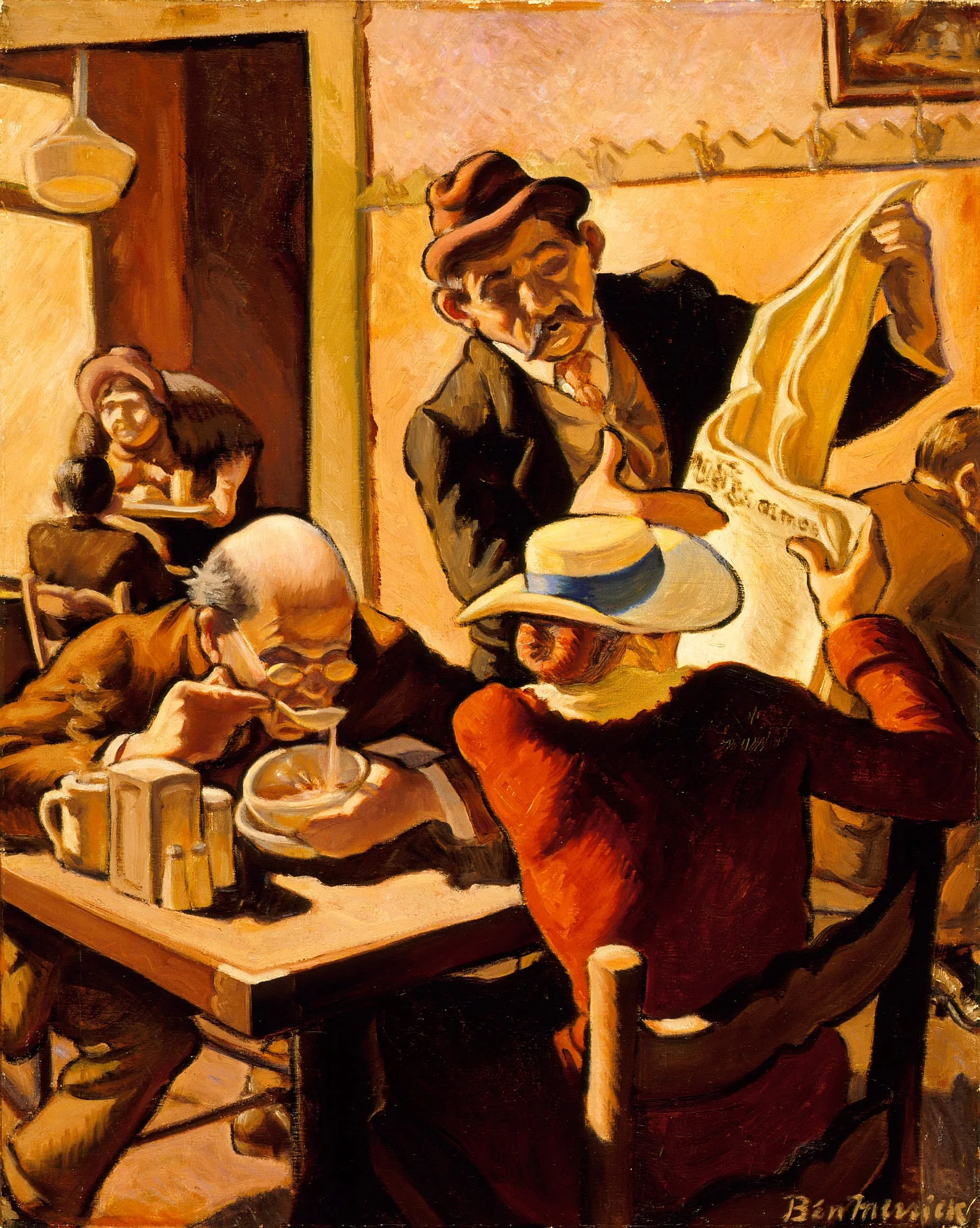 This is an early painting, probably of the late 1930s, which was exhibited in Messick’s first solo exhibition. It demonstrates his socialrealist tendencies in its depiction of ordinary people engaged in everyday activities of a life that is far from luxurious but is still respectable. A man shares a newspaper with a faceless woman while an elderly gentleman hungrily slurps his soup in a sparsely furnished restaurant.