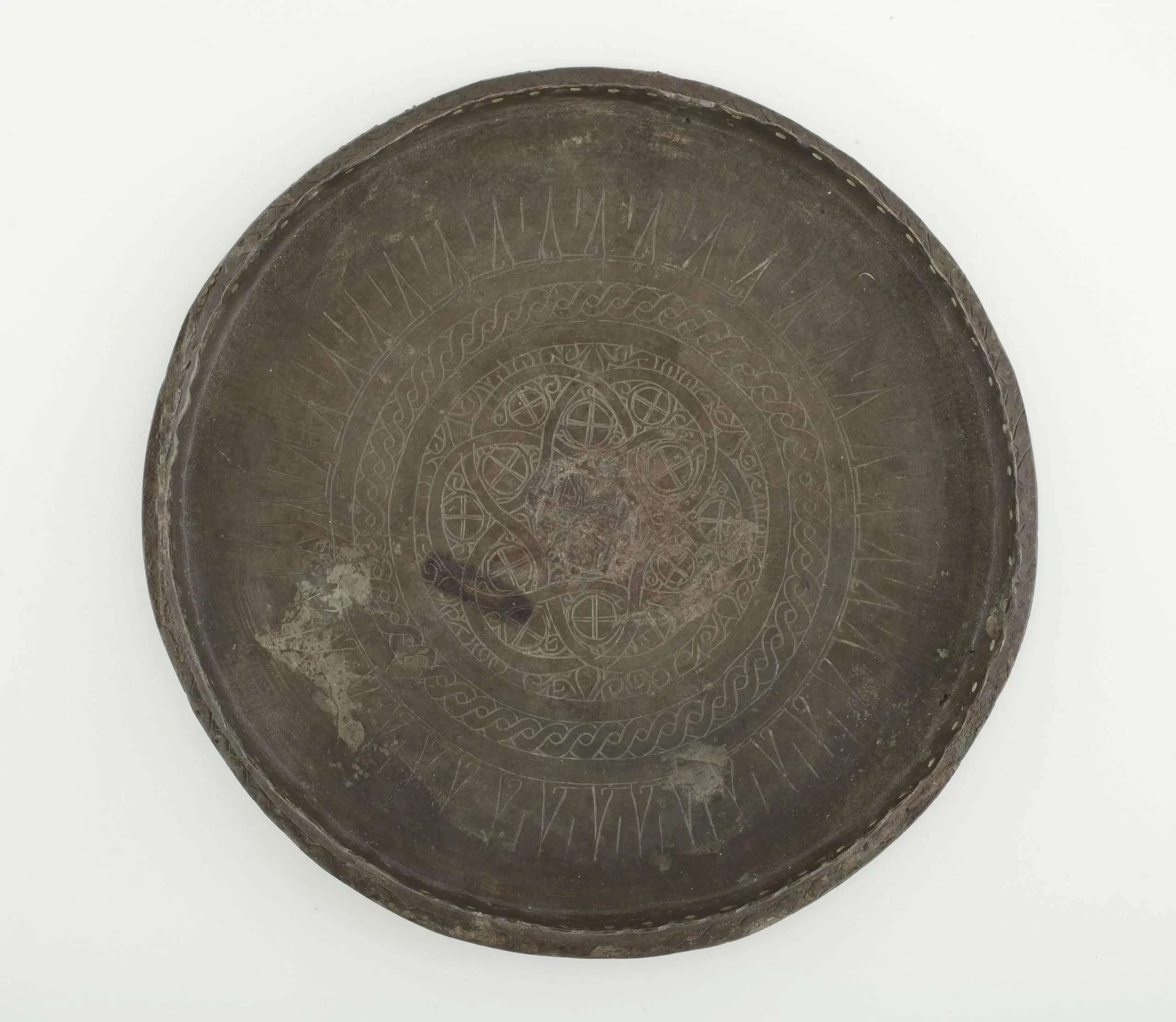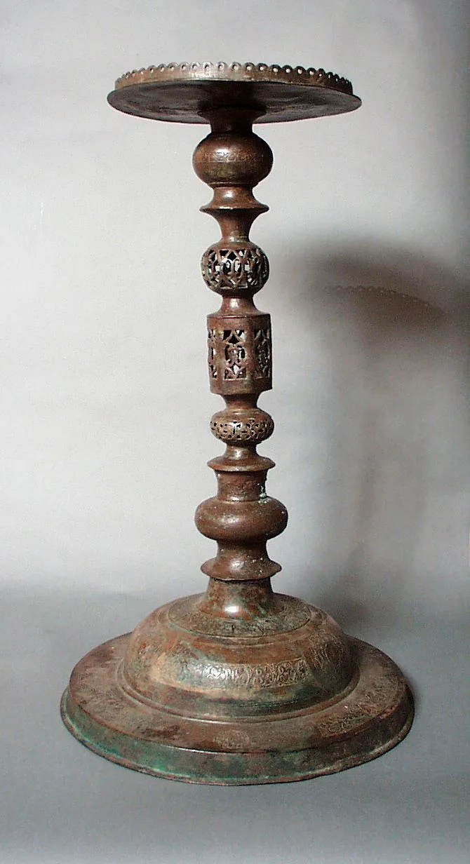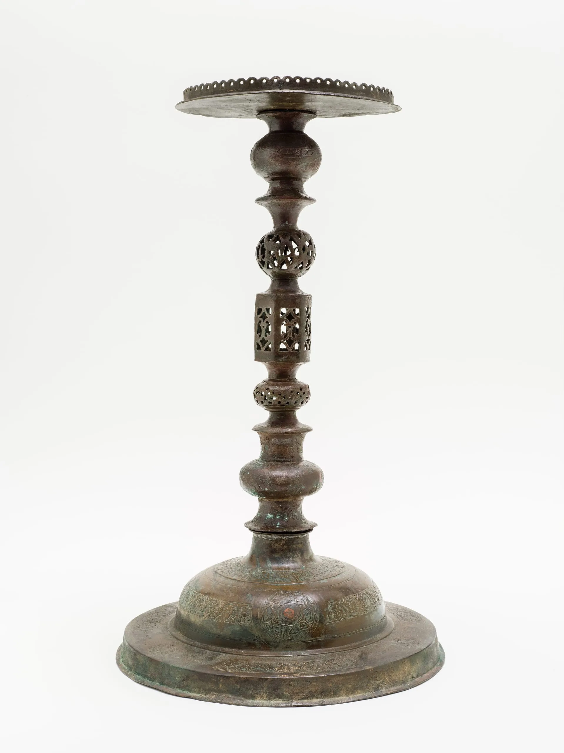 This bronze lampstand was cast as three main component parts: a base, a shaft composed of multiple elements and a tray, the latter of which was designed to hold a separate oil lamp. The three primary sections are fitted together by flanges and sockets that lock in place when turned, allowing for the lampstand to be easily assembled for use or disassembled for transport and storage.