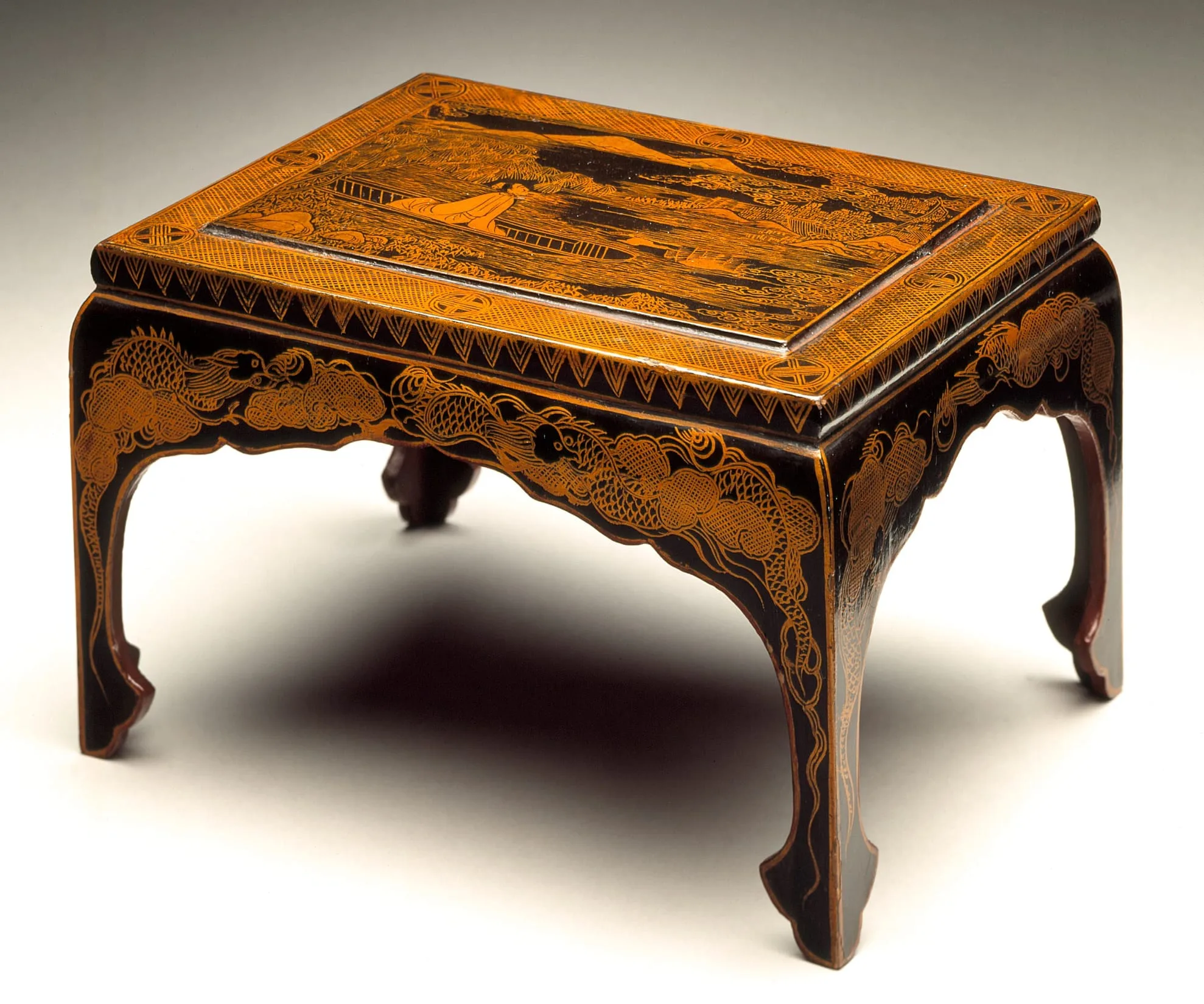 - Black lacquer on wood core with gold-leaf painted decoration (hakue in Japanese)