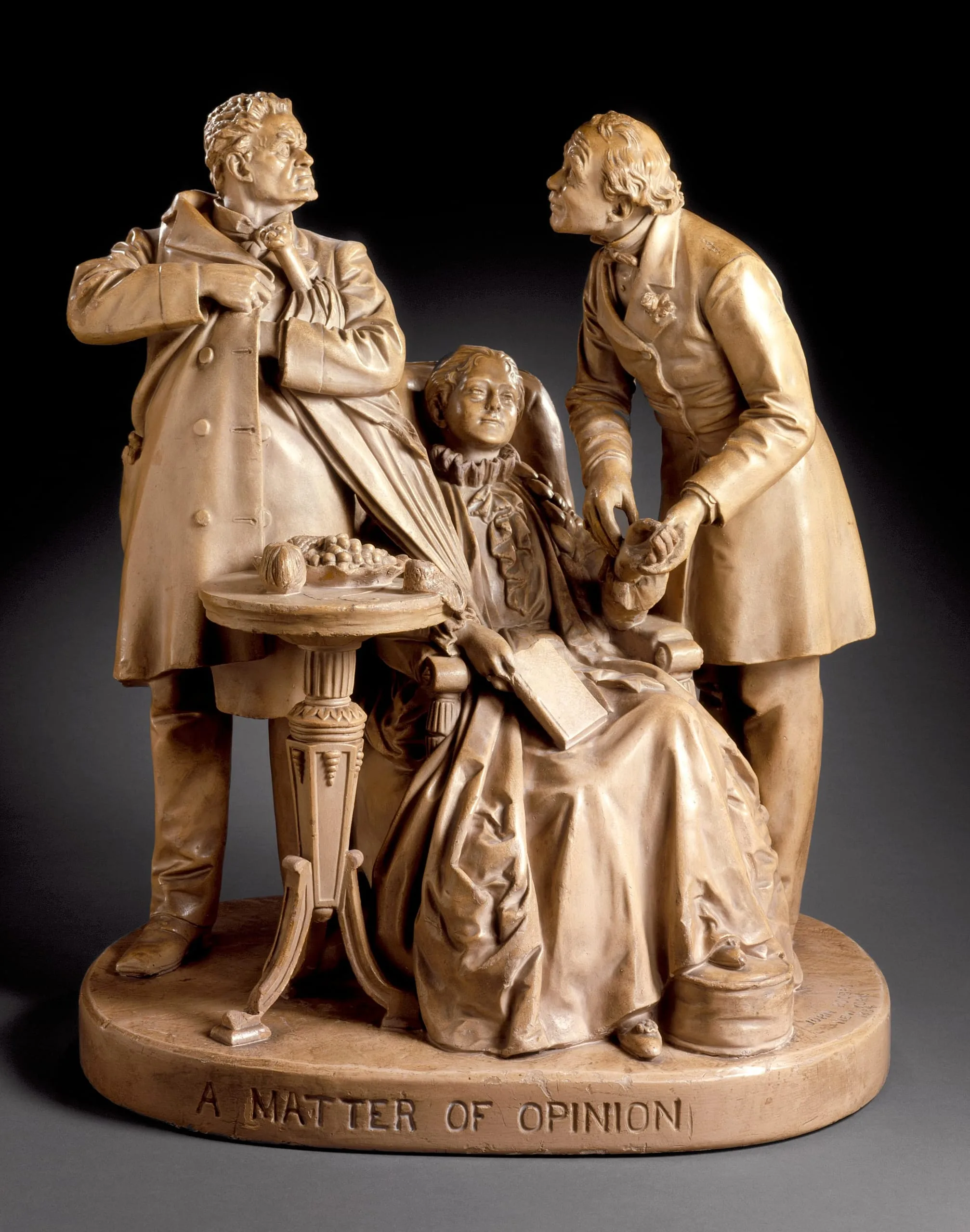 A Matter of Opinion is a standard Rogers composition: three figures are arranged symmetrically and convey the story through their poses and expressions. The sculptor described his humorous representation as "a consultation of physicians over an invalid lady-which results in an evident disagreement." One physician, taking the woman’s pulse, gives his opinion, while the other, obviously indignant over the diagnosis, reacts by glaring at his opponent and buttoning his coat to leave. Typical of Rogers’s late groupings are the wealth of detailed accessory objects, close placement of the figures, and sense of movement.