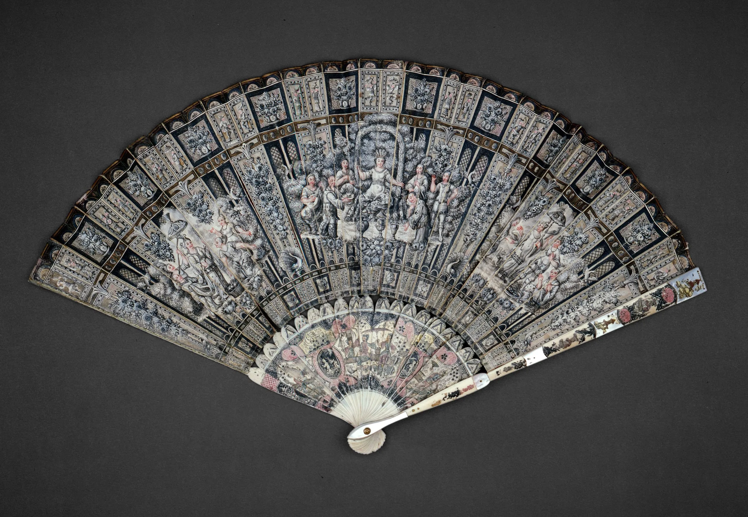 - Silk leaf, ivory sticks, ivory guards with mother-of pearl-inlay, brass metallic rivet