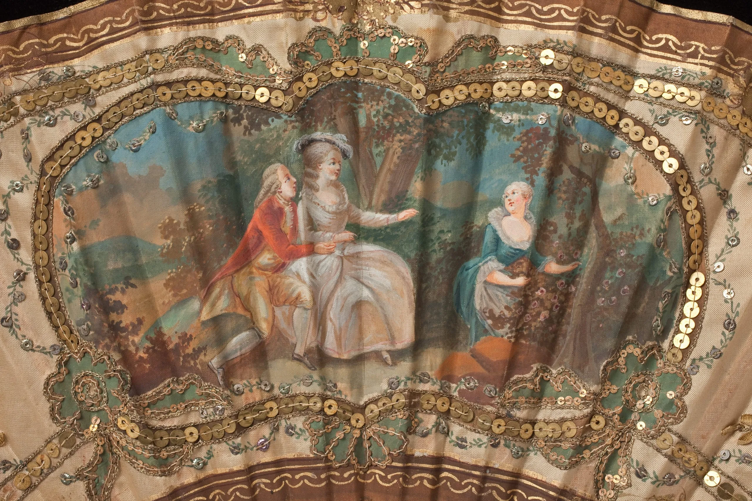 - Silk plain weave, painted, with silk ribbon, sequins, and metallic-thread embroidery, and bone