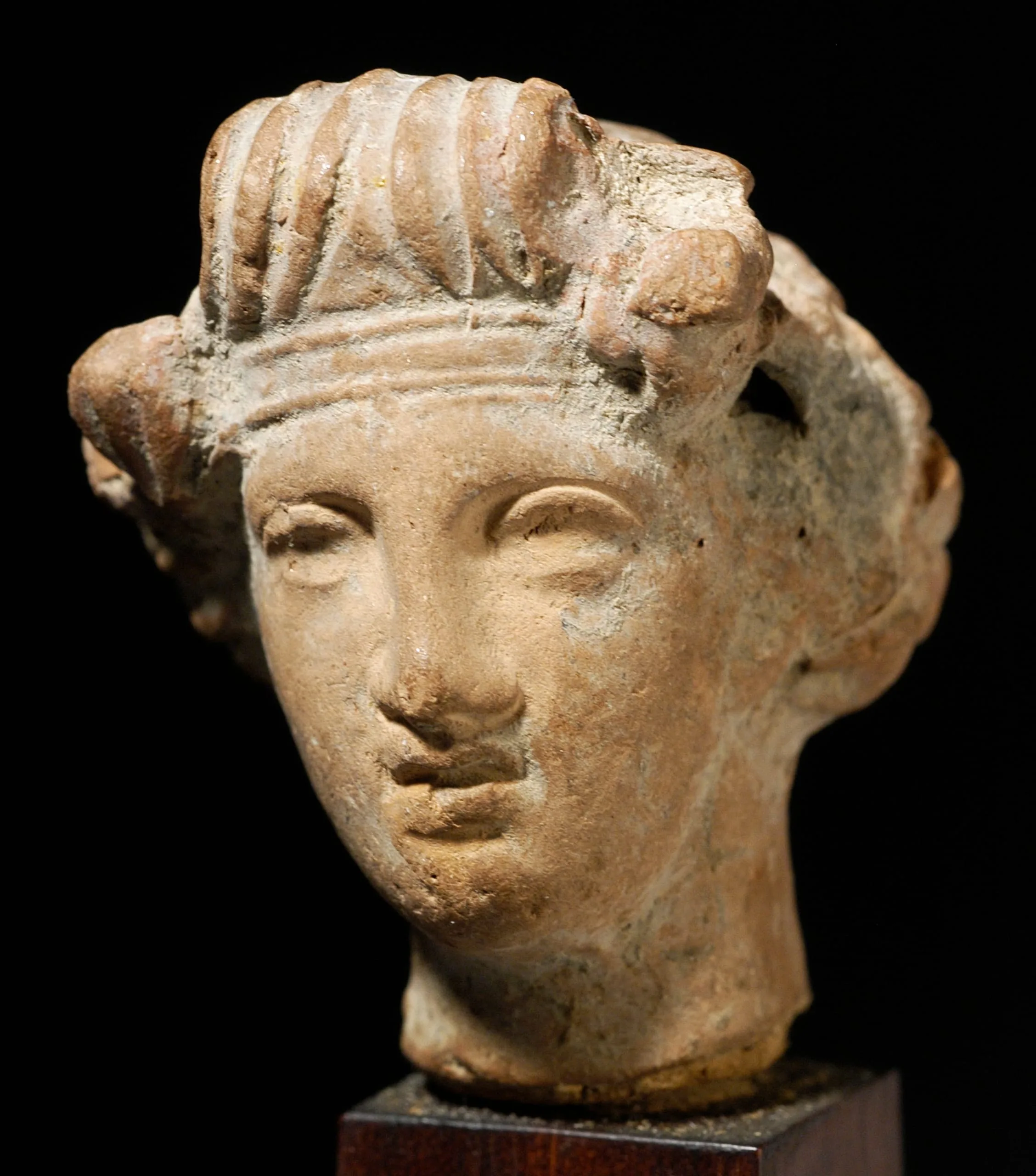 Small terracotta sculpture of a human head with ridged hair and a diadem, mounted on a dark pedestal, sandy buff clay with russet and gray-green weathering