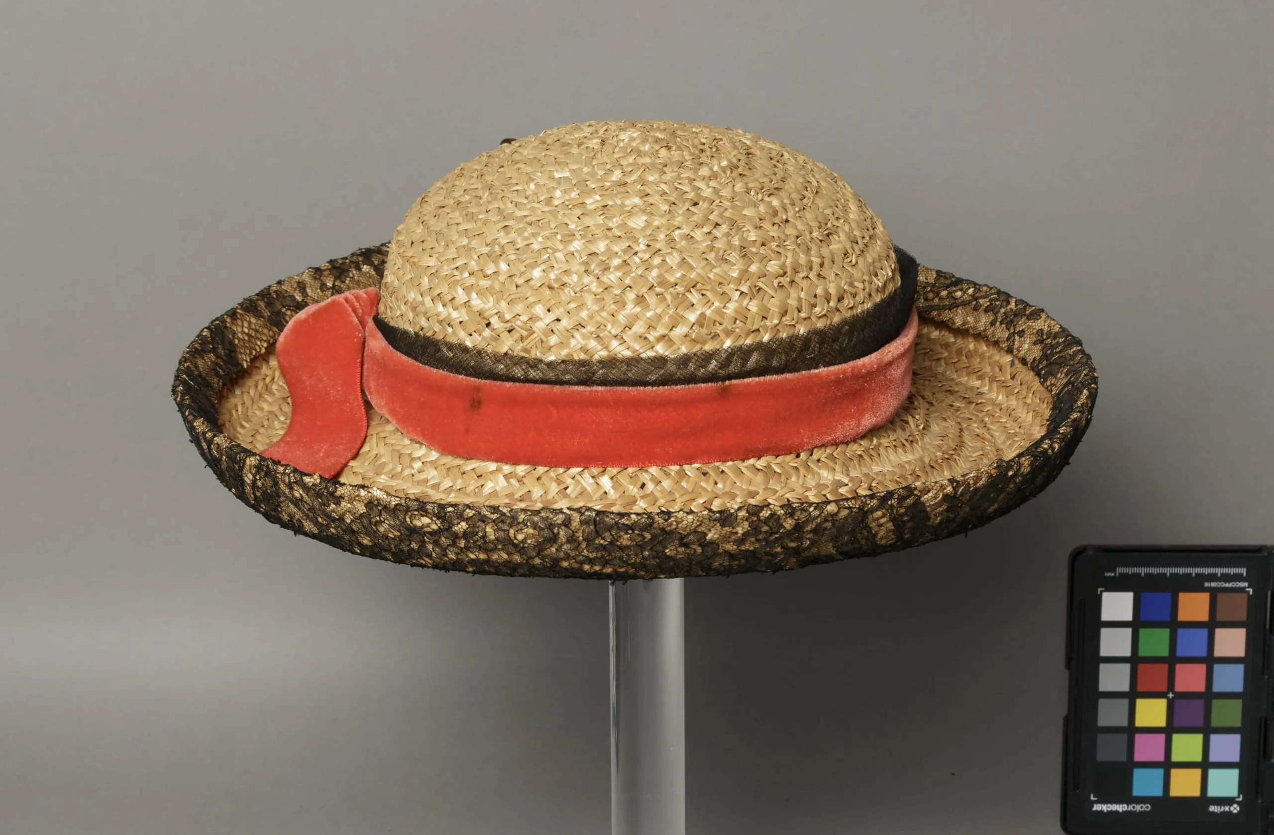 - Woven straw, velvet ribbon