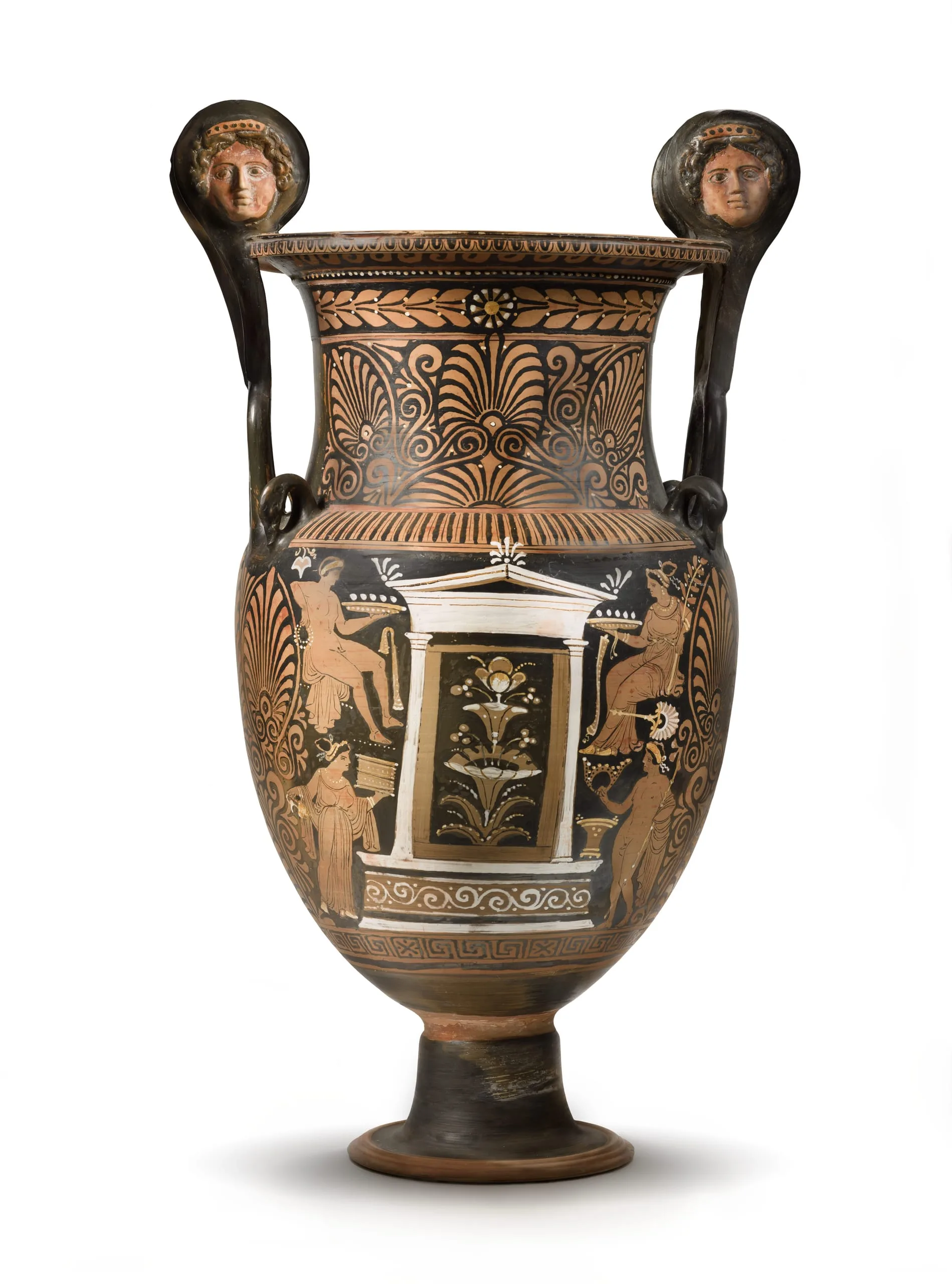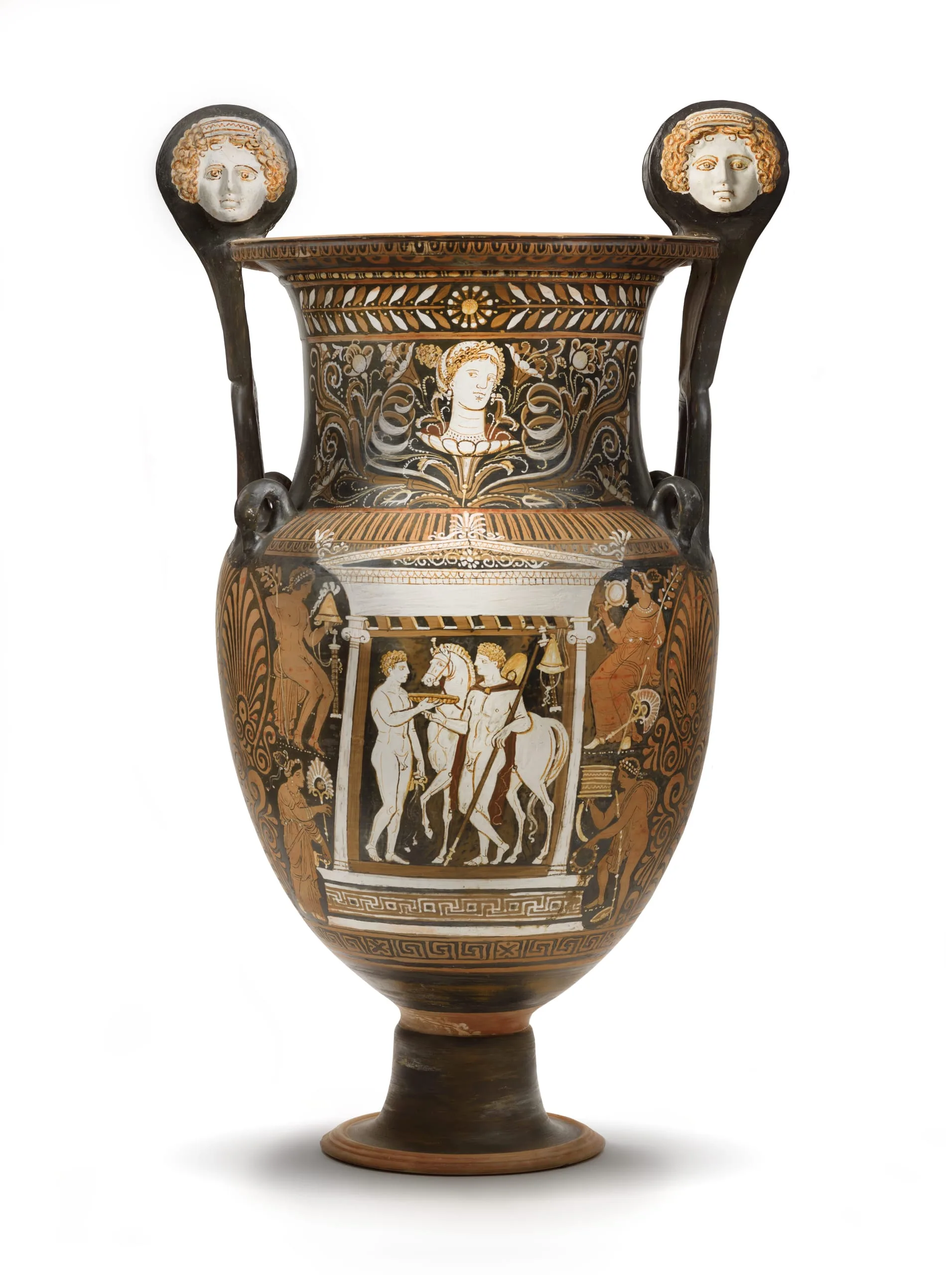 - Volute-Krater with (A) Two Youths with a Horse in a Naiskos and (B) Floral in Naiskos