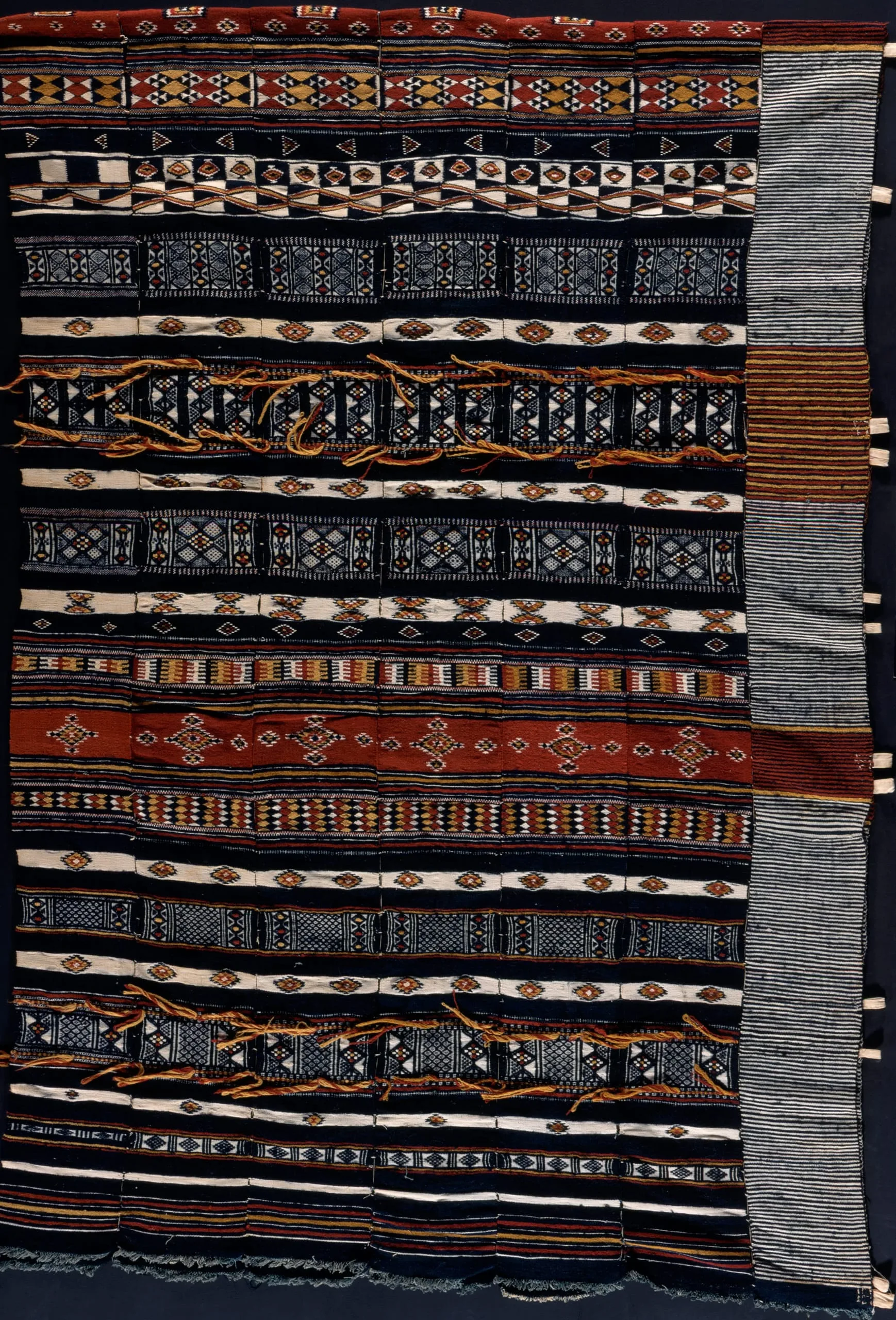 - Wool and cotton plain weave with wool discontinuous supplementary weft patterning, with tapestry weave and wool embroidery