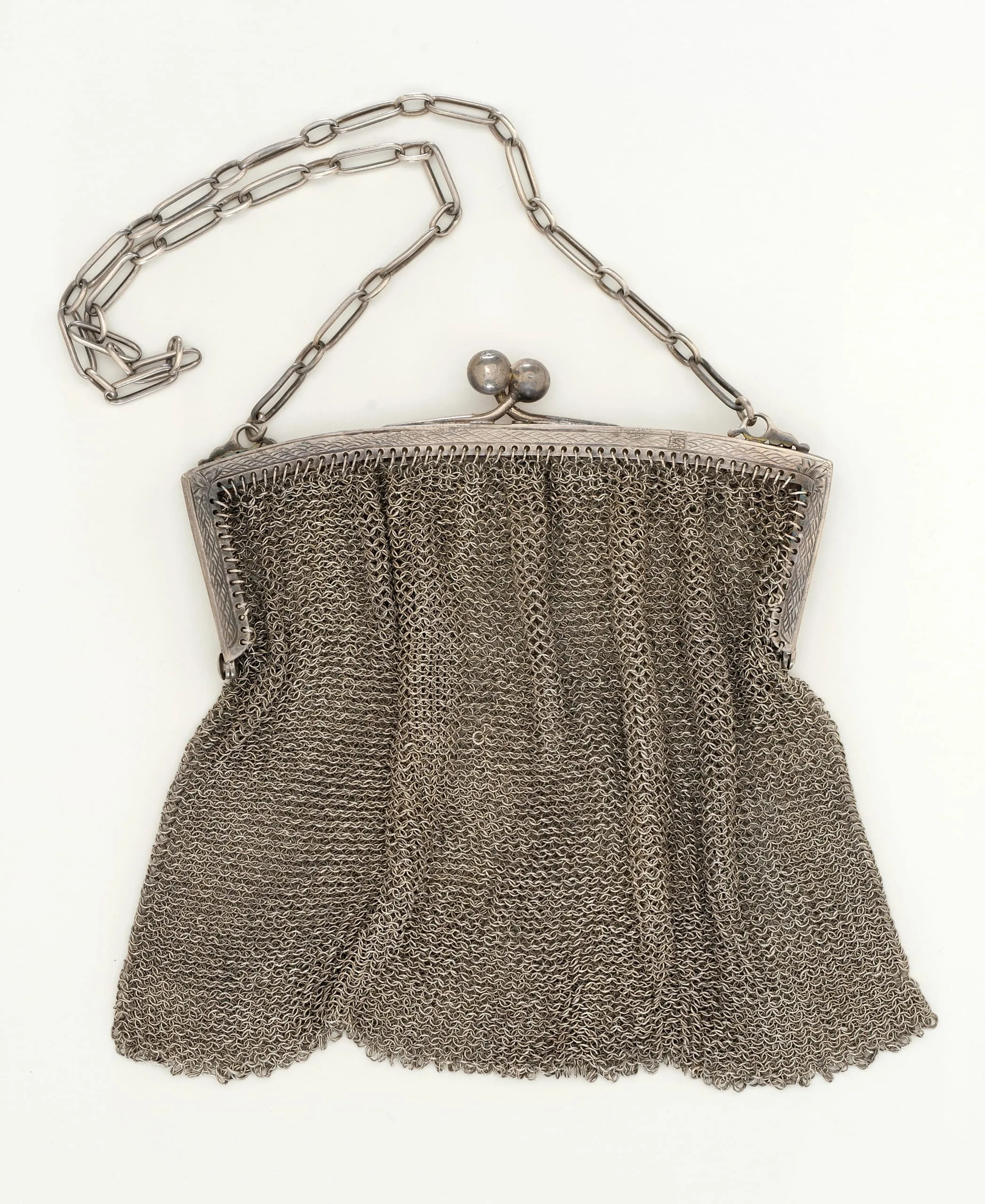 Silver-toned metal mesh handbag with kiss-lock ball clasp closure, pleated chainmail body, scalloped hem, and elongated oval-link chain handle