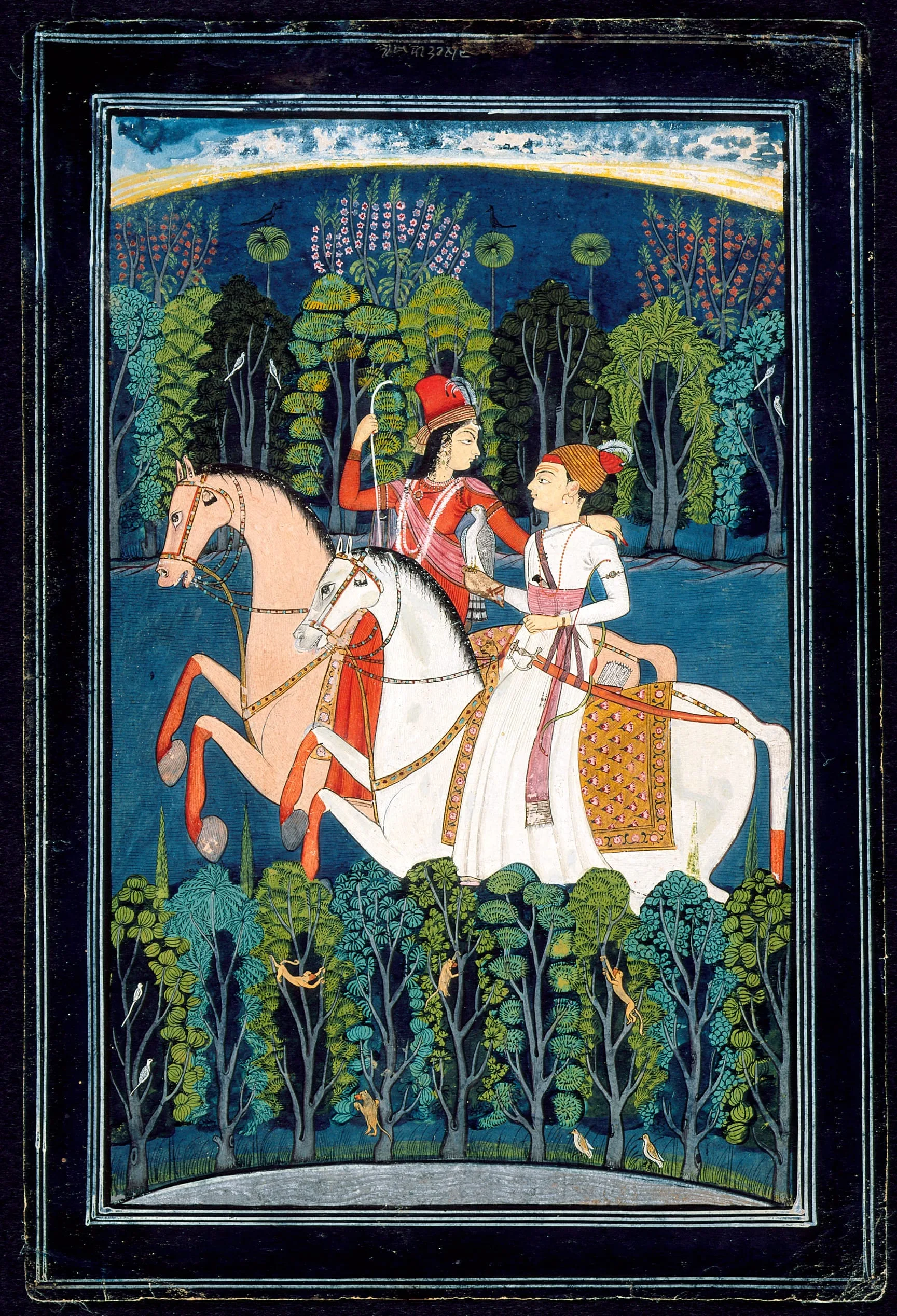 This painting illustrates the famous love story of Sultan Baz Bahadur (r. 1555-1562) and his beloved Hindu Queen Rupmati who ruled the Malwa Sultanate from the capital of Mandu. Baz Bahadur and his forces were defeated by the invading Mughal army of Emperor Akbar (r. 1556-1605) in the battle of Sarangpur in 1561. Rupmati was captured and, in accordance with the age-old Hindu marital practice, virtuously committed suicide. According to the tragic tale, Rupmati kept her husband from straying by joining him on midnight hunts. Illustrations of the royal couple hunting typically portray them on horseback riding through a forest or hunting antelope or sometimes hawking.