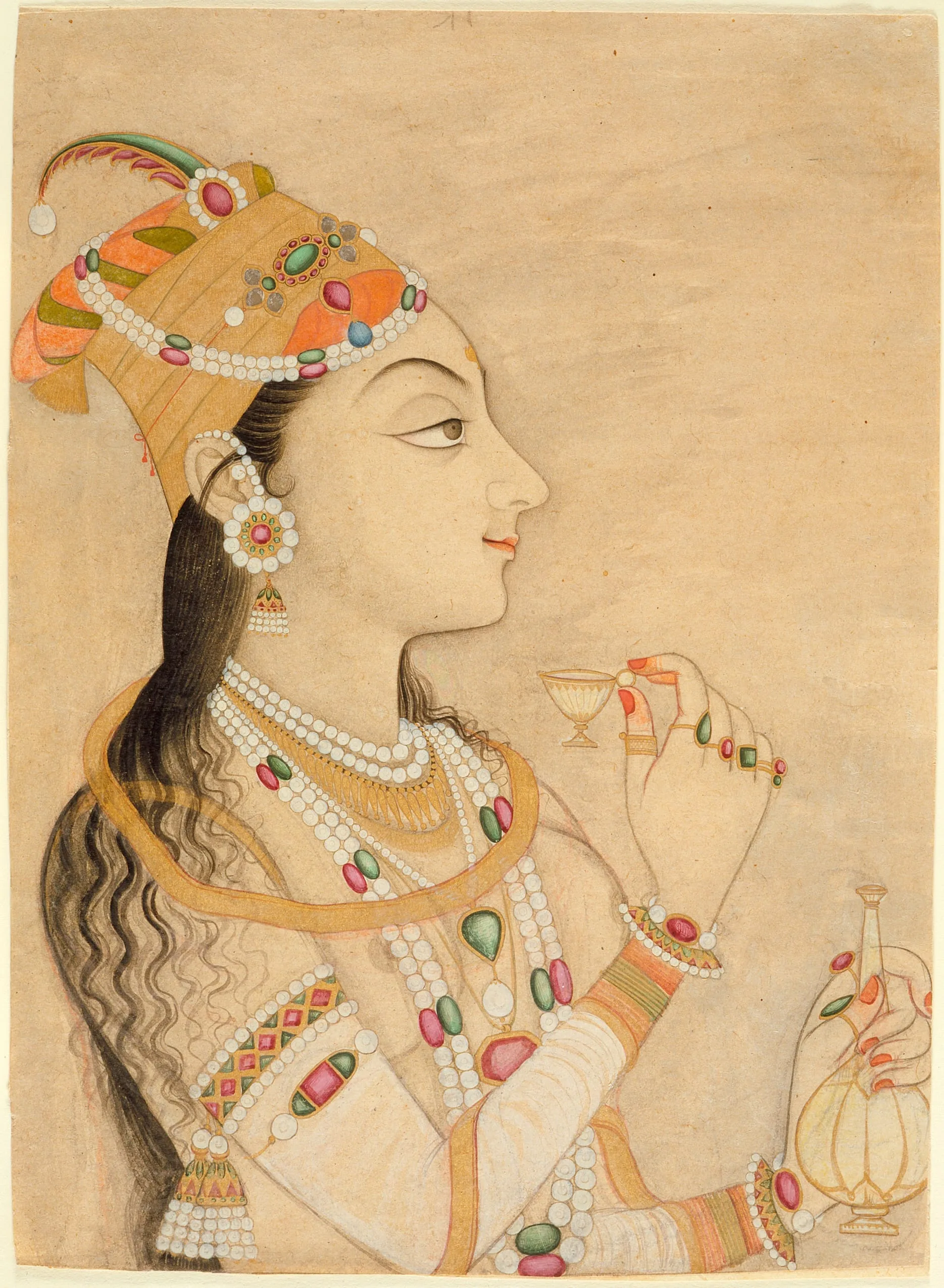 The Mughal Empress Nur Jahan (birthname: Mihrunissa) was born in 1577 in Kandahar, Afghanistan. Nur Jahan was the favorite wife of the Mughal Emperor Jahangir (r. 1605-1627). She was the daughter of the Persian noble Mirza Ghiyas Beg (later known as Itimaduddaula (Pillar of the State), Prime Minister of the Mughal Empire, 1611–1622) and his wife Asmat Begum. She was married at the age of seventeen to the Iranian Sher Afgan Khan (or Ali Quli Istajlu, d. 1607), who subsequently killed Jahangir’s foster brother Qutbuddin Khan Koka (1569-1607). In 1607, after her husband was slain in retaliation, Nur Jahan was brought to Agra and served as a handmaiden to Jahangir’s mother, Ruqaiya Sultan Begum (circa 1542-1626). In 1611, she met Jahangir at a bazaar during the Nowruz festival and was wed shortly thereafter. Due to her husband’s frequent incapacitation due to alcohol and opium, she became the power behind the throne. She conducted trade with foreign merchants, managed court finances, minted coins in her own name, and designed Mughal gardens. After Jahangir’s death in 1627, Nur Jahan spent the remainder of her life confined in Lahore with her widowed daughter and granddaughter. Nur Jahan maintained a legendary appeal long after her death in 1645. Representations of a beautiful princess, such as this painting, are traditionally identified as idealized images of the Mughal Empress. A comparable portrait of Nur Jahan is in the Victoria and Albert Museum, London (IM.37-1912).