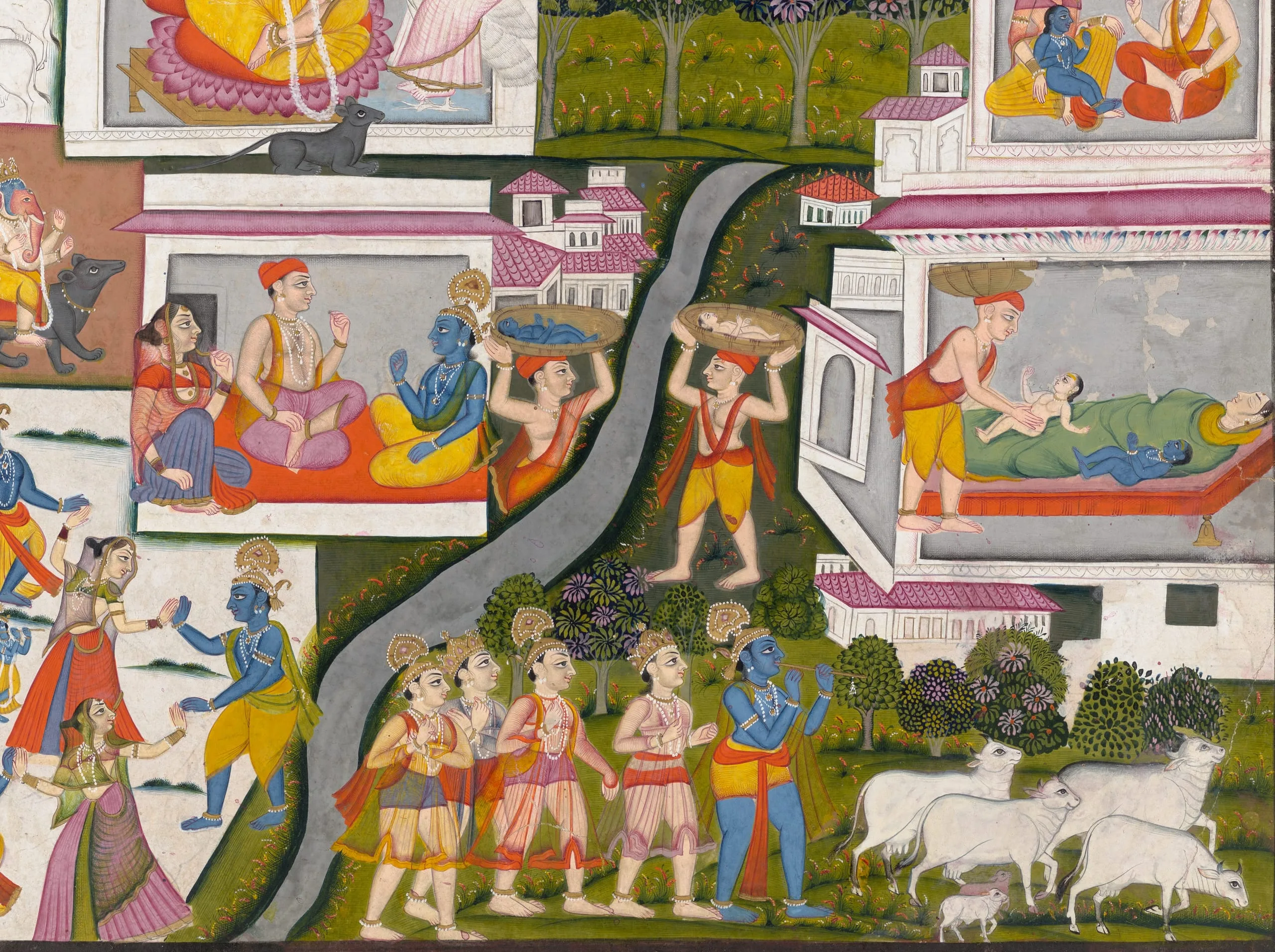 This multi-vignette illustration depicts several episodes from the life of Krishna, including the exchange of baby Krishna for Yashoda’s daughter by Krishna’s father Vasudeva fording the Yamuna River (center and right), Krishna fluting with the cowherds (gopas) in Vrindavan (lower right), Krishna's Dance of Delight (Rasa Lila) (lower center), and Krishna enthroned with Radha (upper left). The visual invocatory deities, the elephant-headed Ganesha and Sarasvati riding her swan mount, are in conversation in a pavilion (upper center). On the left area the four-headed Brahma seated on a lotus and an ascetic listening to a musician in a landscape.