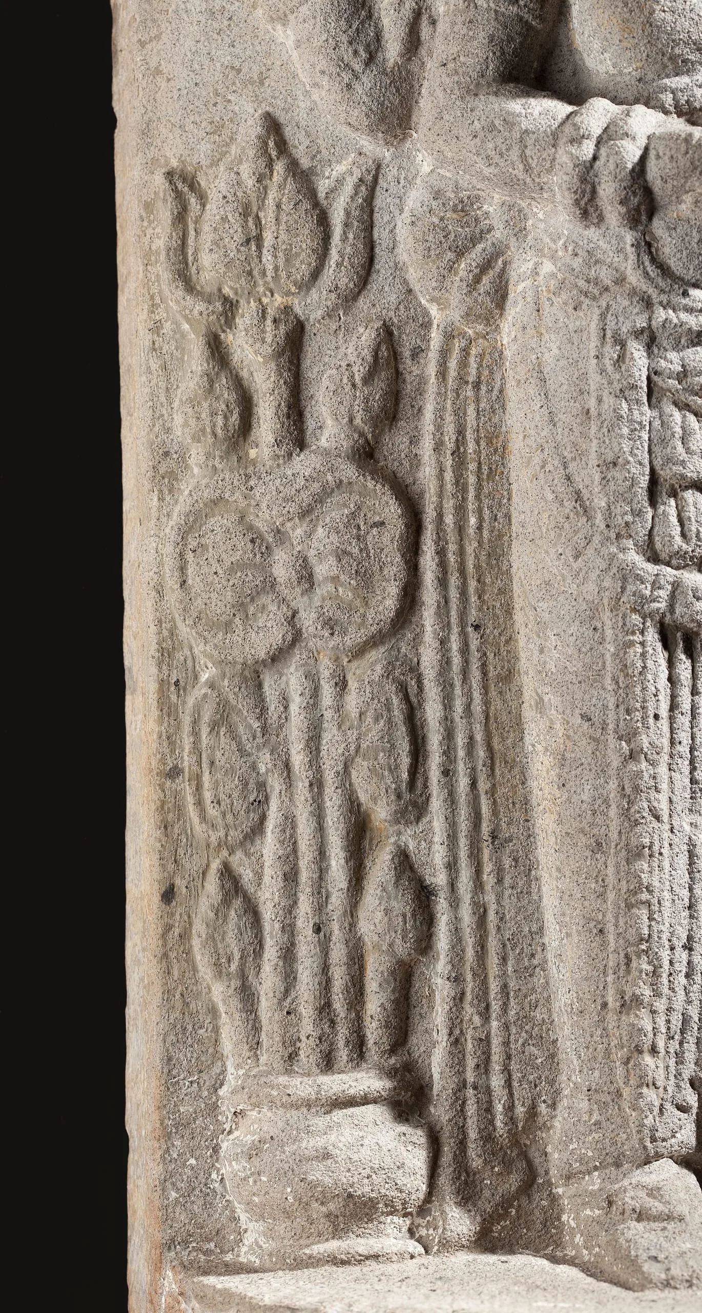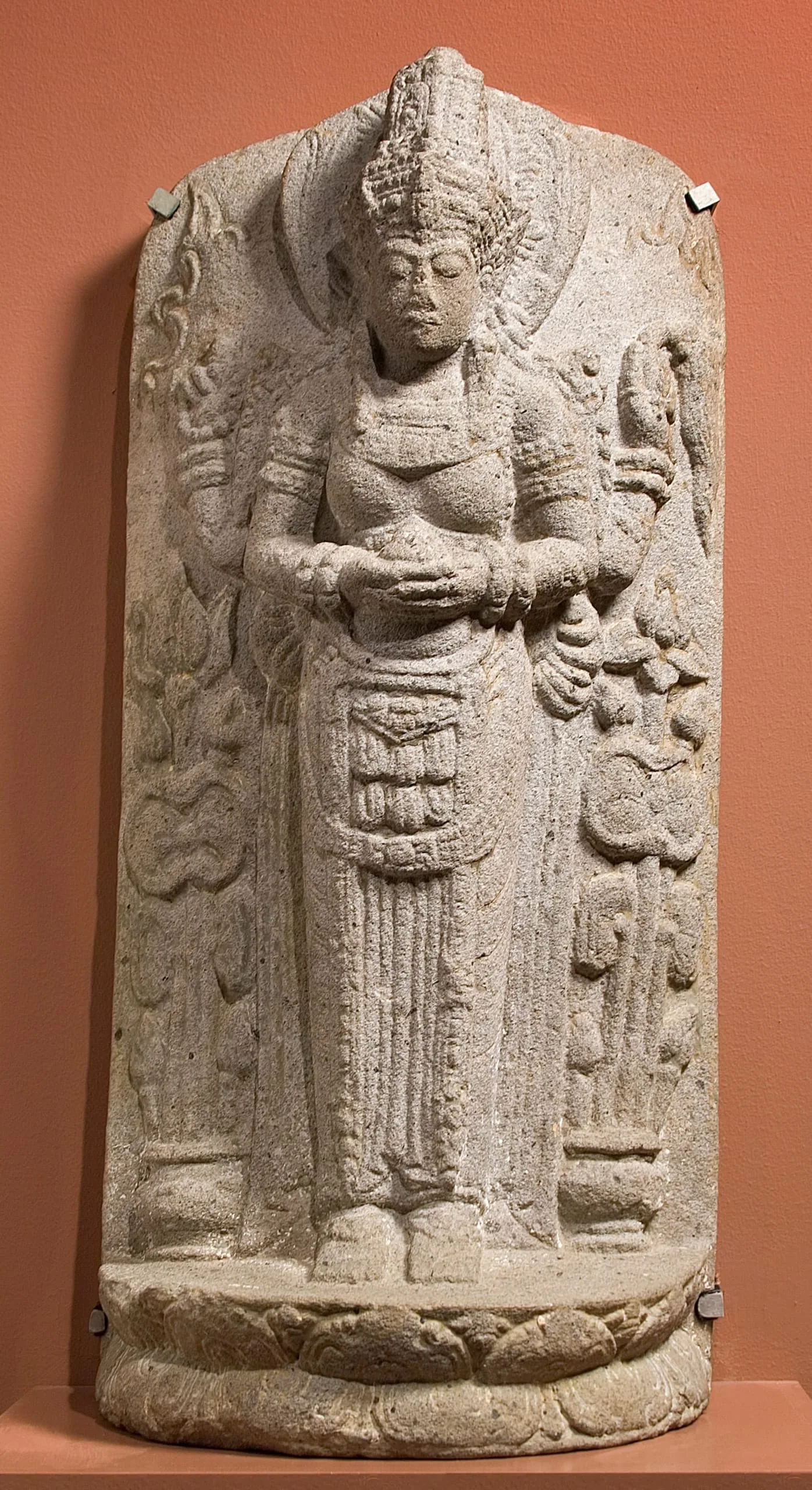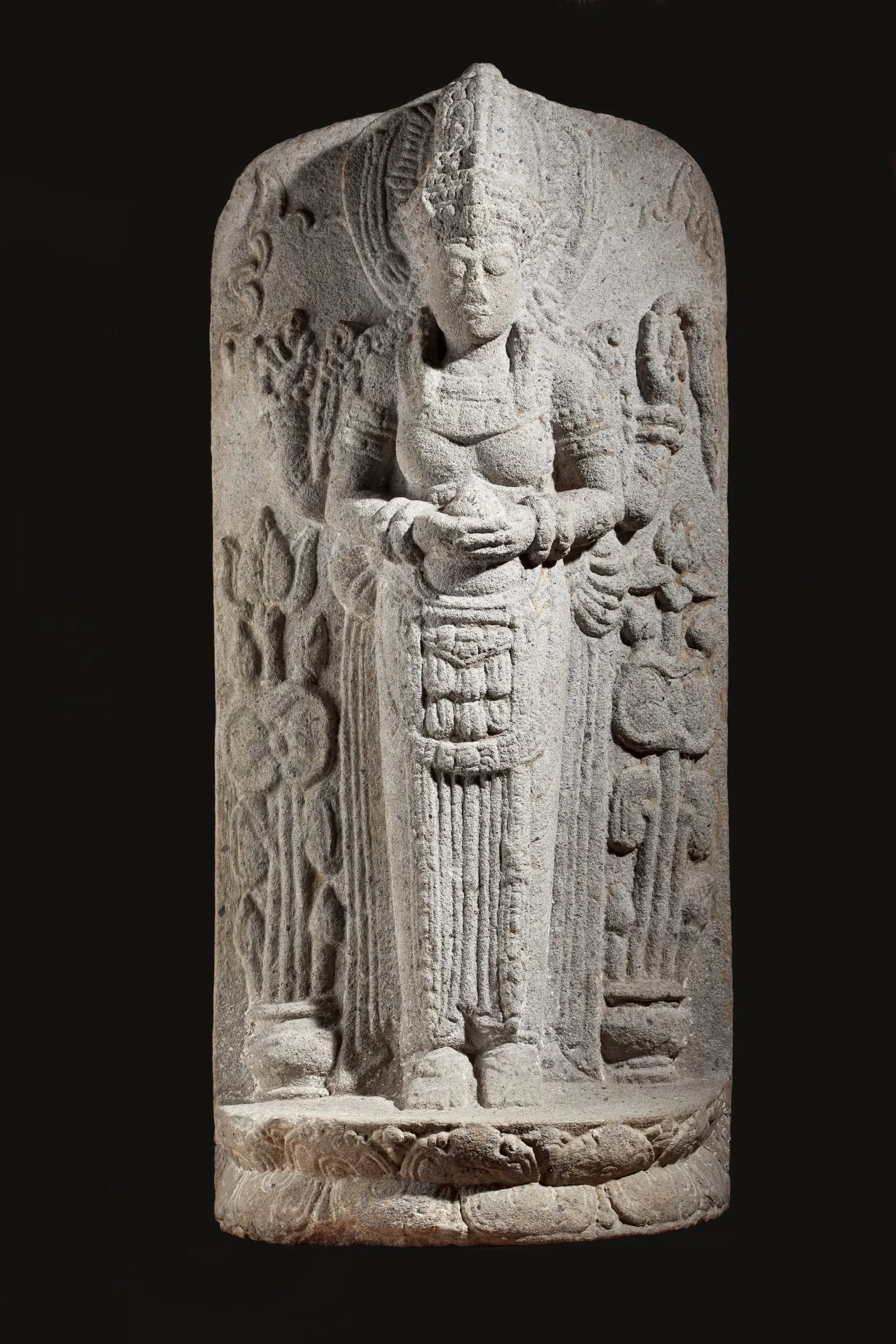 "This Javanese sculpture is a deification image that represents Supreme Divinity. It dates to the fourteenth–fifteenth century and comes from Eastern Java. The formula for this image type developed during the Majapahit period (1293–1519) and was used for both males and females. Characteristics include the lotuses that grow out of pots on each side of the figure, the flying ribbons of the headdress, the downturned eyes, and the way the body disappears under the thick clothing and heavy decoration. The figures are meant to represent an abstracted supreme knowledge and deification that was initially open only to royalty but was increasingly expanded to include everyone. The depictions had both Hindu and Buddhist qualities, and this figure holds prayer beads and a fly whisk in her upper hands, attributes primarily associated with Shiva.