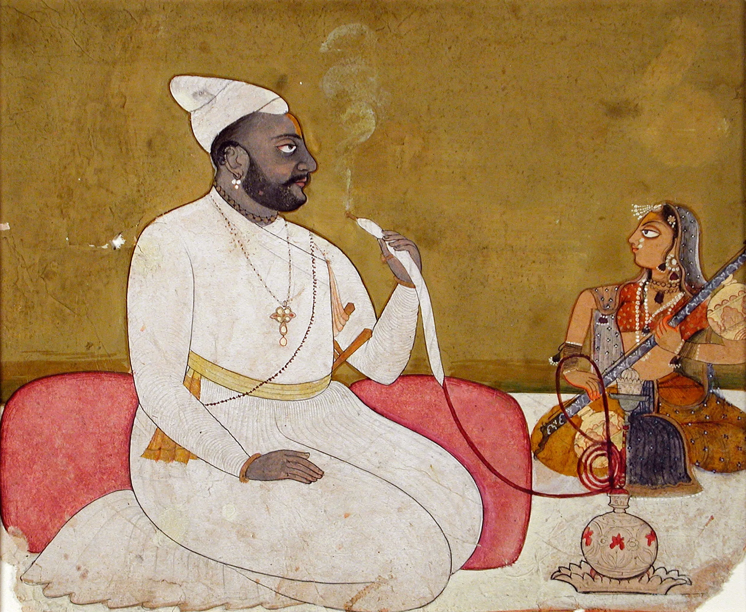 Although the subject of this portrait is not identified by an accompanying inscription, he is presumably a prince or nobleman from the Pahari court of Basohli, Himachal Pradesh, as he is wearing a pearl necklace with the idiosyncratic quatrefoil-shaped pendant worn by Basohli royalty for regal identification and proclamatory purposes (see also M.83.105.8). The absence of turban jewels in his headwear indicates that he is not a raja. He has Vaishnava sectarian markings on his forehead. He wears a gold choker and a long bead chain across the left shoulder of his white coat (jama). A punch dagger (katar) is tucked into the waist sash on his left side (see also M.74.101a-b). He is smoking a hookah decorated with cartouches inset with enameled red lilies. Atypically, a plume of smoke is depicted issuing from the mouthpiece (mukhnal) of the hookah tube (see also M.83.26.1and M.86.340). The hookah is supported by a tray with a raised crenulated rim adorned with flame-like designs (see also M.73.5.160). Beside him a female musician plays a northern Indian rudra vina (a stick zither with two resonator gourds). Portraits such as this formulaic representation conveyed the sitter’s wealth and social status by showing them enjoying music and other pleasures at court.