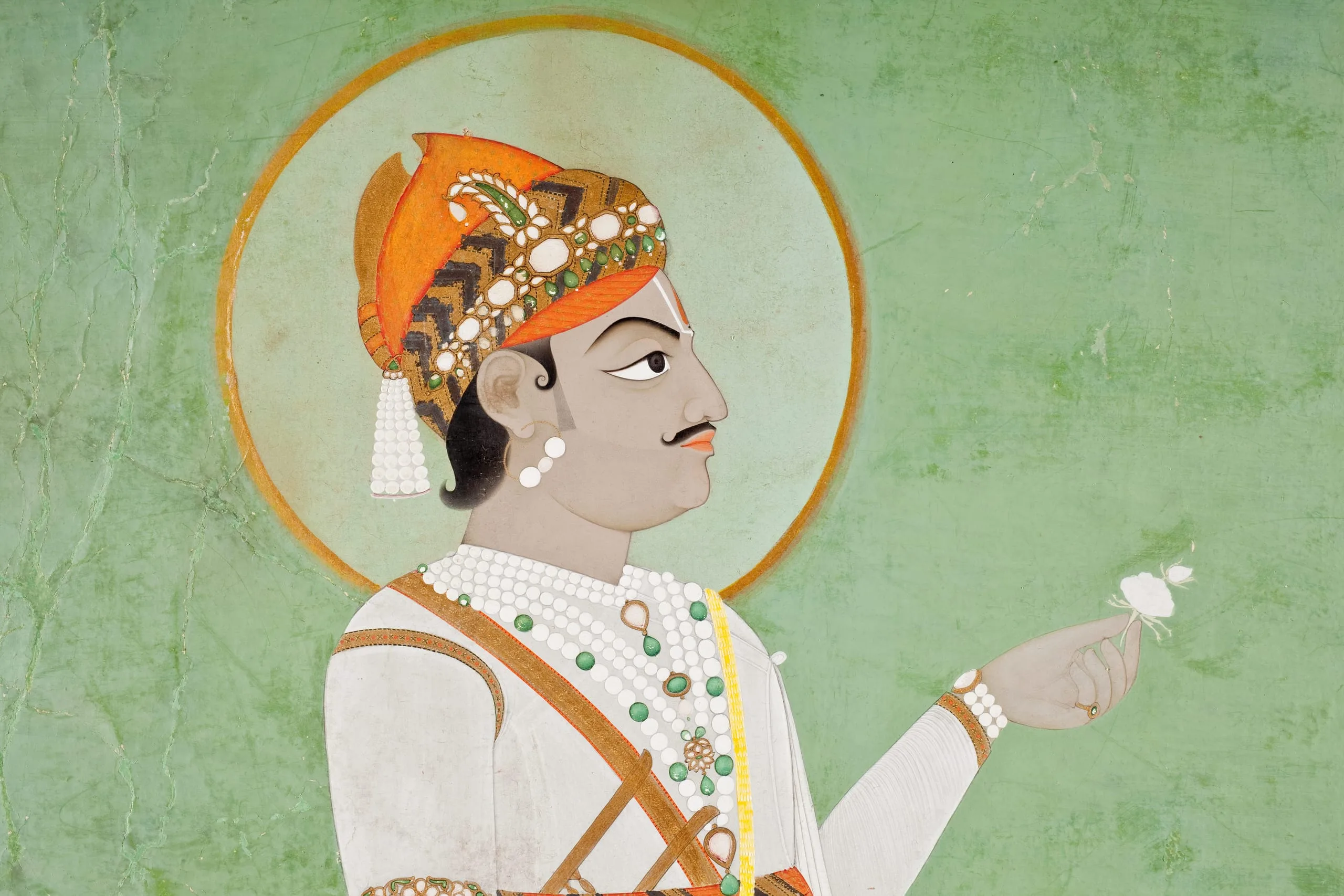 Maharaja Pratap Singh of Jaipur (r. 1778-1803) was born in 1764 and died in 1803. Jaipur was founded in 1727 by Maharaja Sawai Jai Singh II (r. 1699-1743). Previously, the dynasty of Kachwaha Rajputs had ruled from the nearby Amber Fort, which had been established in 1128. In 1562, Raja Bharmal (r. 1498-1574) accepted Mughal suzerainty under Emperor Akbar (r. 1556-1605) and entered into a strong military and matrimonial alliance. As the Mughal Empire declined in the 18th century, Jaipur was weakened by internal and external conflicts. By the reign of Pratap Singh, the Marathas of the Deccan had invaded much of Rajasthan and were exacting tribute from the princely kingdoms. In 1787, Pratap Singh joined a Rajput confederacy to defeat the Marathas led by Maharaja Mahadaji Shinde (or Mahadi Sindhia, r. 1768-1794). Pratap Singh was a great patron of the arts, as well as a composer, musician, and poet under the pen name of Brijnidhi. In 1799, Pratap Singh commissioned and had built the renowned Hawa Mahal (Palace of the Winds), which was designed by Lal Chand Ustad. This portrait of Pratap Singh by the leading Jaipur artist Sahib Ram (active circa 1750-1820) has a devanagari inscription on the top border identifying the subject as “Sawai Pratap Singhji.” He carries a white rose as a symbol of cultural refinement. Comparable portraits of Pratap Singh are in the Victoria and Albert Museum, London (IS.223-1952) and British Museum, London (1920,0917,0.238).