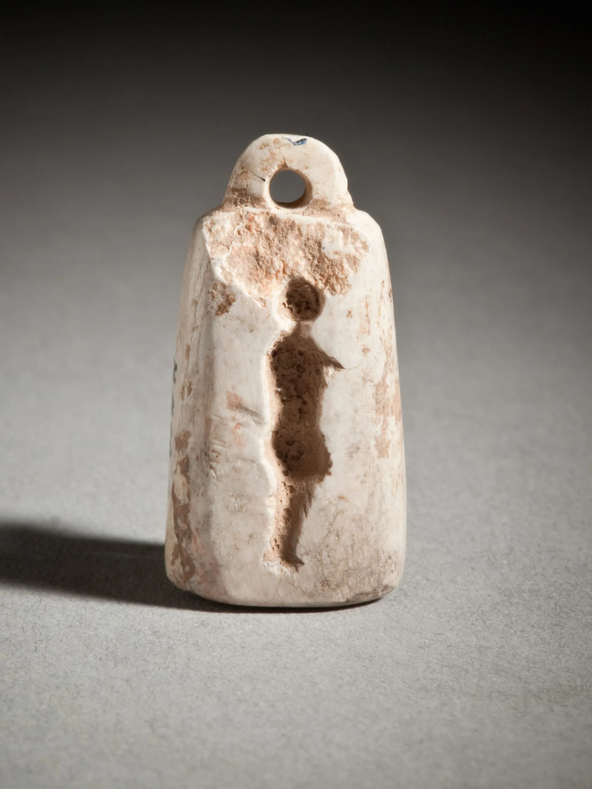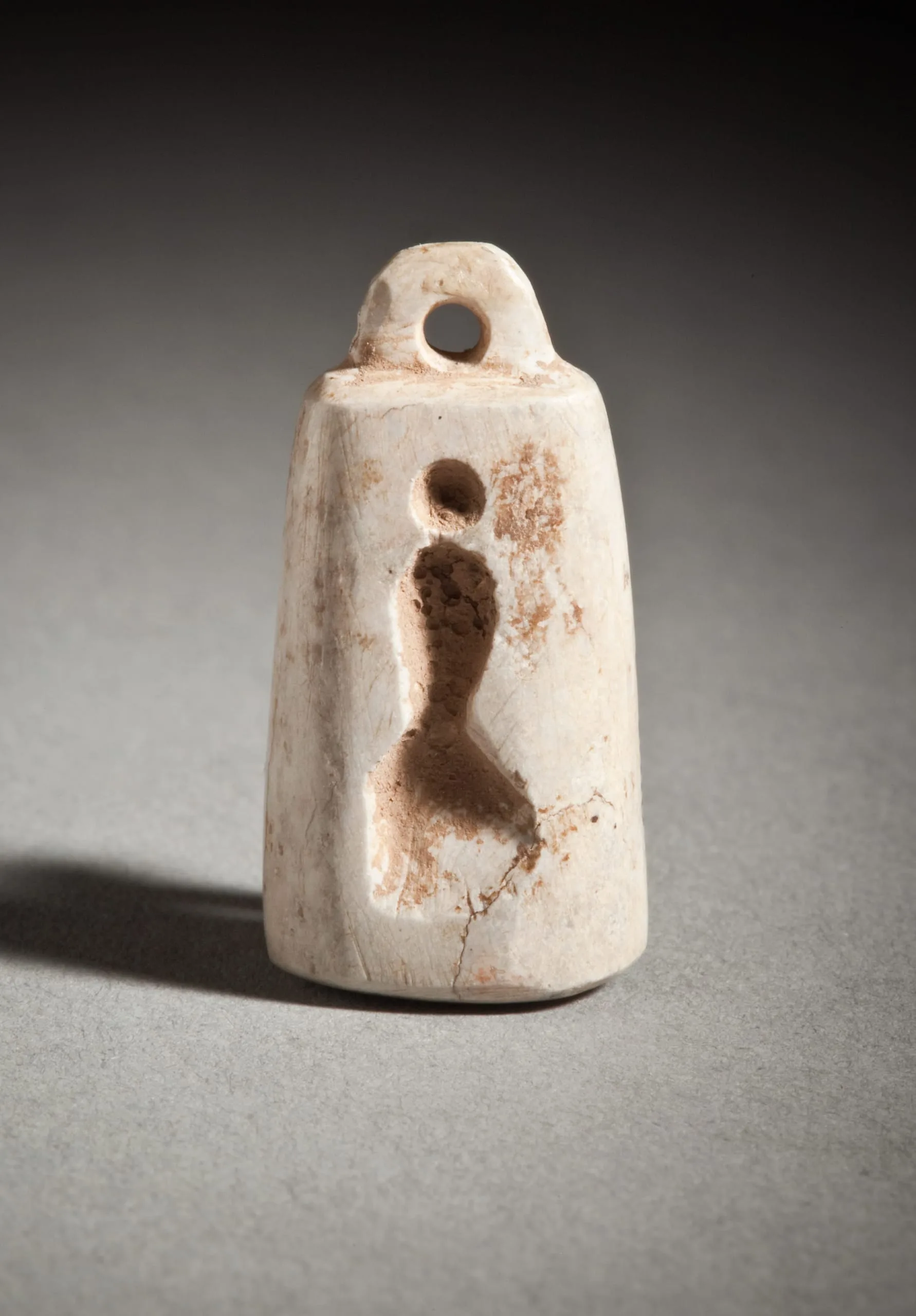 Small cream-colored ceramic or stone bell-shaped object with a loop handle and a shallow relief-carved abstracted human figure on the front face, with rust-brown surface discoloration