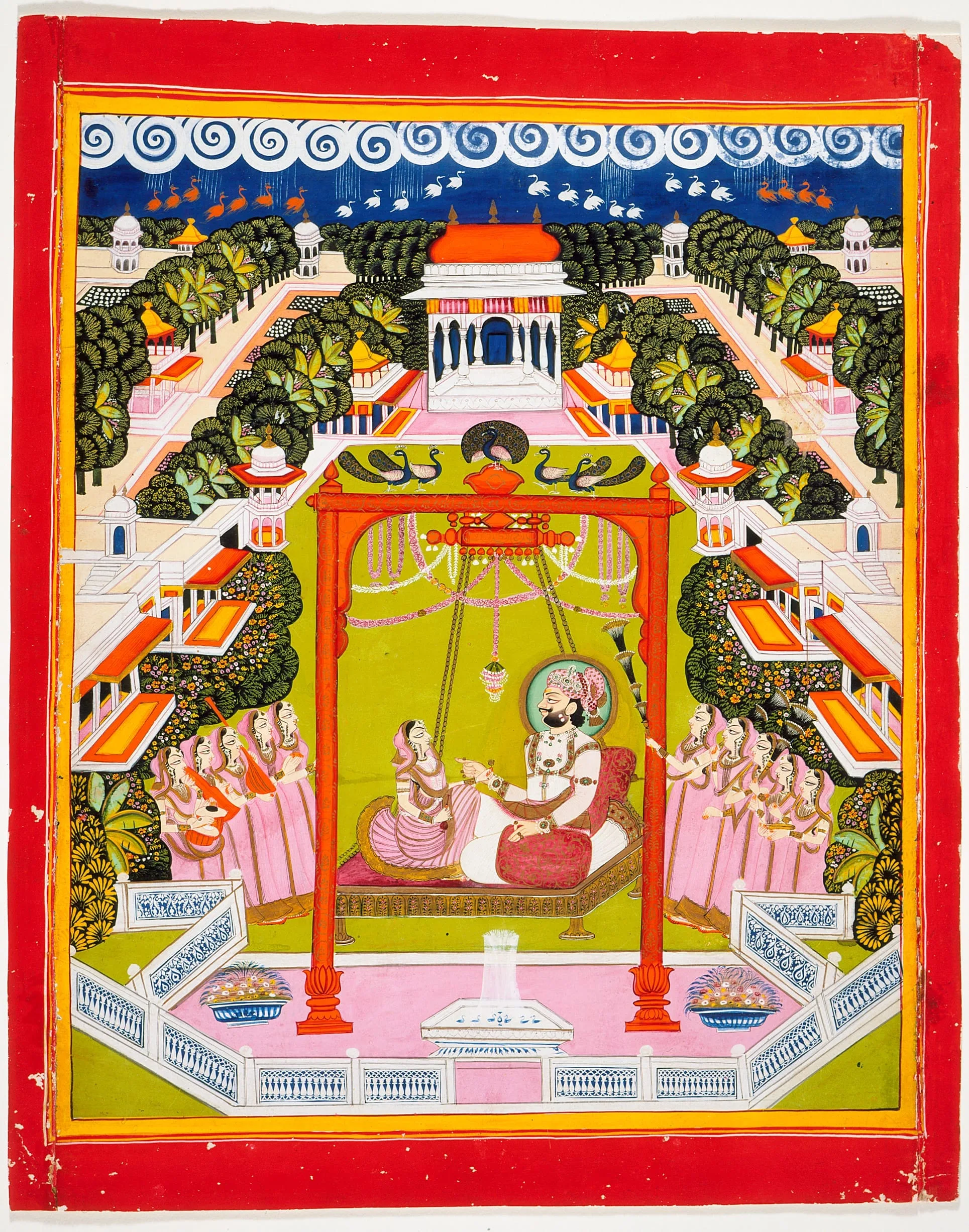 Takhat Singh II is portrayed here on a swing in a palace garden with a group of women celebrating the Teej monsoon festival held in the Hindu month of Shravana (July-August) to commemorate the onset of the monsoons and to honor the marriage of Shiva and Parvati. The rainy season is indicated by the scrolling cumulus clouds with raindrops falling on the red and white herons flying in formation and by the peacocks dancing on top of the swing’s crossbar. The used of linear perspective to render the lush garden was adopted from Western artistic traditions. A Hindi inscription on the reverse identifies the subject as Takhat Singh [II] wearing a white garment and gives the artist’s name, Dana (active circa 1810-1850).