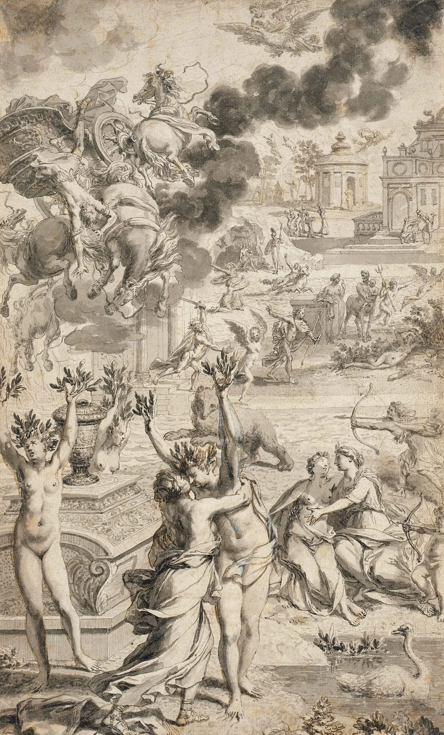 - Gray and brown ink and wash, heightened with white, over blind stylus